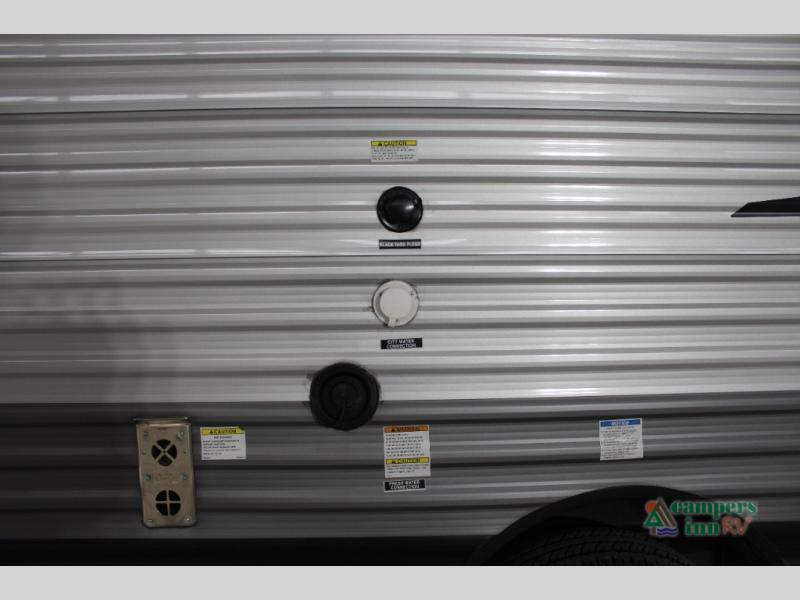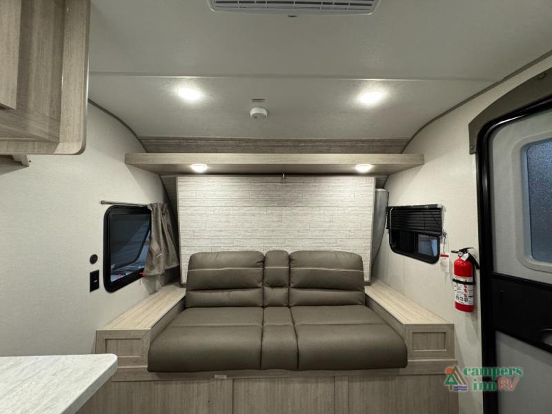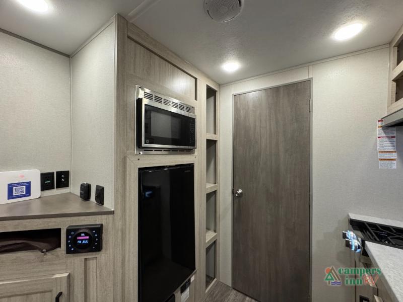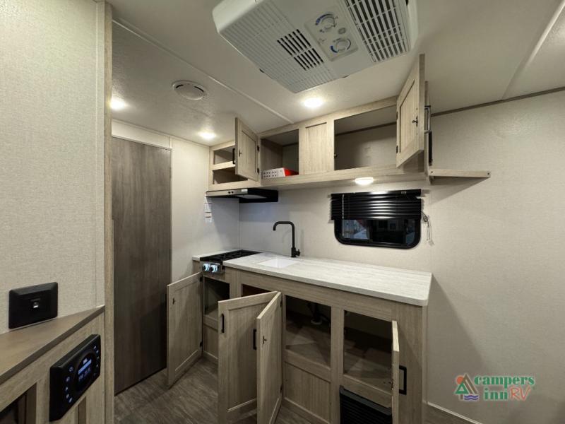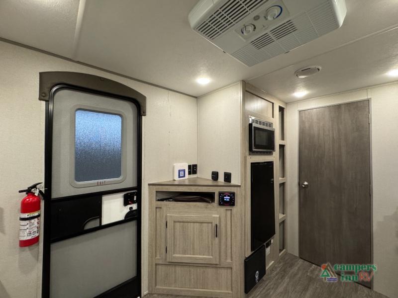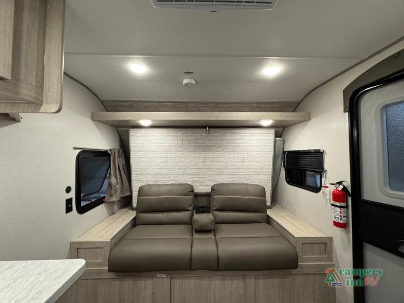 This value price point Aurora Light allows you versatility as you camp! You can sleep comfortably each night on the Murphy bed up front, then fold it away in the morning to relax on the sofa. There are dual nightstands for your things, plus overhead storage. This Aurora kitchen includes a 12V 3.3 cu. ft. refrigerator, a two burner cooktop, plus a microwave oven to easily make meals each day, and the full rear bath will come in handy after a day at the lake. After dinner, relax on the sofa, or head outdoors to relax under the 10' awning!