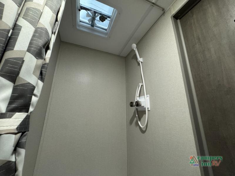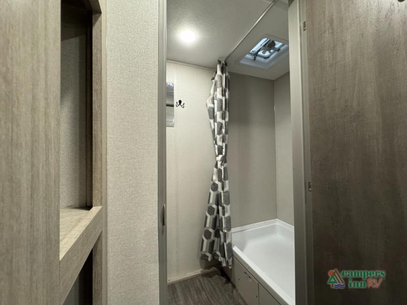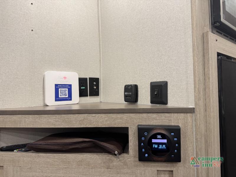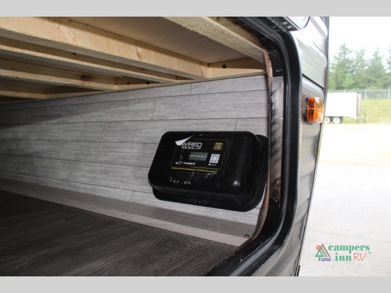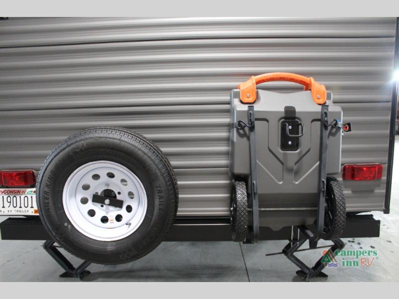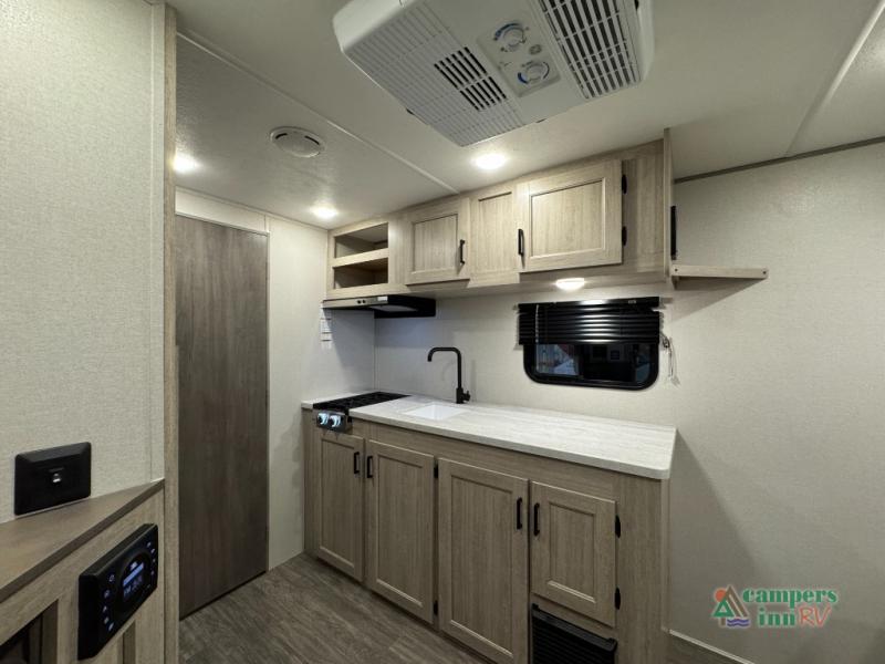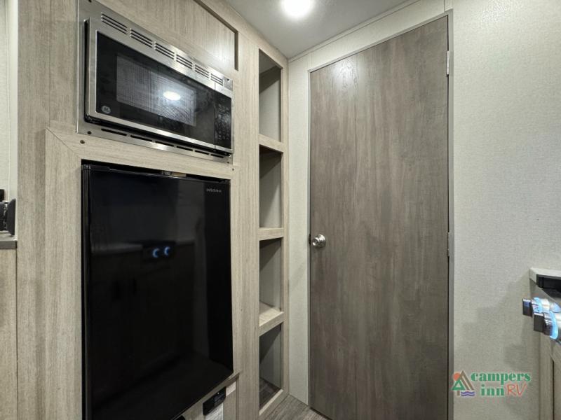 This value price point Aurora Light allows you versatility as you camp! You can sleep comfortably each night on the Murphy bed up front, then fold it away in the morning to relax on the sofa. There are dual nightstands for your things, plus overhead storage. This Aurora kitchen includes a 12V 3.3 cu. ft. refrigerator, a two burner cooktop, plus a microwave oven to easily make meals each day, and the full rear bath will come in handy after a day at the lake. After dinner, relax on the sofa, or head outdoors to relax under the 10' awning!
