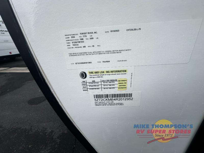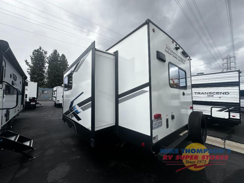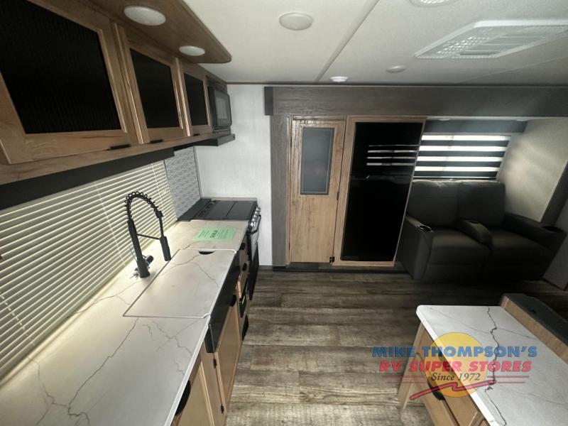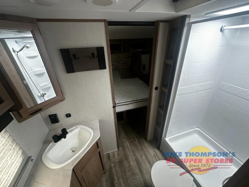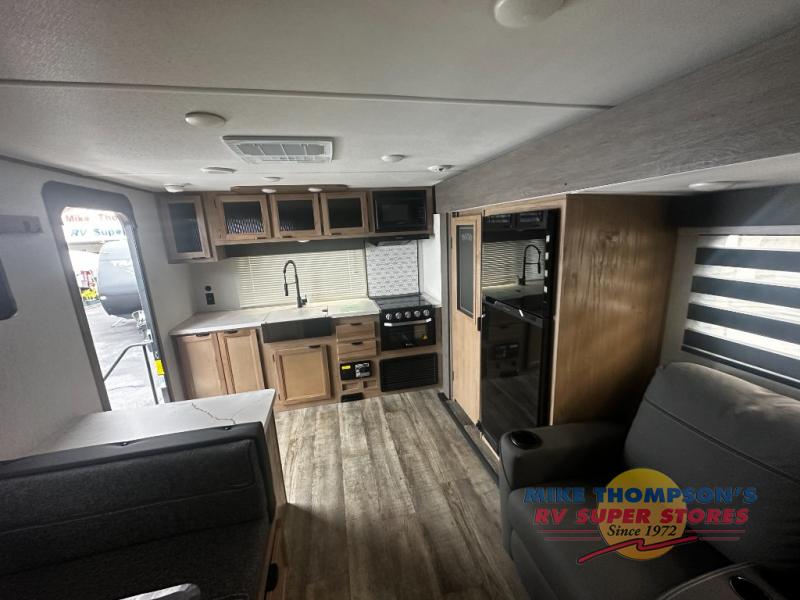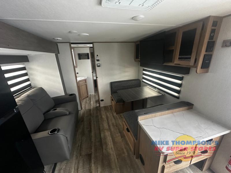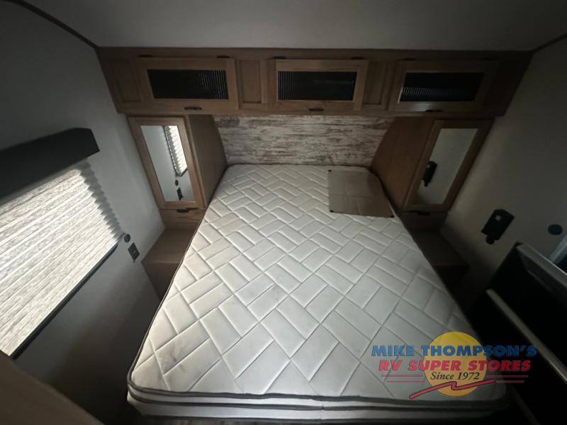 You and your spouse will have a comfortable time camping in this travel trailer! The front private bedroom has a queen bed with wardrobes on either side of it, plus one of the dual entry doors to the unit. As you leave the bedroom, you will enter the walk-through bathroom which has a shower with a skylight above and a removable clothes hanging rod to dry off your swimsuit after swimming in the lake. The chef can prepare their best home cooked meals in the rear kitchen, and you can enjoy them at the booth dinette before storing any leftovers in the 12V refrigerator. The theater seating has cupholders so you can enjoy a beverage while you read your favorite book!