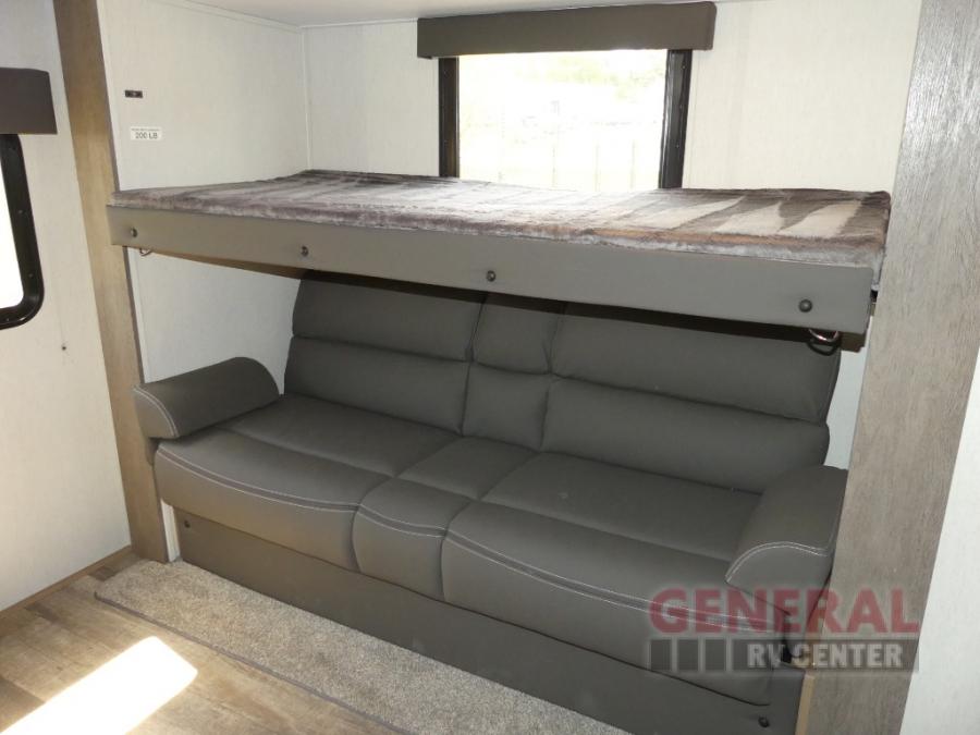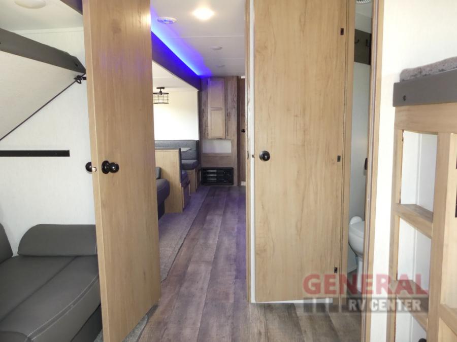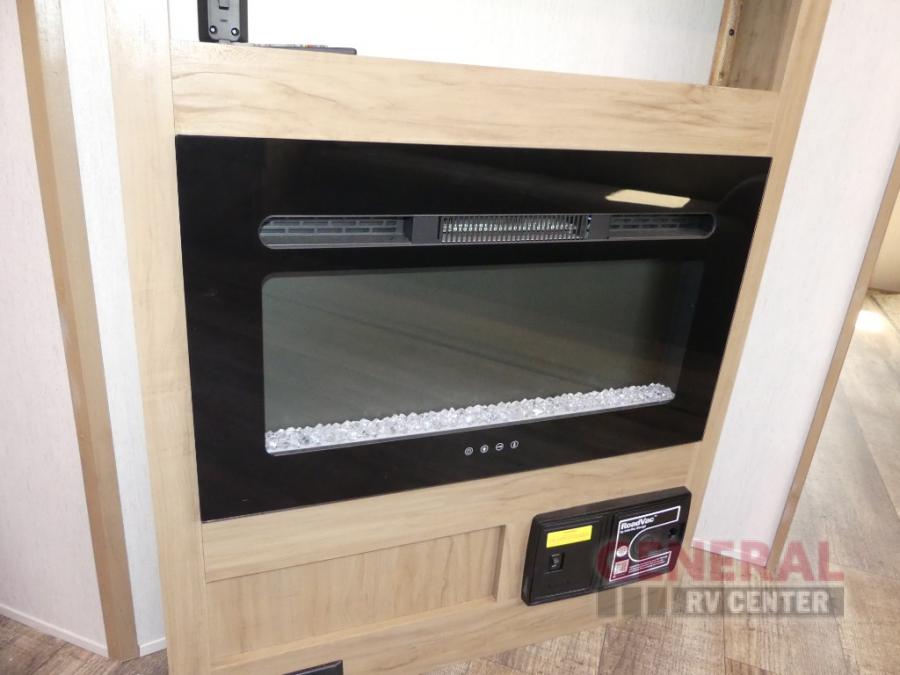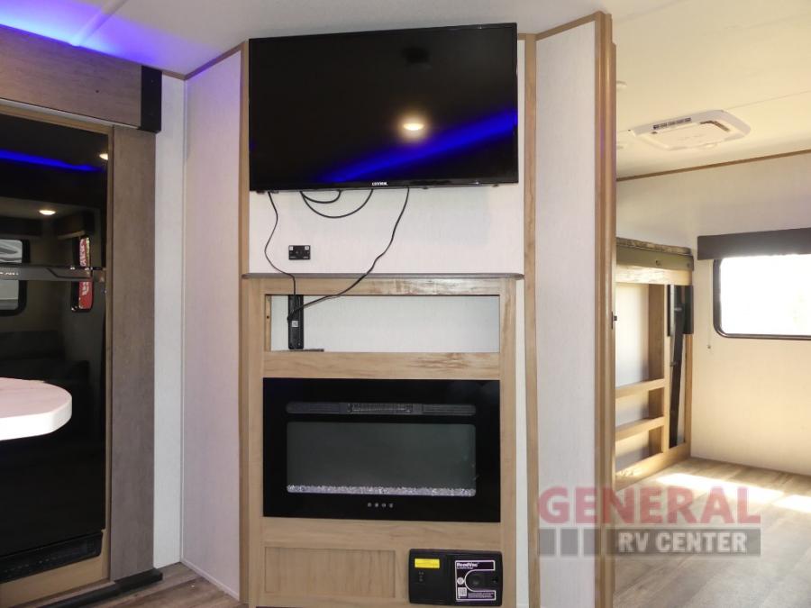 Load up your clothes, food, and outdoor gear to enjoy a long weekend away from the city in this travel trailer! There are triple slide outs, a private bunkhouse with a half bathroom with a second exterior entry/door for convenience, plus an outside kitchen with ice even. The bunkhouse also has two bunks, a jackknife sofa, a slide out for more interior floor space, plus storage. The main living and kitchen area is spacious as well with two opposing slides, a kitchen island with a farm-style sink, a pantry, plus a cozy fireplace. The full walk-through bathroom allows double access, and the front bedroom allows you to sleep like royalty.