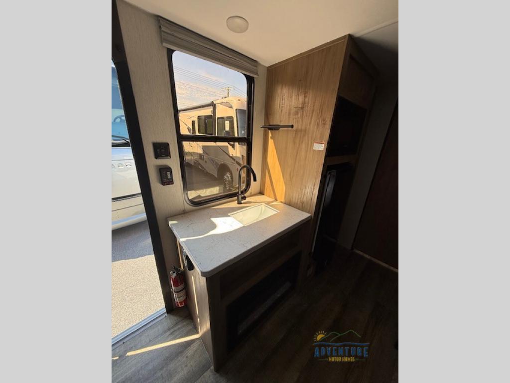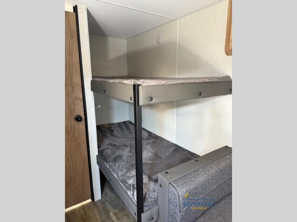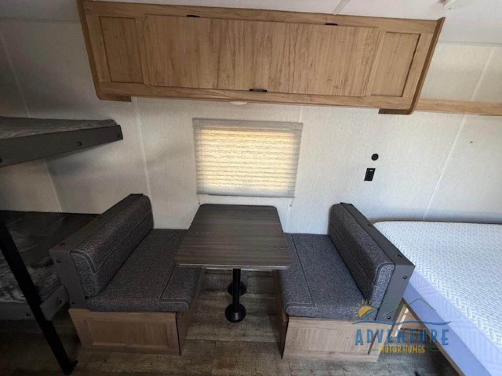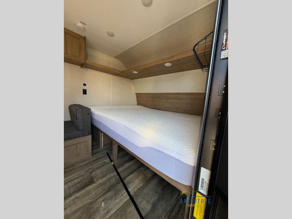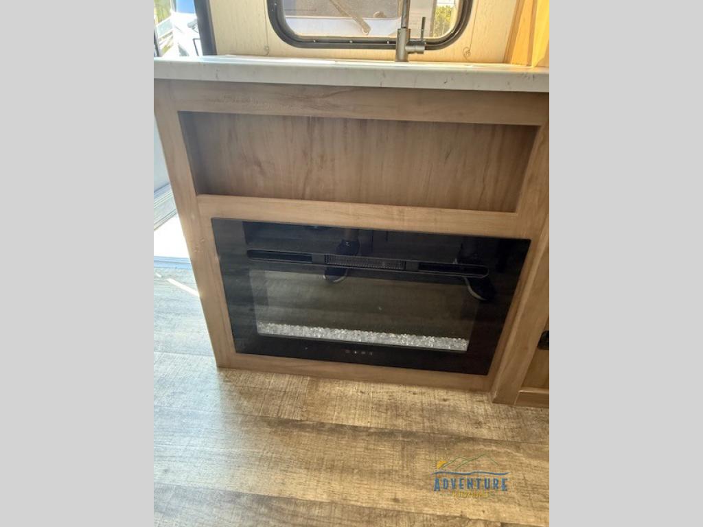 Enjoy family adventures in this all-electric bunk model which features sleeping for four or six depending on size with a queen bed up front, oversized bunks in the rear roadside corner, and you could even convert the booth dinette to sleep more. Inside, you will find ample storage with overhead cabinets and a large shelf above the queen bed, plus four shelves next to the refrigerator and microwave/air fryer that feature decorative storage bins for your things. Use this space for pantry items, towels, or clothing storage. There is even a 5,000 BTU electric fireplace below the counter and sink to bring you a bit of heat on those chilly nights, and you will find TV prep both inside and out if you wish to add TVs for more entertainment. On the outside, you will also find a 12' awning and plenty of outside storage for your camping gear, plus more!