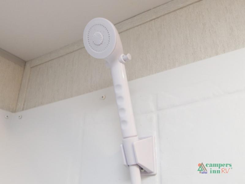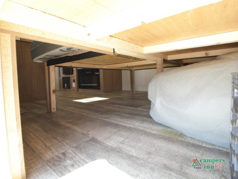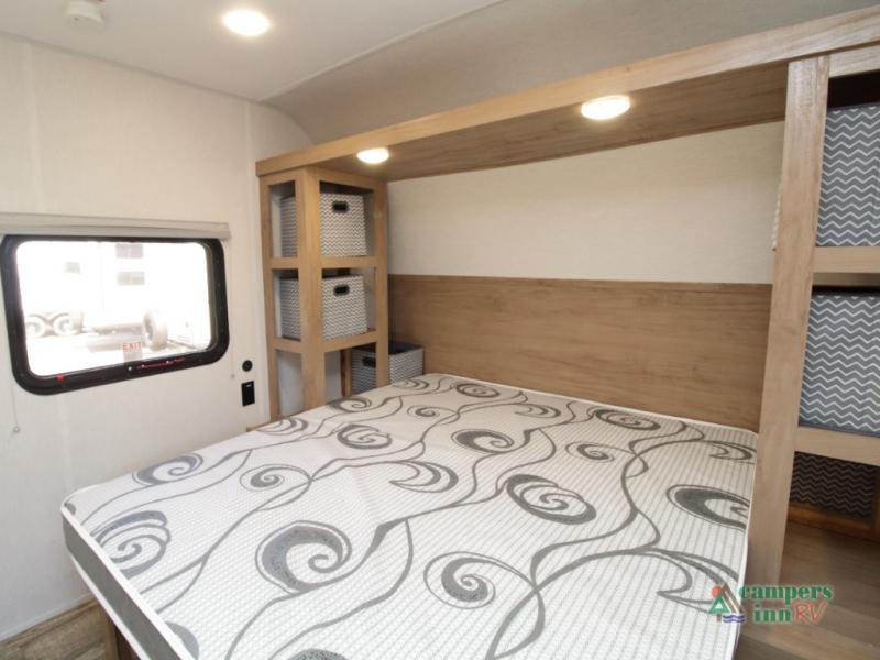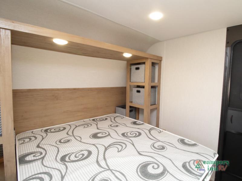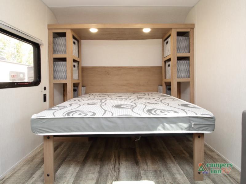 Front Walk-Around Queen Bed with dual storage drawers and an overhead shelf for books and gear.