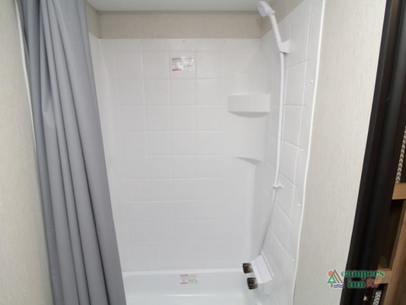 Full Rear Bath with tub/shower combo and a closet with shelves for towels and toiletries.