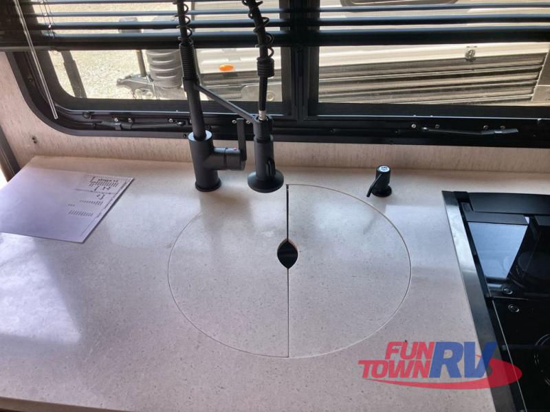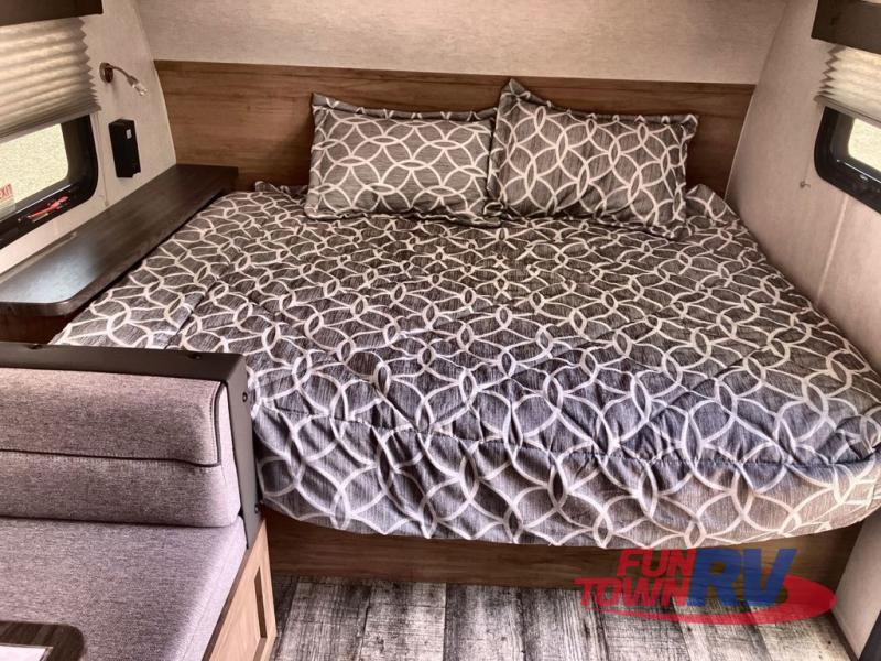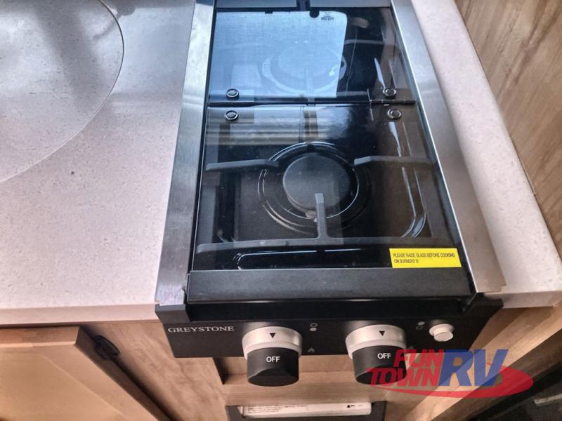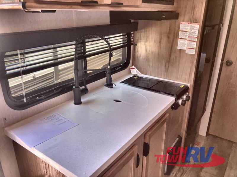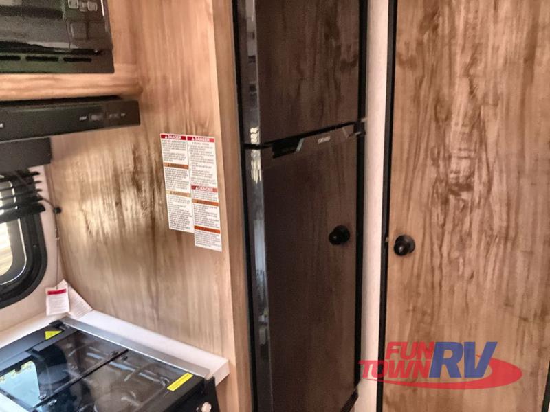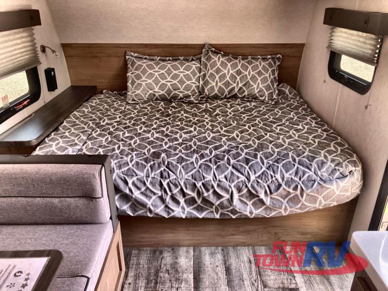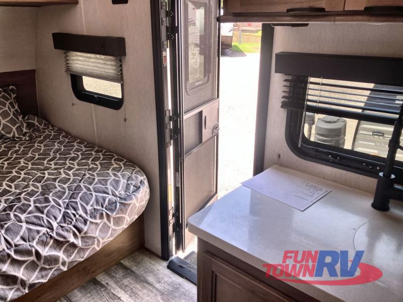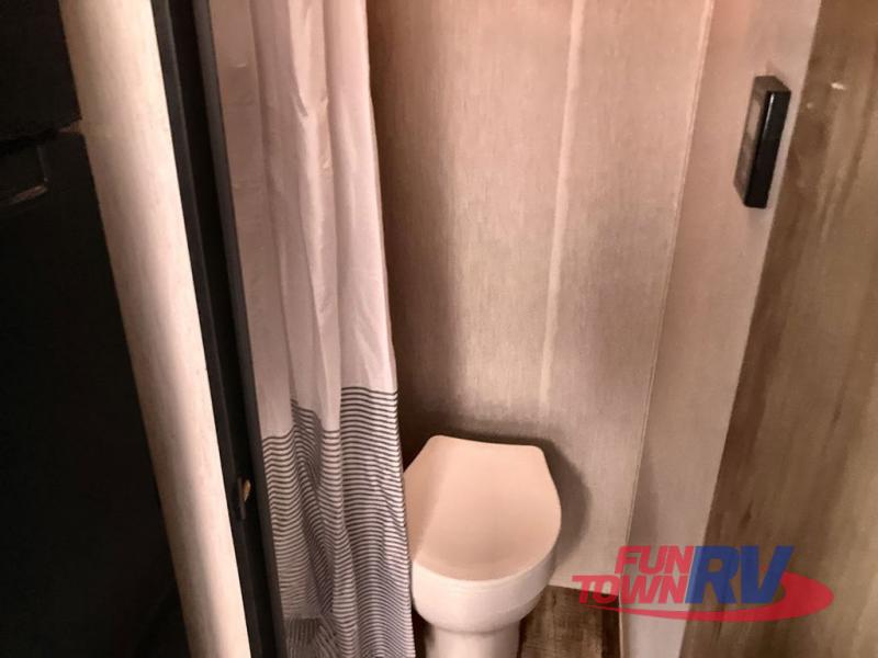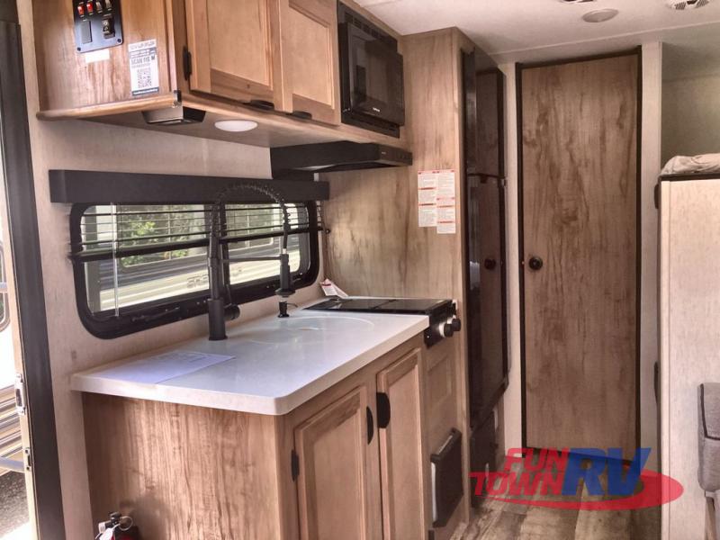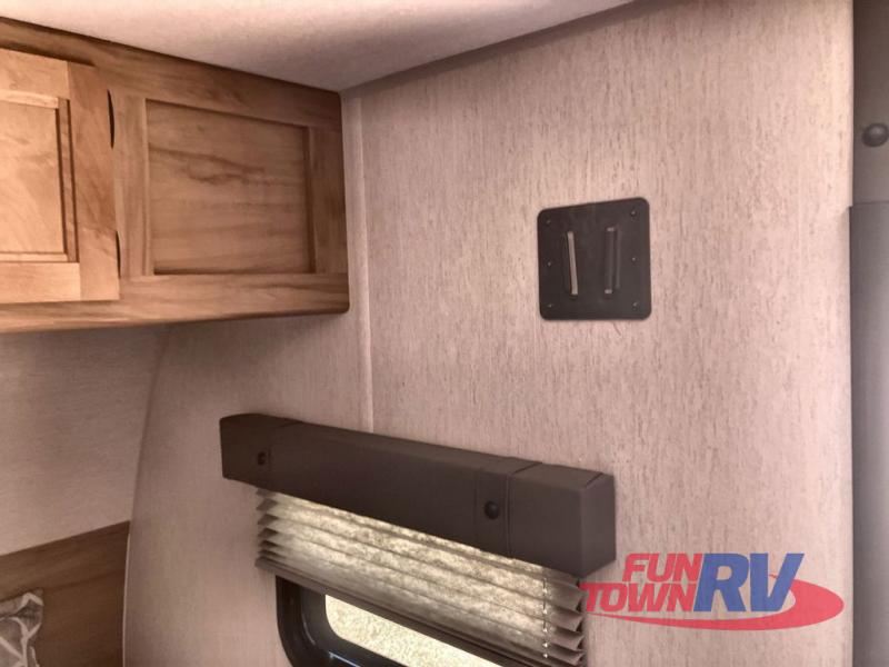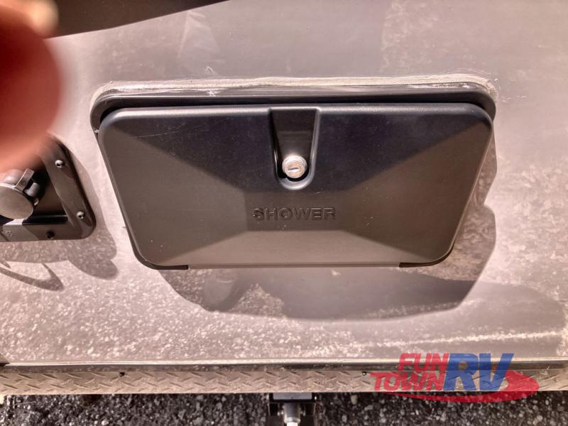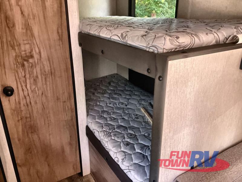 The whole family can sleep comfortably in this travel trailer! It has a set of bunk beds for the kids or guests to sleep on, and you can sleep comfortably on the front queen bed with overhead cabinets and a shelf. There is even an exterior storage plus door that accesses the storage space under the bottom bunk. The chef will enjoy preparing their best home cooked meals either indoors with the high output cooktop or at the outside mini kitchen while staying protected by the 12' power awning!