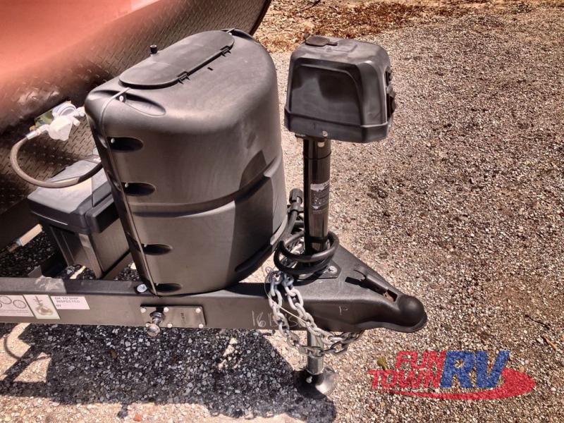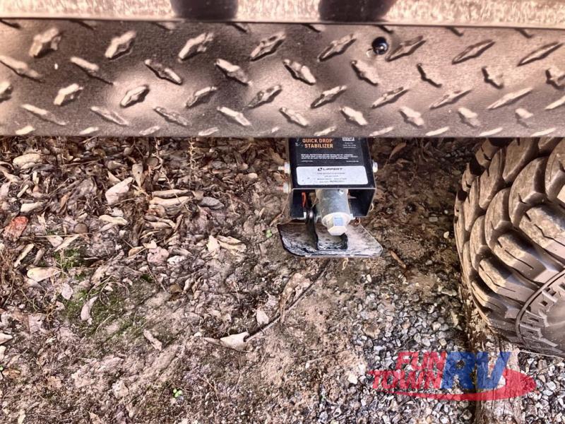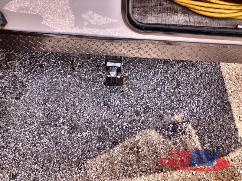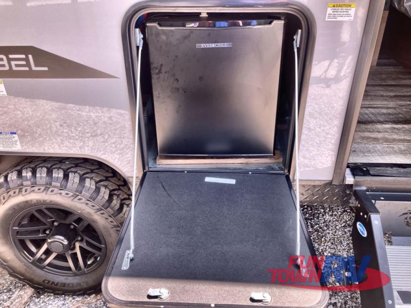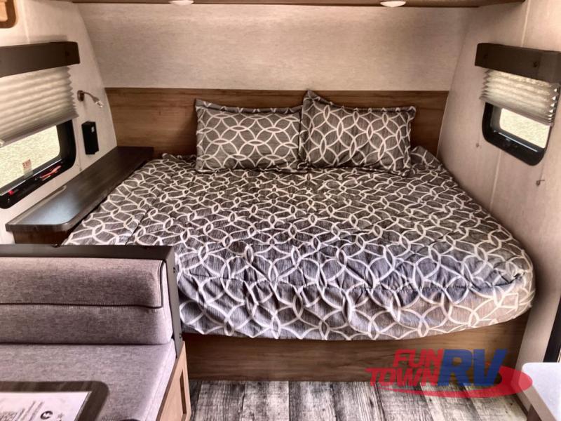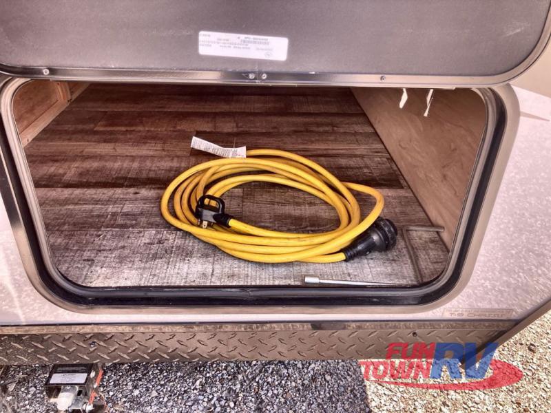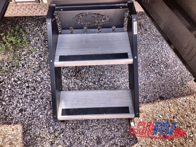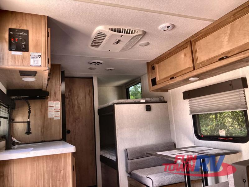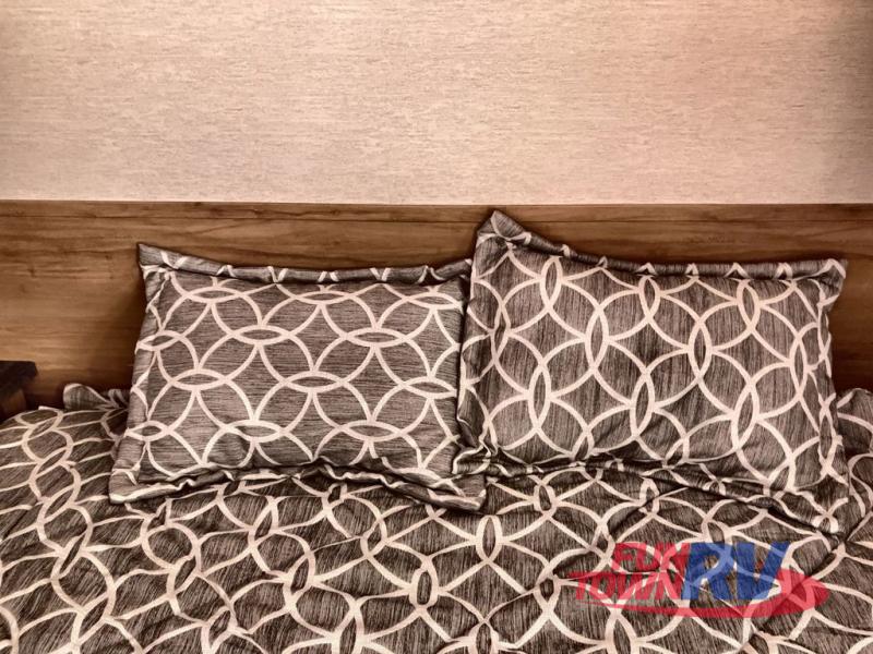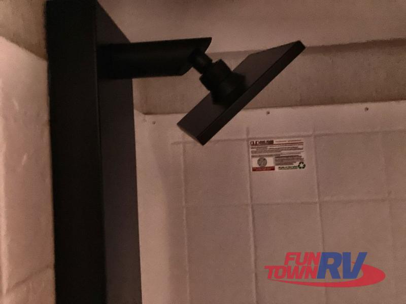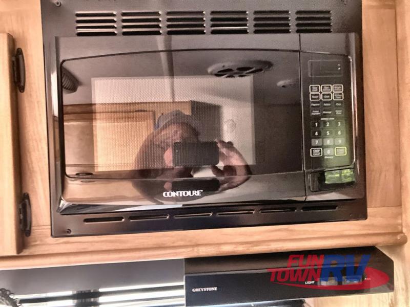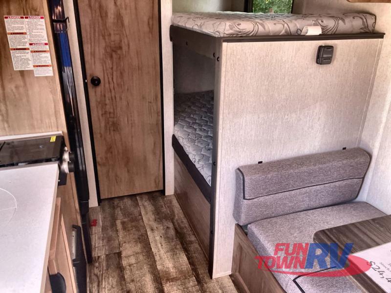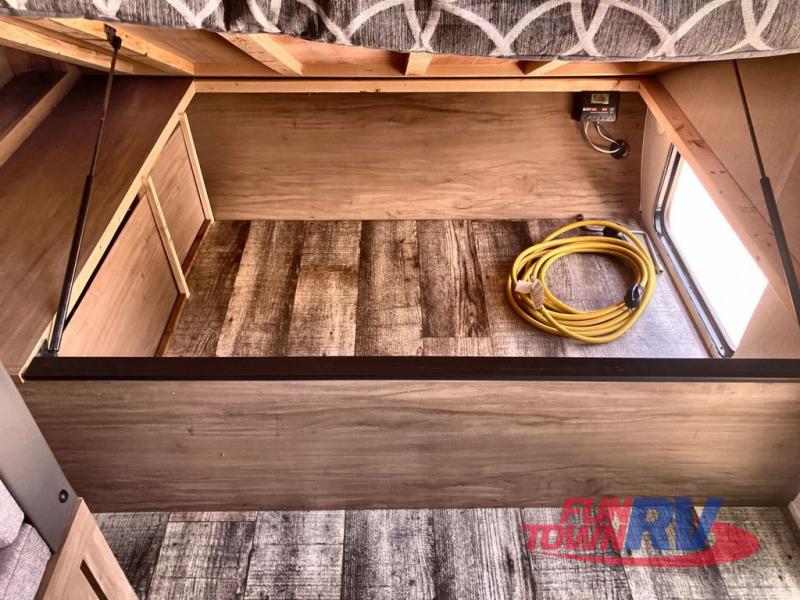 The whole family can sleep comfortably in this travel trailer! It has a set of bunk beds for the kids or guests to sleep on, and you can sleep comfortably on the front queen bed with overhead cabinets and a shelf. There is even an exterior storage plus door that accesses the storage space under the bottom bunk. The chef will enjoy preparing their best home cooked meals either indoors with the high output cooktop or at the outside mini kitchen while staying protected by the 12' power awning!