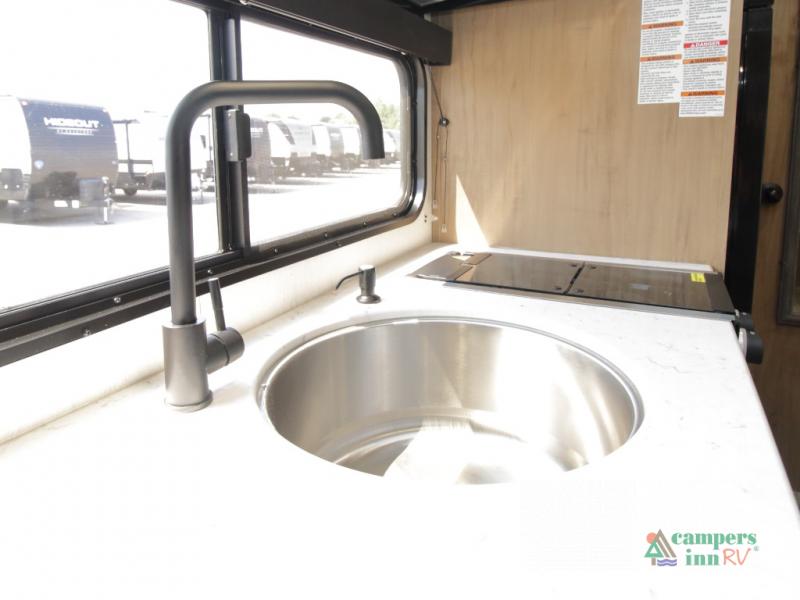The Cherokee Wolf Pup 16BHSW is the perfect compact travel trailer for families who love adventure. The kids will have their own space with the rear bunk beds, while you relax on the front queen bed complete with overhead cabinets and a shelf for extra storage. Mealtime is a breeze thanks to the high-output cooktop inside or the outside mini kitchen, ideal for enjoying the outdoors under the 12' power awning.