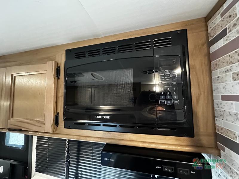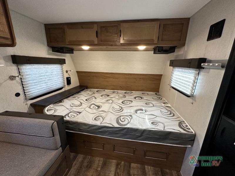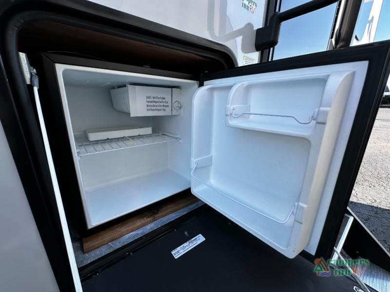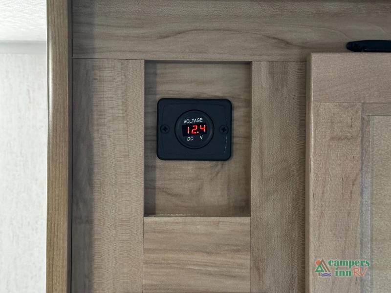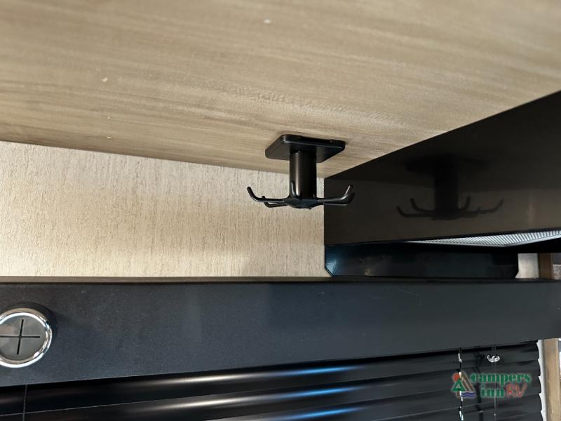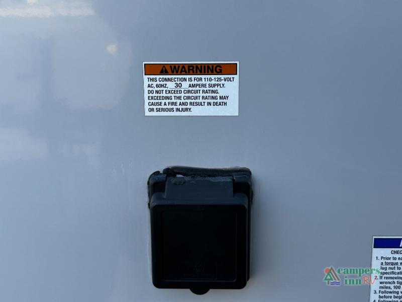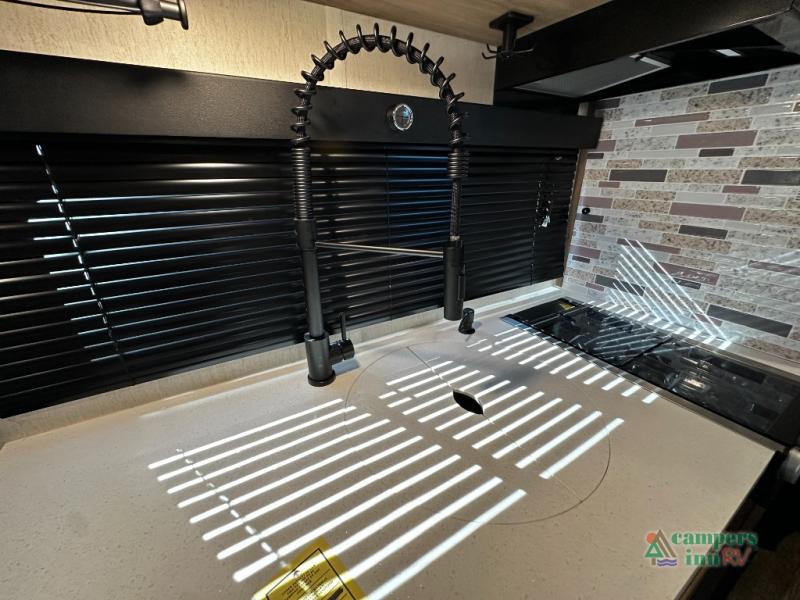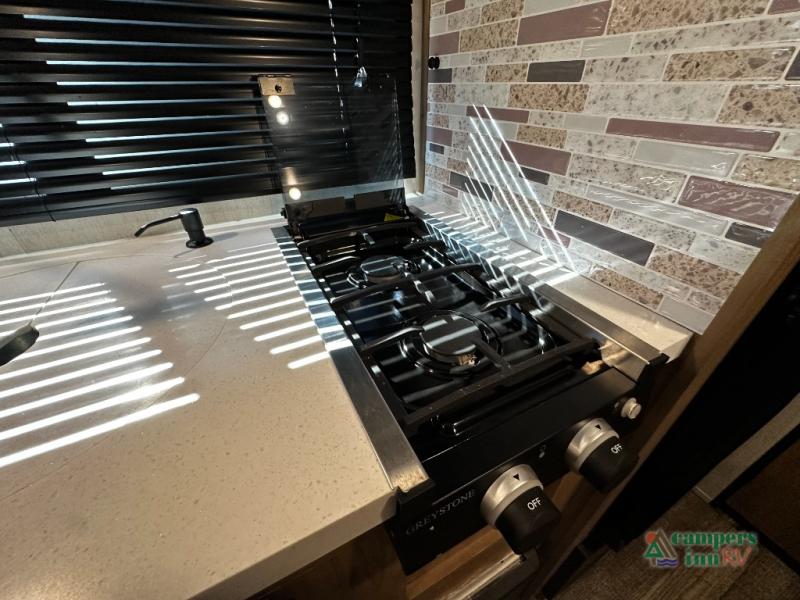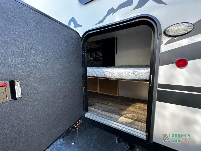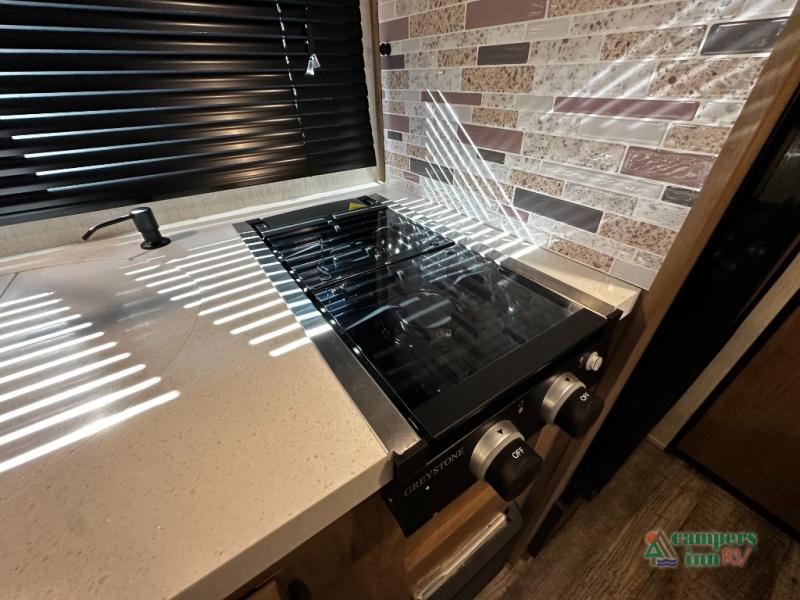 The whole family can sleep comfortably in this travel trailer! It has a set of bunk beds for the kids or guests to sleep on, and you can sleep comfortably on the front queen bed with overhead cabinets and a shelf. There is even an exterior storage plus door that accesses the storage space under the bottom bunk. The chef will enjoy preparing their best home cooked meals either indoors with the high output cooktop or at the outside mini kitchen while staying protected by the 12' power awning!