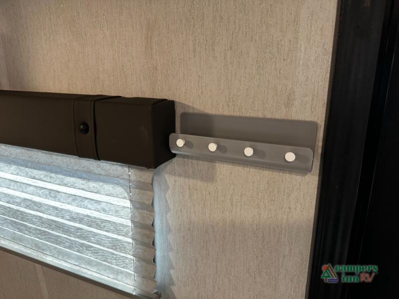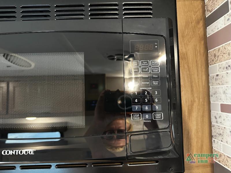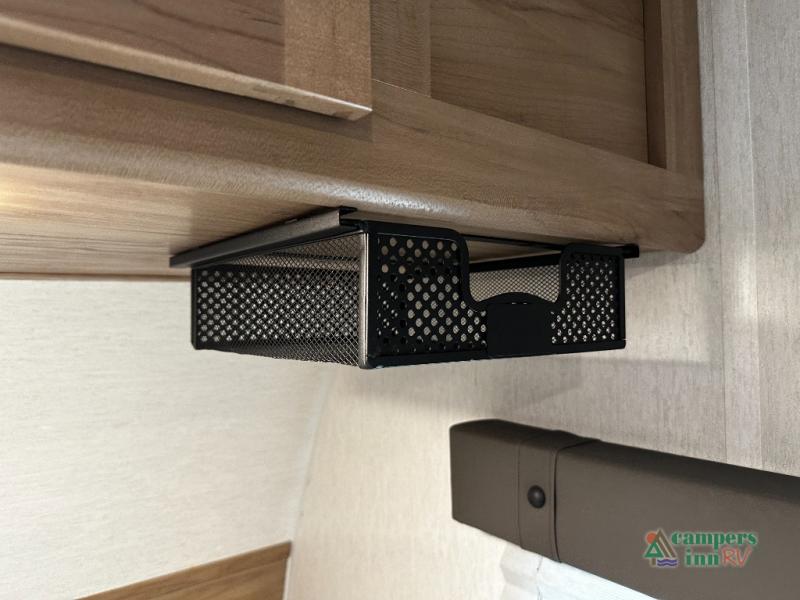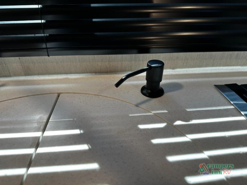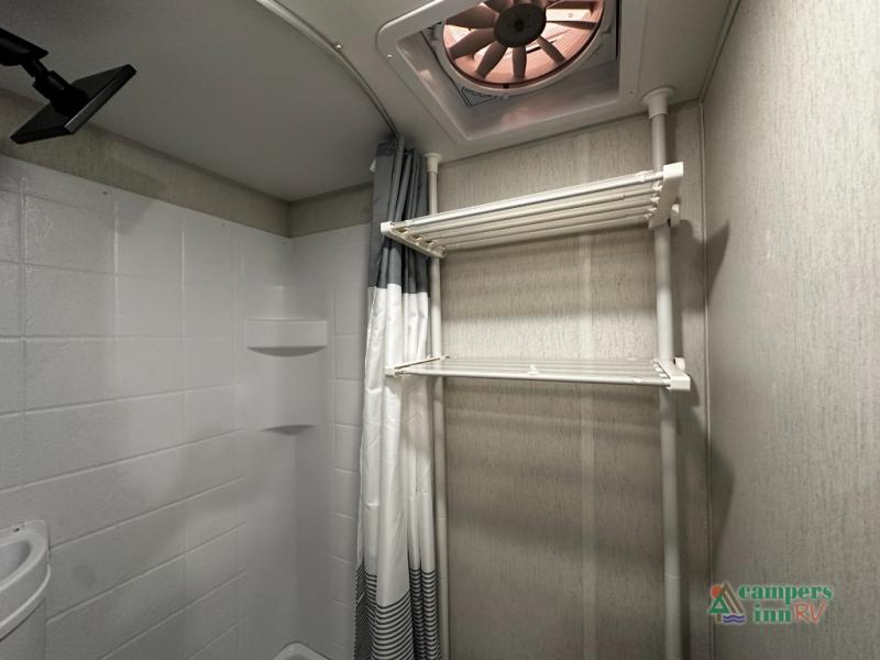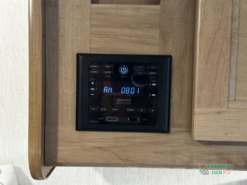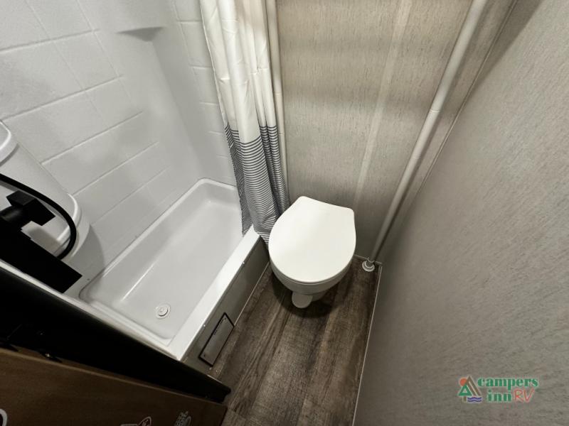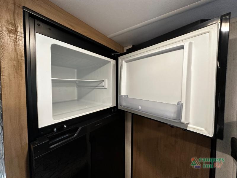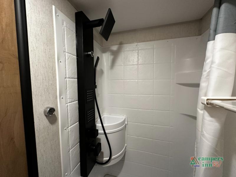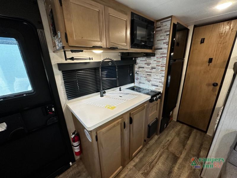 The whole family can sleep comfortably in this travel trailer! It has a set of bunk beds for the kids or guests to sleep on, and you can sleep comfortably on the front queen bed with overhead cabinets and a shelf. There is even an exterior storage plus door that accesses the storage space under the bottom bunk. The chef will enjoy preparing their best home cooked meals either indoors with the high output cooktop or at the outside mini kitchen while staying protected by the 12' power awning!
