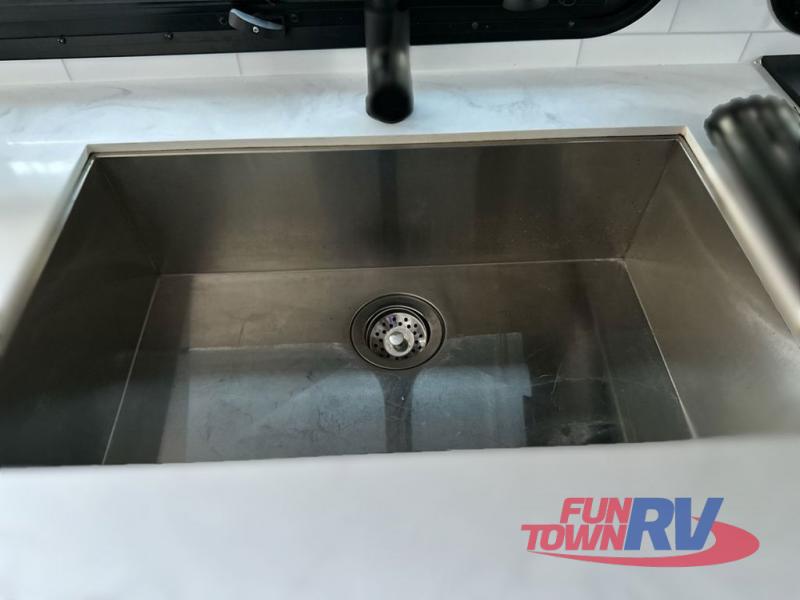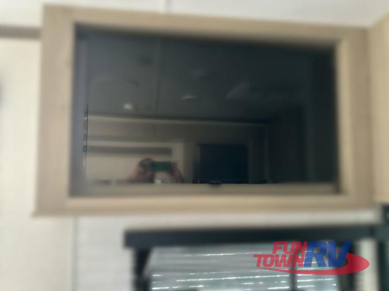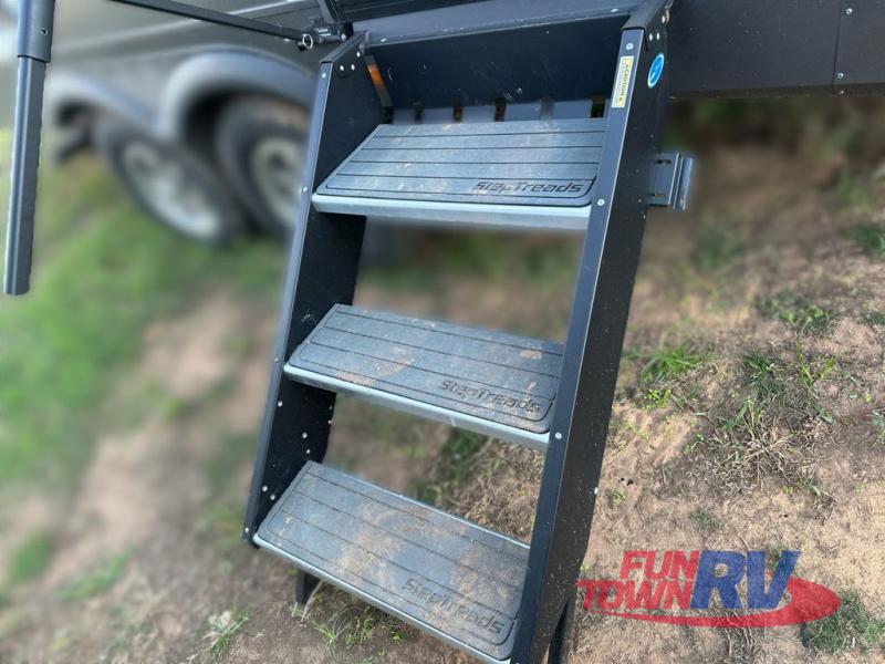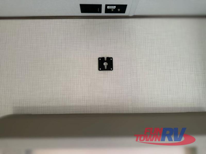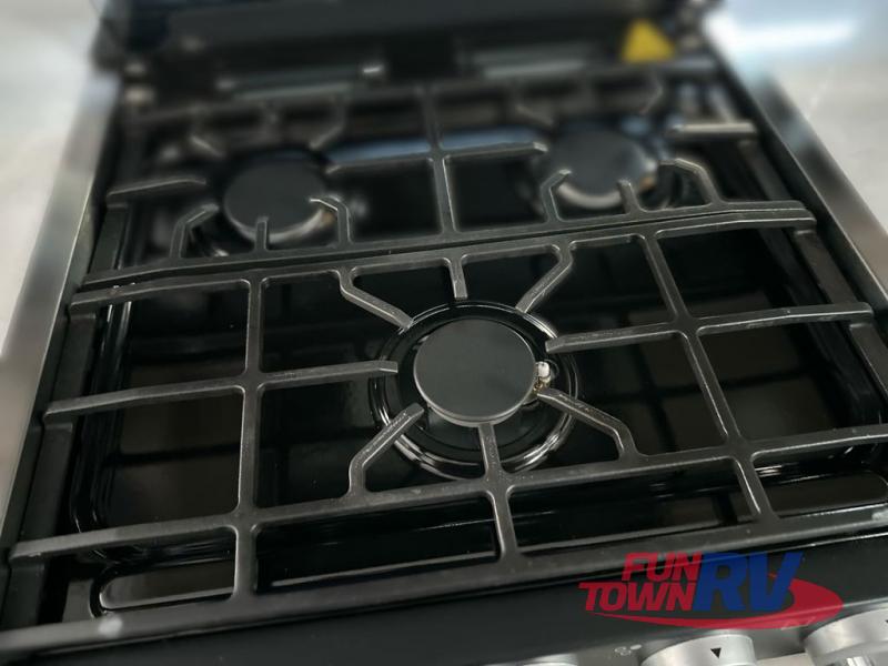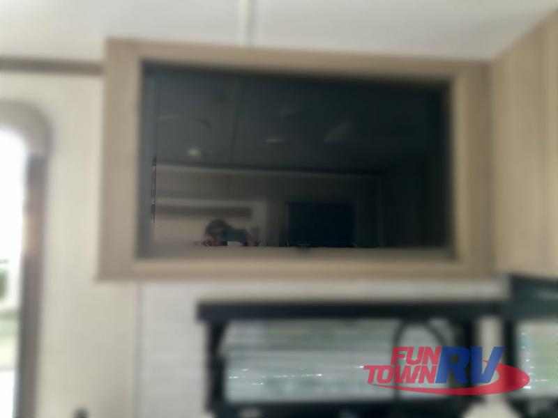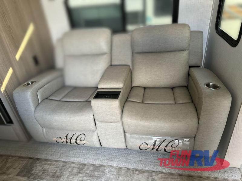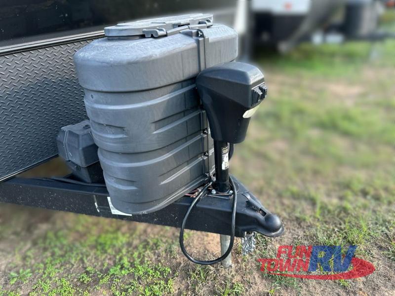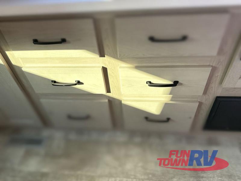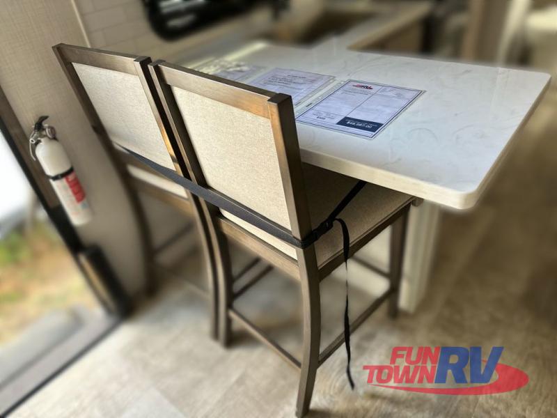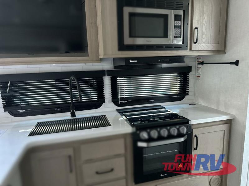 A perfect couples coach to get away featuring dual slides for added interior space. The main entry leads into a combined kitchen and living room providing an L-shaped counter with two-person bar top seating! This is a great place to enjoy your meals and morning coffee inside. Your nights will be spent in true relaxation with the 67" theater seating to watch TV, and a king bed slide in the front bedroom for a great night's rest. The full rear bathroom features a shower with a seat plus overhead skylight, and linen storage. You can also choose to cook outdoors when you have an outside kitchen and griddle, plus a 22' awning. This creates a nice outdoor living area that is perfect both day and night!
