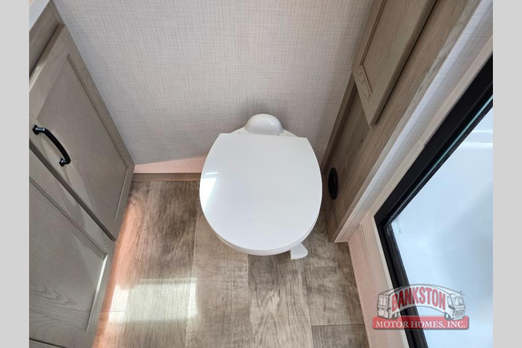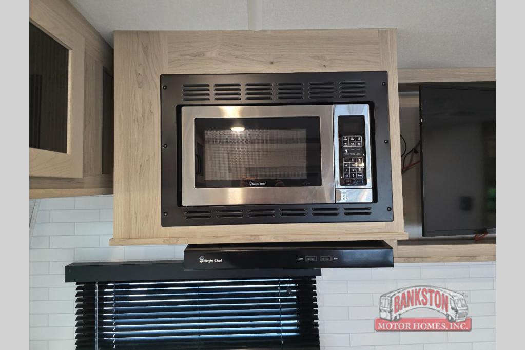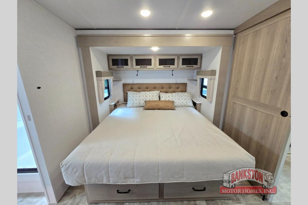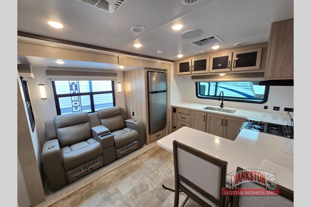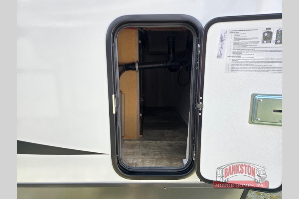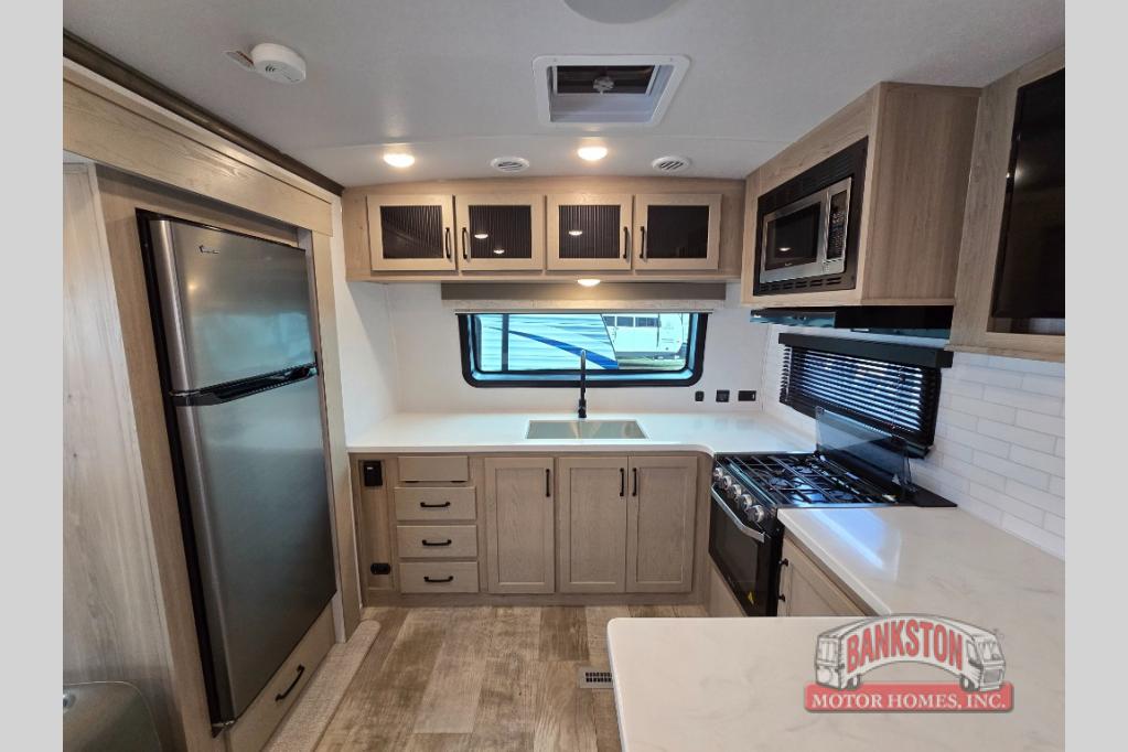 You will love how open this travel trailer will feel with the large front window that you can look out from the two-person bar top seating! The front kitchen has plenty of countertop space for you to prepare your best meals. Your nights will be spent in true relaxation with a 67" theater seating and king bed slide in the bedroom for a great night's rest. The full rear bathroom has a shower with a seat to take a nice, hot shower before bed, and a dual-sink vanity for two to get ready at once in the mornings!