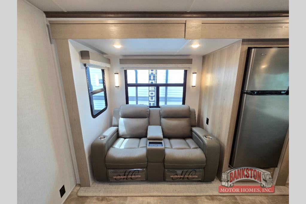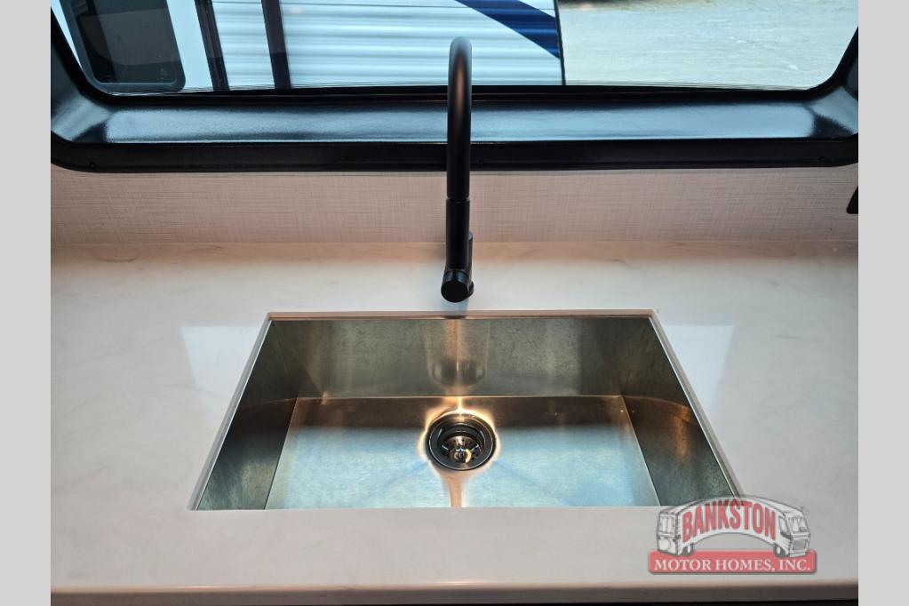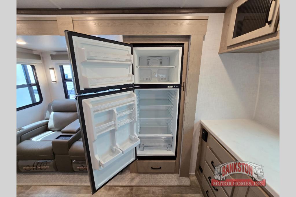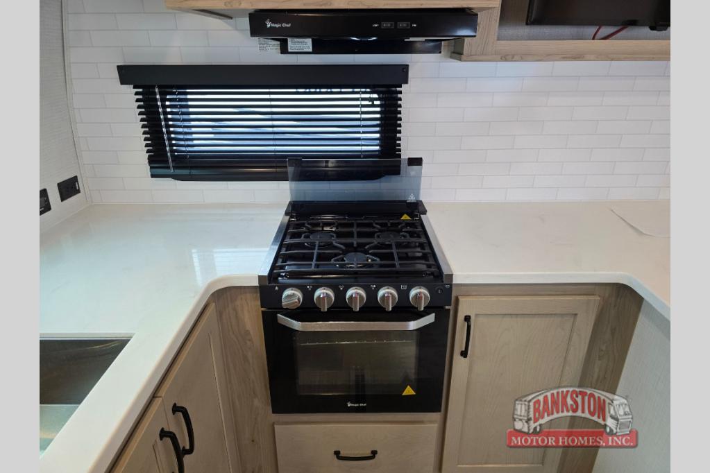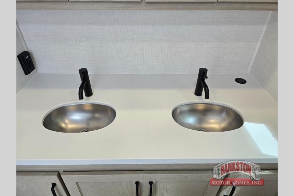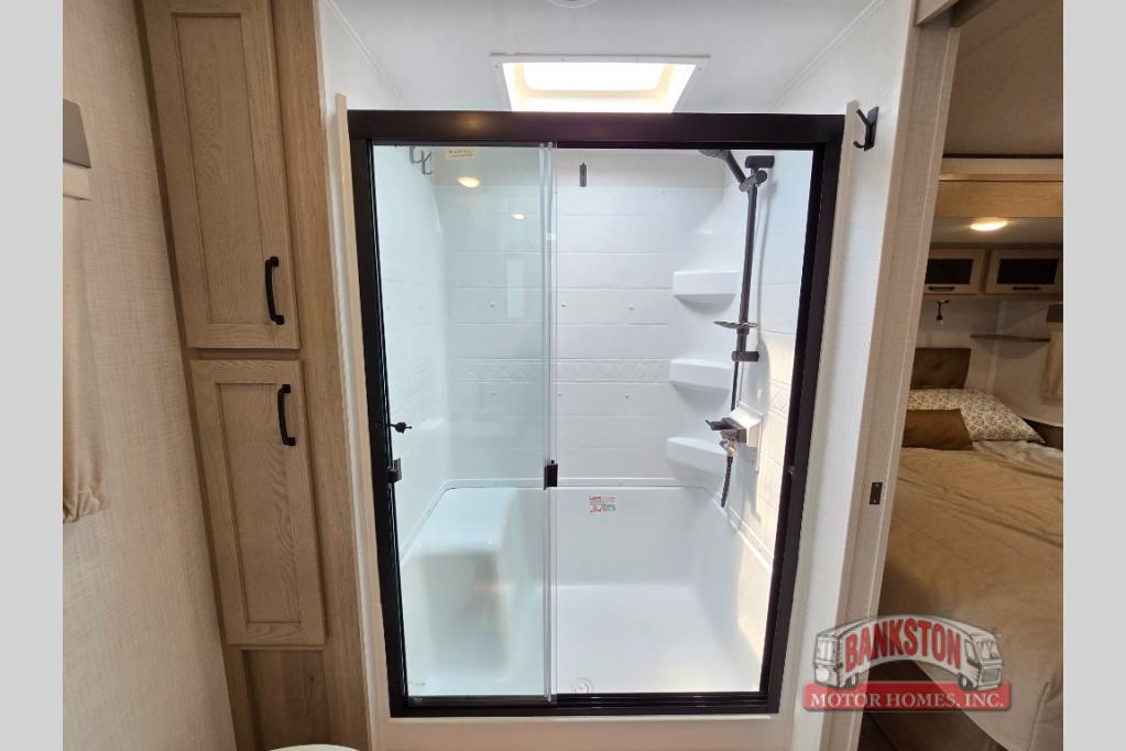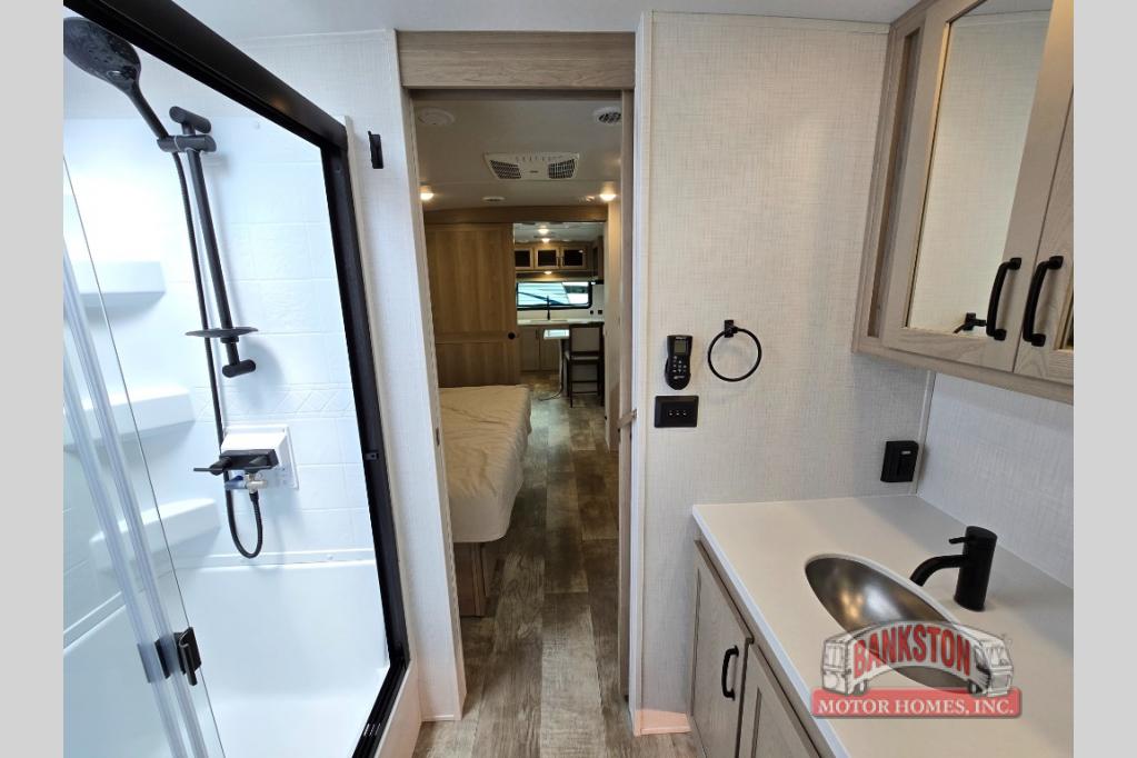 You will love how open this travel trailer will feel with the large front window that you can look out from the two-person bar top seating! The front kitchen has plenty of countertop space for you to prepare your best meals. Your nights will be spent in true relaxation with a 67" theater seating and king bed slide in the bedroom for a great night's rest. The full rear bathroom has a shower with a seat to take a nice, hot shower before bed, and a dual-sink vanity for two to get ready at once in the mornings!
