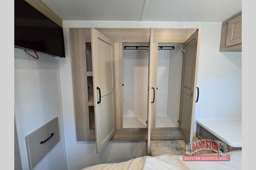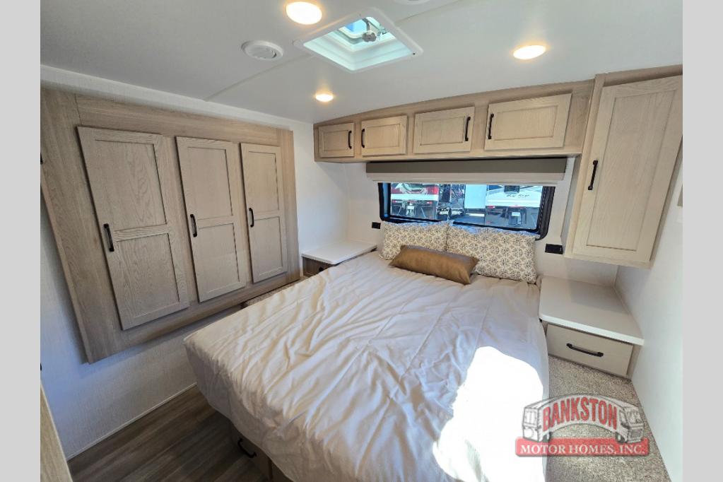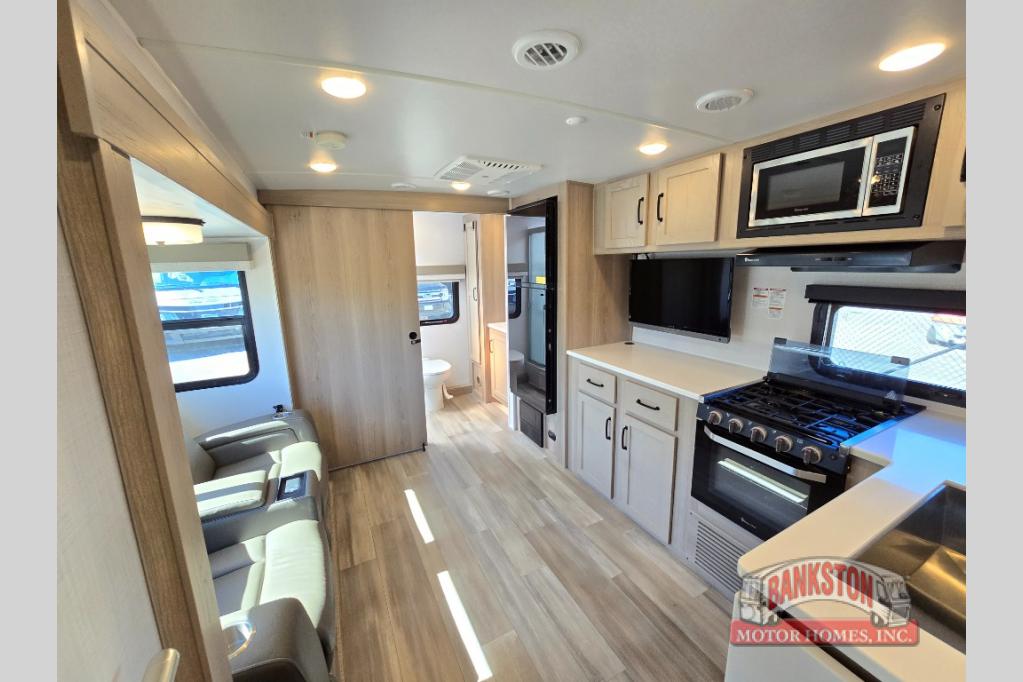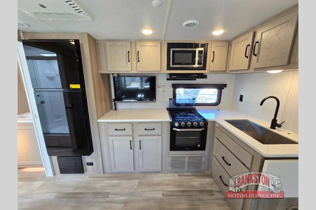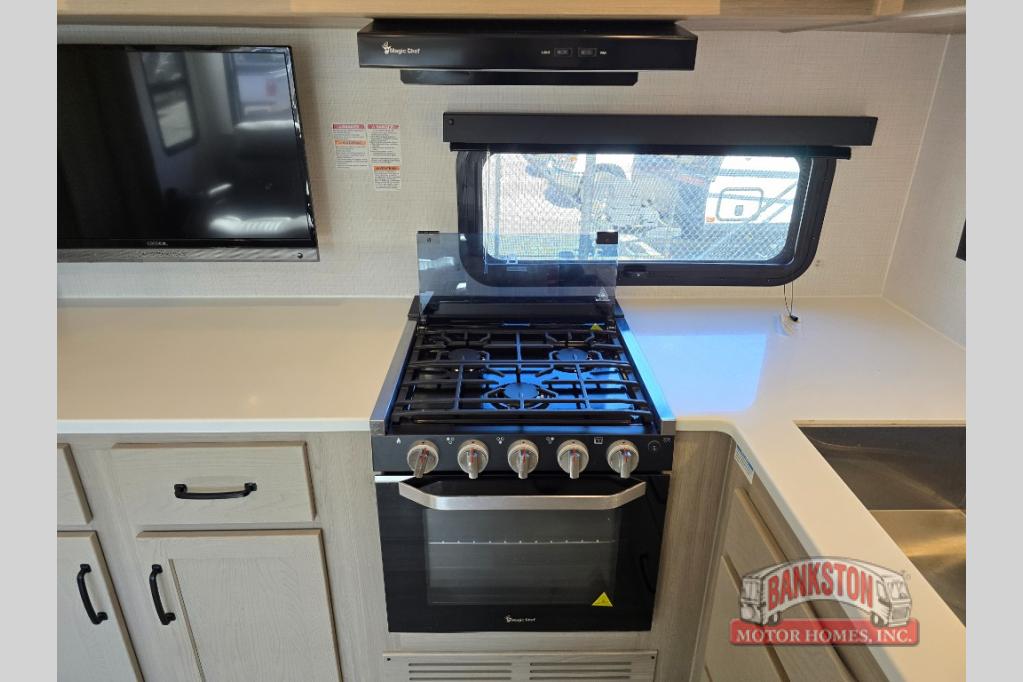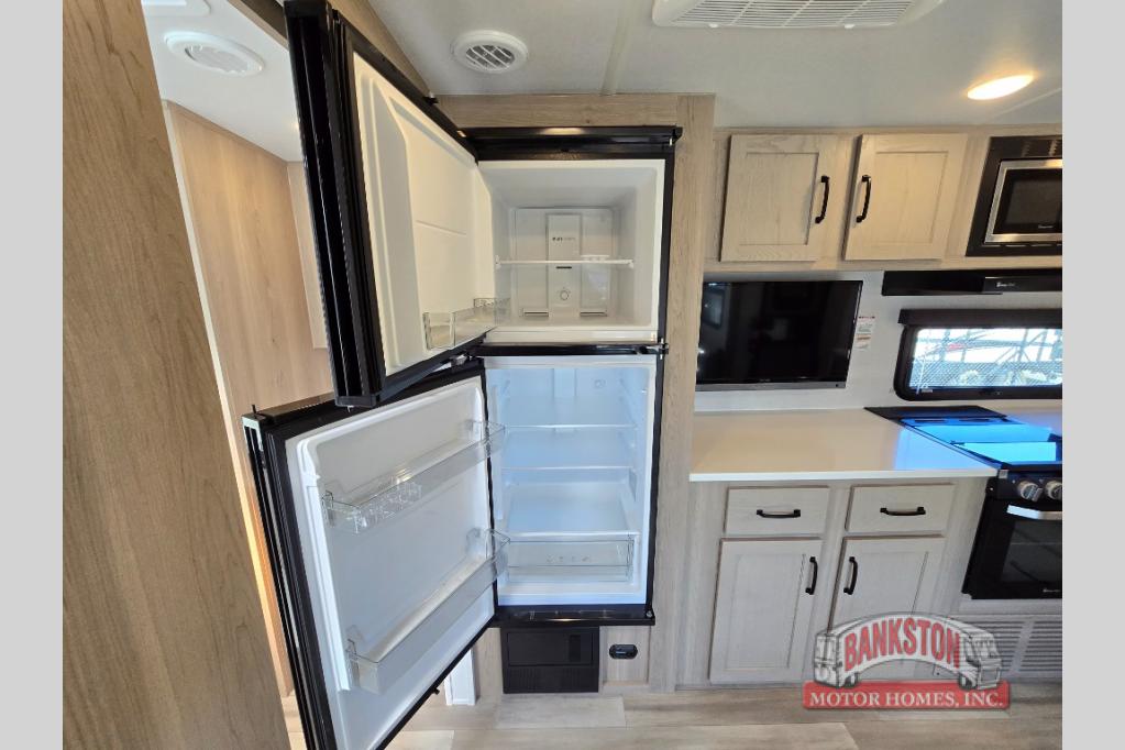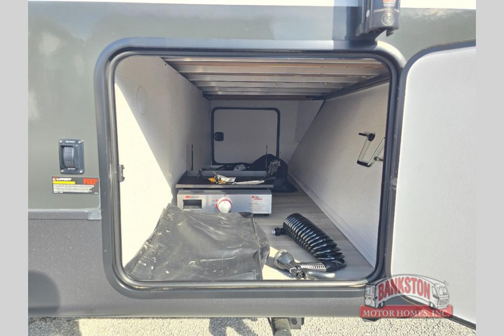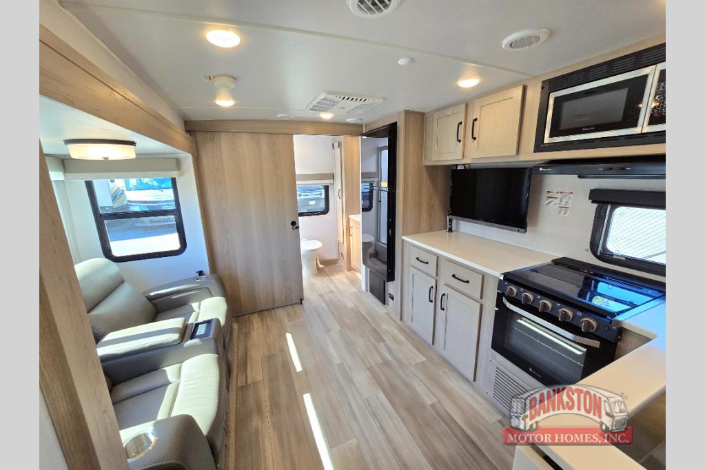 If you like to camp with your honey or a friend, this travel trailer will be perfect for you! You can sleep two people each night on the RV queen bed in the front private bedroom. You'll also find a wardrobe slide in the bedroom for more space, plus an additional wardrobe and an optional TV if you enjoy movies in bed. The theater seat with tables will provide a place to relax and dine together, and if you do need extra sleeping space, just choose the optional hide-a-bed sofa with a table instead of the theater seat. Delicious meals can be made on the three burner cooktop or in the 21" gas oven, and there is a 12V refrigerator for leftovers. The exterior is just as accommodating as the interior with its exterior griddle, drop-frame pass-through storage, 2" receiver hitch, and 19' power awning with LED lights.