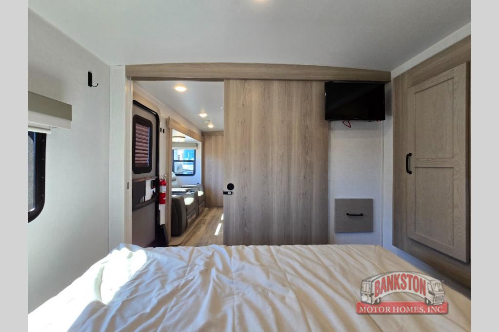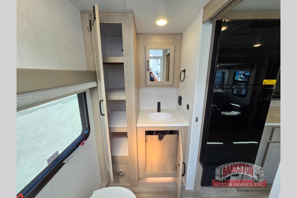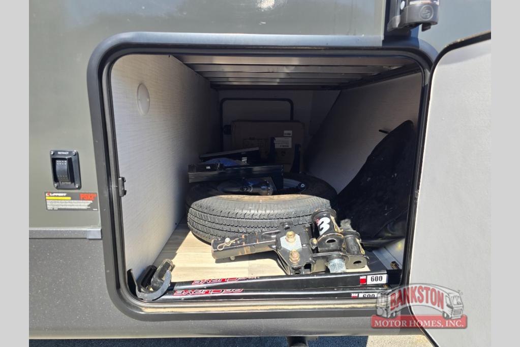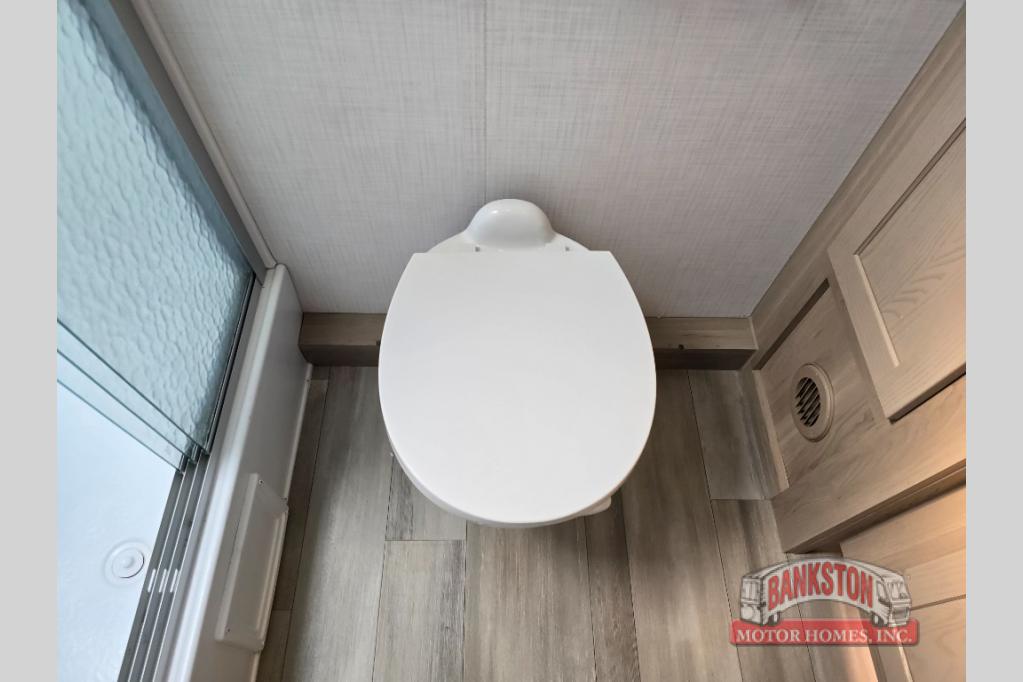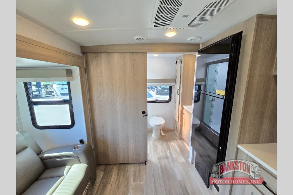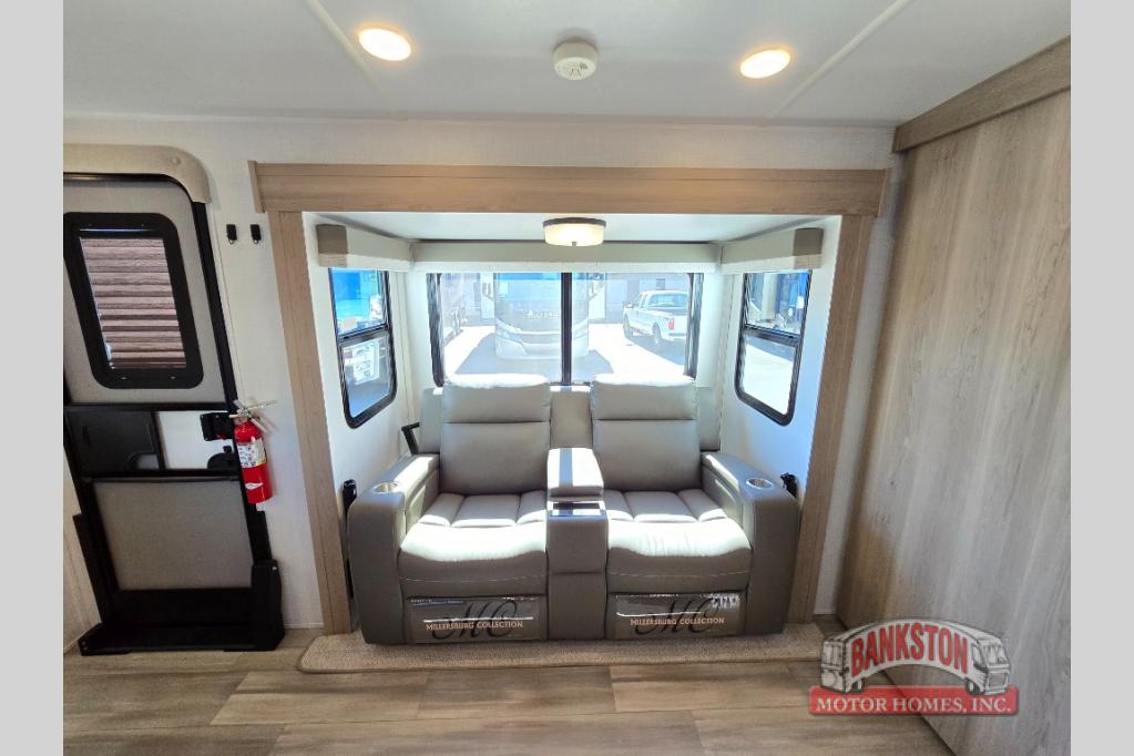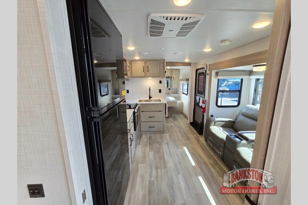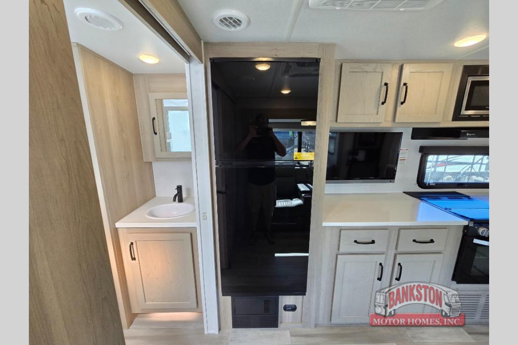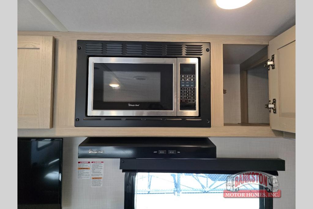 If you like to camp with your honey or a friend, this travel trailer will be perfect for you! You can sleep two people each night on the RV queen bed in the front private bedroom. You'll also find a wardrobe slide in the bedroom for more space, plus an additional wardrobe and an optional TV if you enjoy movies in bed. The theater seat with tables will provide a place to relax and dine together, and if you do need extra sleeping space, just choose the optional hide-a-bed sofa with a table instead of the theater seat. Delicious meals can be made on the three burner cooktop or in the 21" gas oven, and there is a 12V refrigerator for leftovers. The exterior is just as accommodating as the interior with its exterior griddle, drop-frame pass-through storage, 2" receiver hitch, and 19' power awning with LED lights.