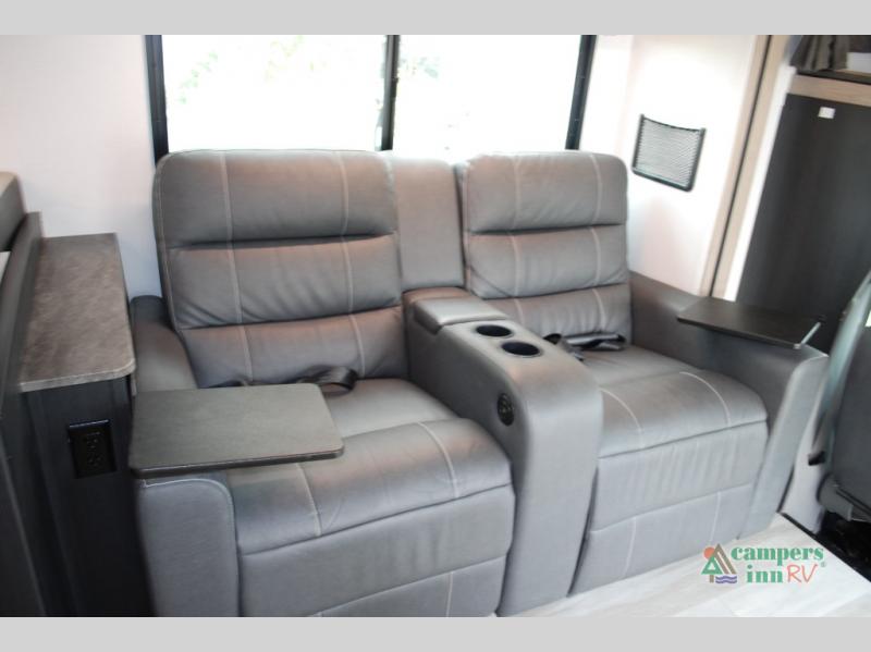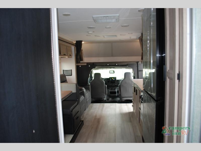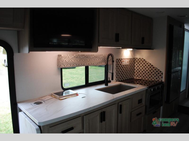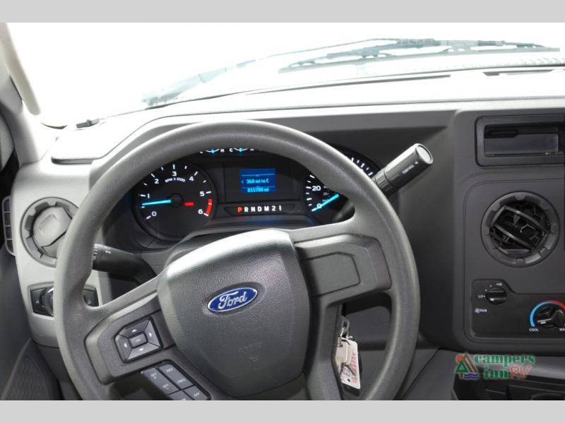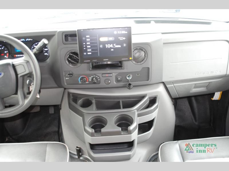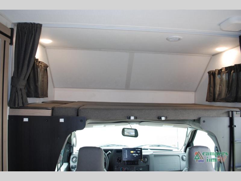 Escape the hustle and bustle of everyday life with this motorhome! It features a 60" x 80" bunk over cab mat which can be switched out for an optional Trekker cap with a built-in entertainment center. The sofa and U-shaped dinette slide offer comfortable places to enjoy meals, socialize, and even sleep once converted. Prepare your best meals with the 10.7 cu. ft. 12V refrigerator, the three burner cooktop, the flip-up countertop, and even the 1.3 cu. ft. undermount convection microwave. The separated bathroom has a 24" x 32" shower across from a toilet with a sink and countertop space, plus it leads directly into the rear private bedroom which has a 60" x 74" queen bed slide across from a linen/12V TV area with wardrobes on either side. You can even add an optional outside 12V TV and stay protected by the 15' 6" power awning!