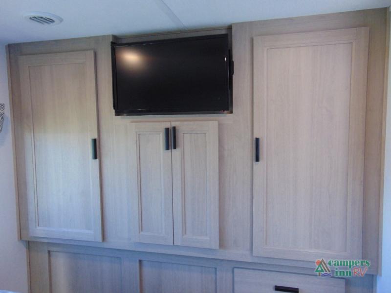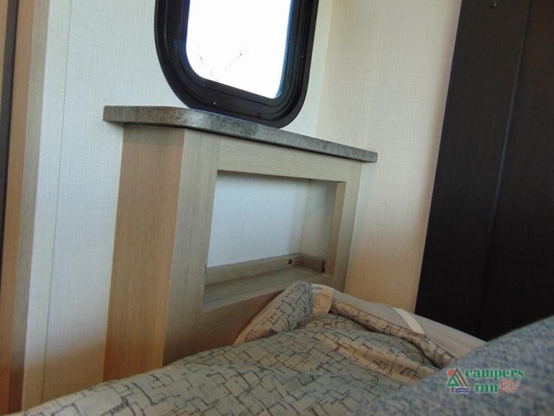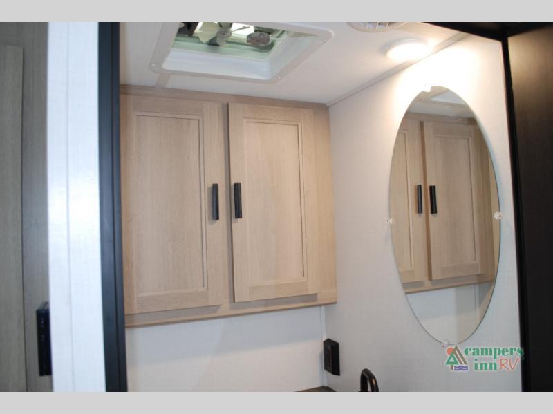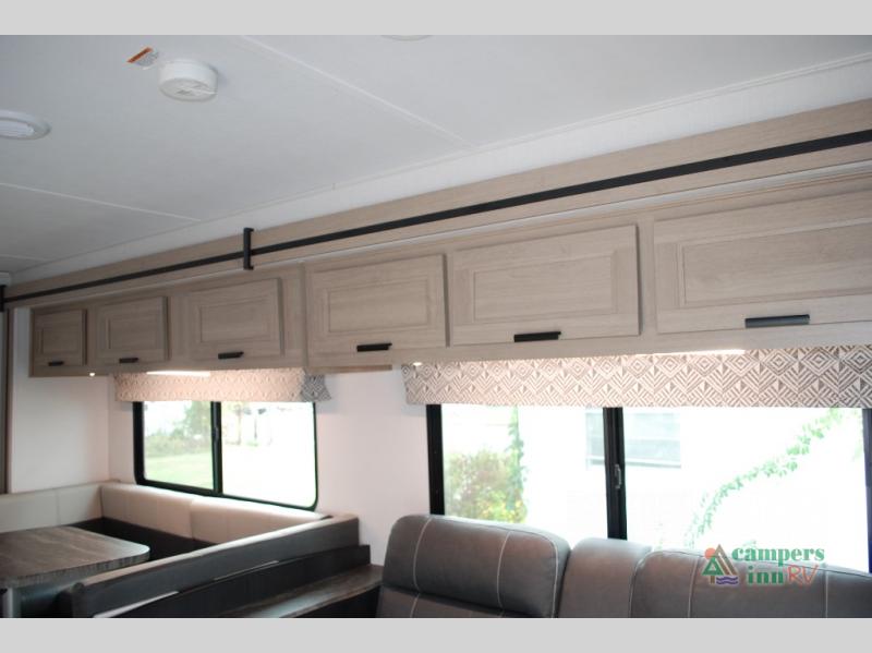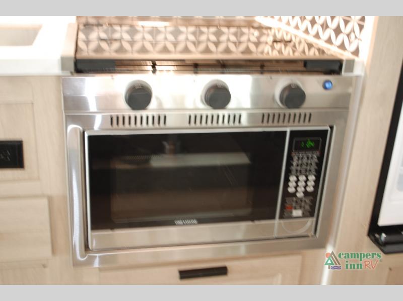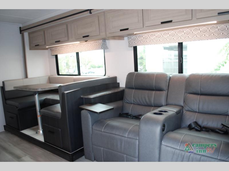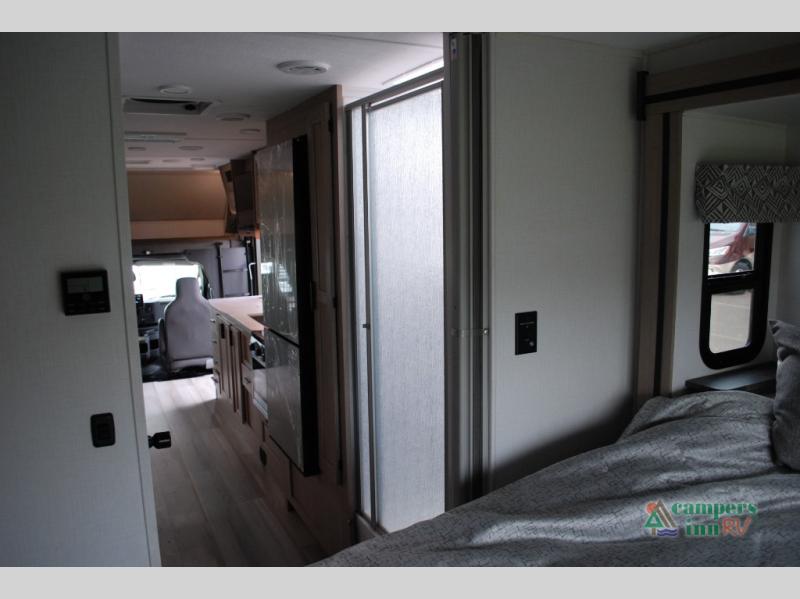 Escape the hustle and bustle of everyday life with this motorhome! It features a 60" x 80" bunk over cab mat which can be switched out for an optional Trekker cap with a built-in entertainment center. The sofa and U-shaped dinette slide offer comfortable places to enjoy meals, socialize, and even sleep once converted. Prepare your best meals with the 10.7 cu. ft. 12V refrigerator, the three burner cooktop, the flip-up countertop, and even the 1.3 cu. ft. undermount convection microwave. The separated bathroom has a 24" x 32" shower across from a toilet with a sink and countertop space, plus it leads directly into the rear private bedroom which has a 60" x 74" queen bed slide across from a linen/12V TV area with wardrobes on either side. You can even add an optional outside 12V TV and stay protected by the 15' 6" power awning!