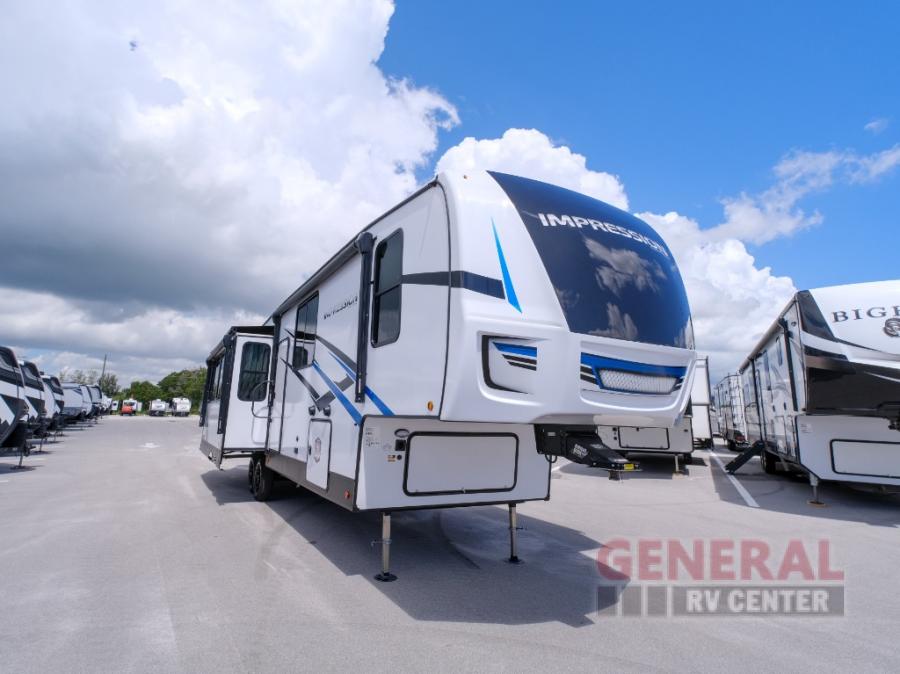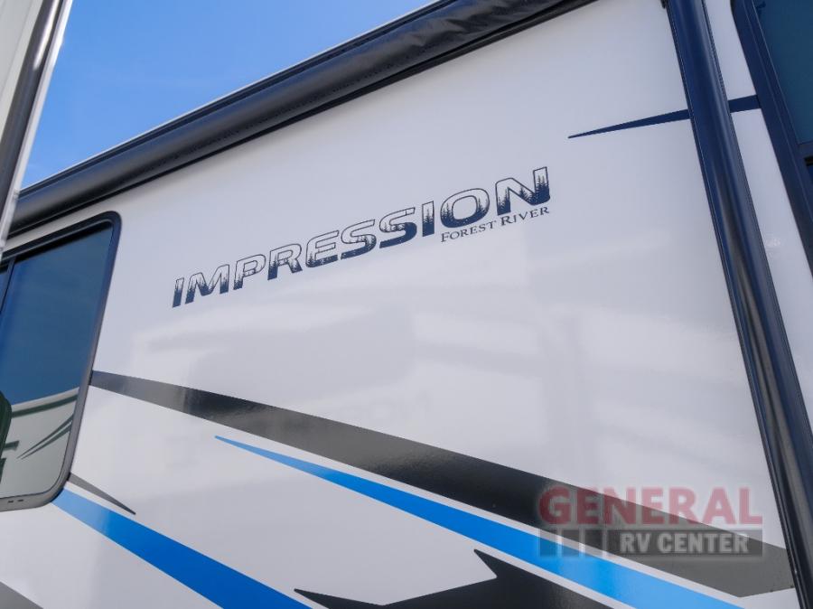 With any Impression mid-profile fifth wheel by Forest River, the focus of the design is comfort and value, built with quality craftsmanship and attention to customer's desires in each Impression! The exterior includes upgraded E-rated Goodyear Endurance tires made in the U.S.A., custom exterior graphics package, and One Touch automatic leveling system for easy setup. There is also an enclosed docking station and a gel coat fiberglass front cap with an automotive windshield with LED lights for style and beautiful views. The fully heated and enclosed AccessiBelly has removable underbelly panels and offers four seasons of travel.  The interior has oversized opening windows in the living area for more natural lighting and good air flow, a stainless steel single bowl sink with high rise faucet with a pulldown sprayer to easily clean the dishes, and a porcelain foot flush toilet to mention a few comforts and conveniences.
