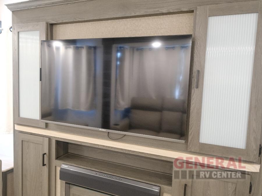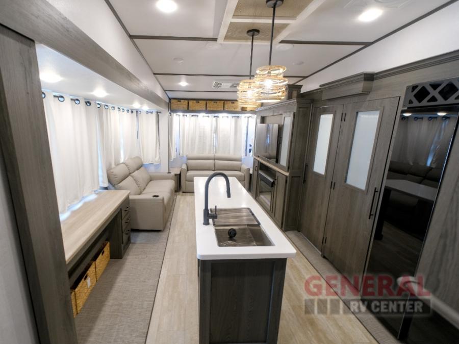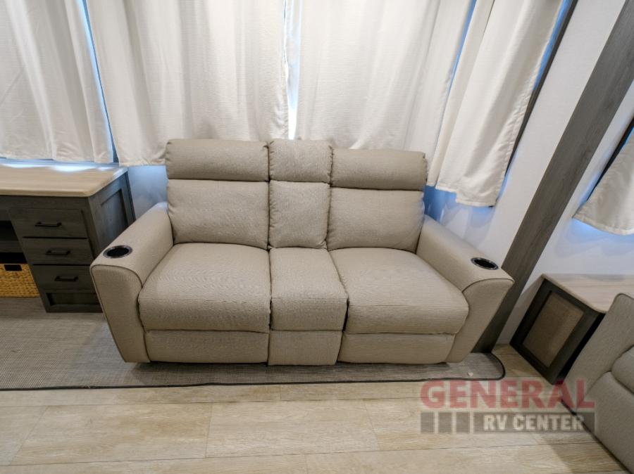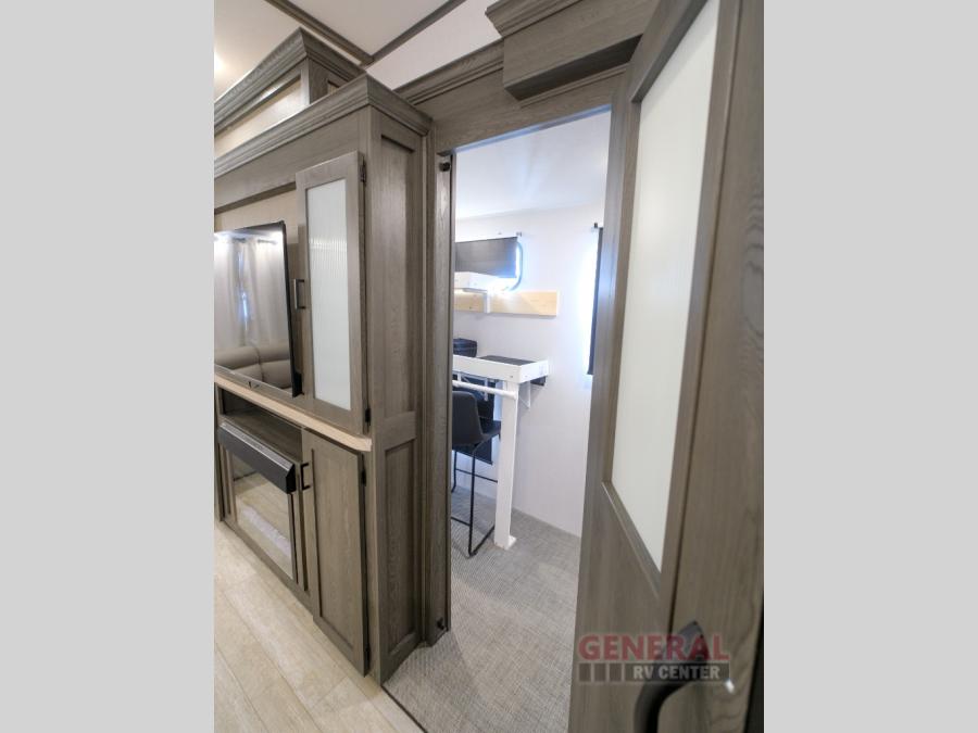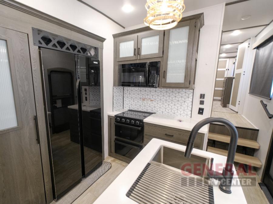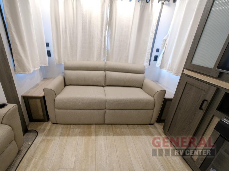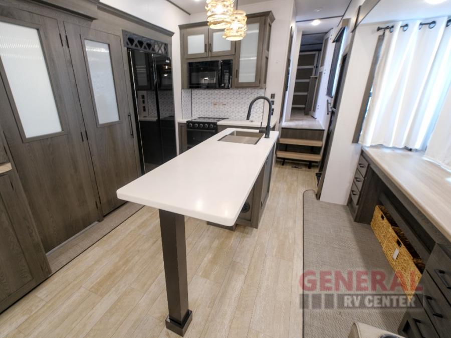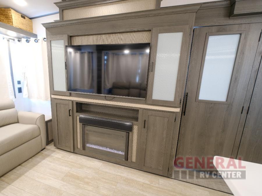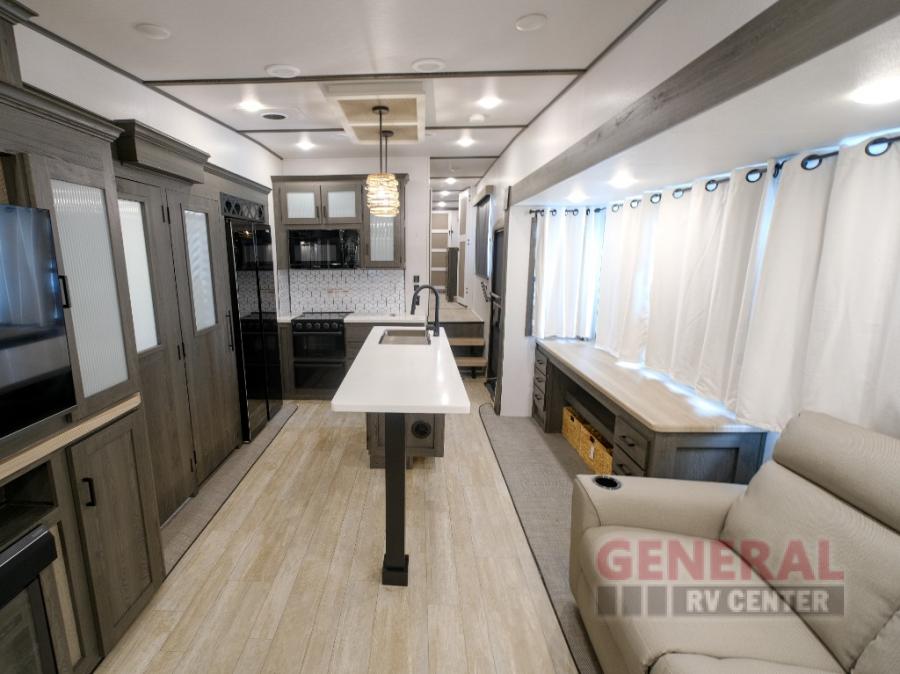 Step inside this luxurious fifth wheel that has been awarded the RV Business 2024 Top RV Debut! The rear tri-fold hide-a-bed sofa and theater seating provide a relaxing evening by the entertainment center with a 55" TV. Next to the entertainment center is a hidden door with cabinets and 16 cu. ft. 12V refrigerator, and above it is a 36" x 74" flip-down bunk and pad below it all housed within a slide. The kitchen has plenty of countertop space to prepare your best home cooked meals and an island with four bar stools to enjoy your meals. You also have a desk with storage to get some work done if needed. As you walk up the floating steps, you will notice the full bathroom to your left with a walk-in shower with a skylight for added natural lighting and a dual sink vanity for two to get ready at once. The front private bedroom has a king bed with Versa Tilt technology slide, a dresser next to a bench and a front wardrobe that is prepped for a washer and dryer!