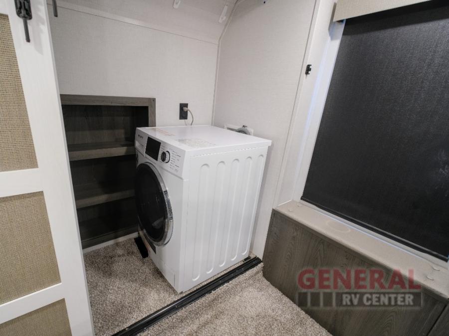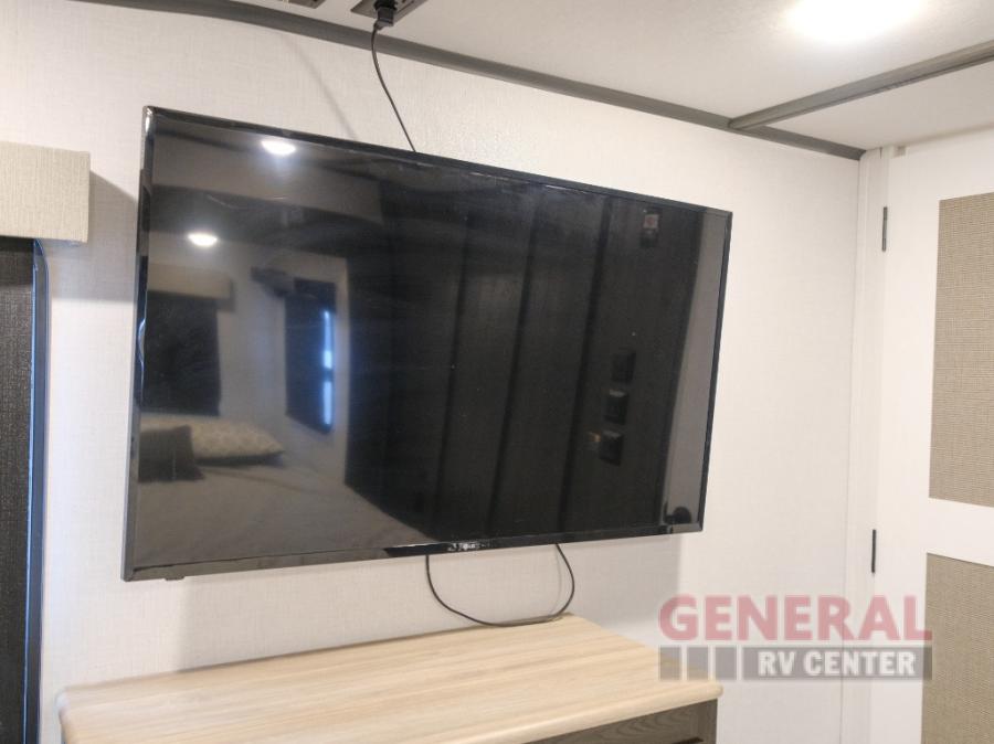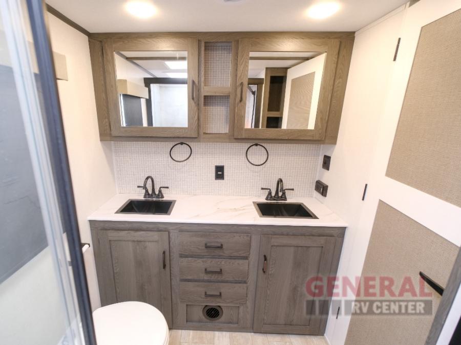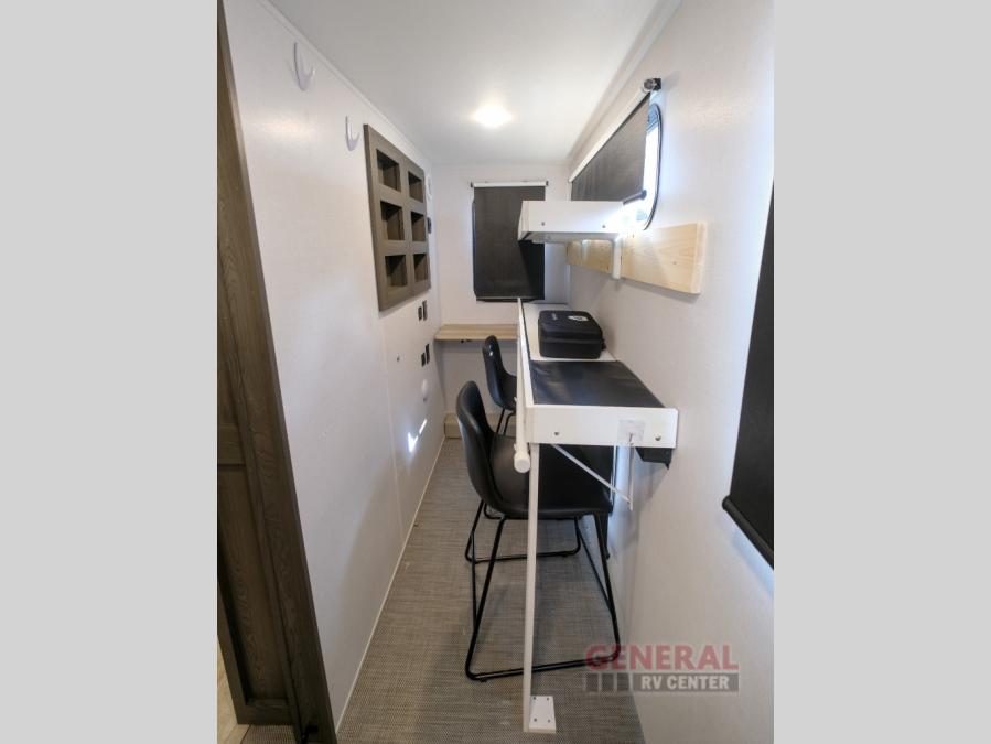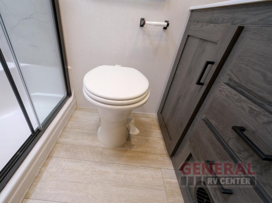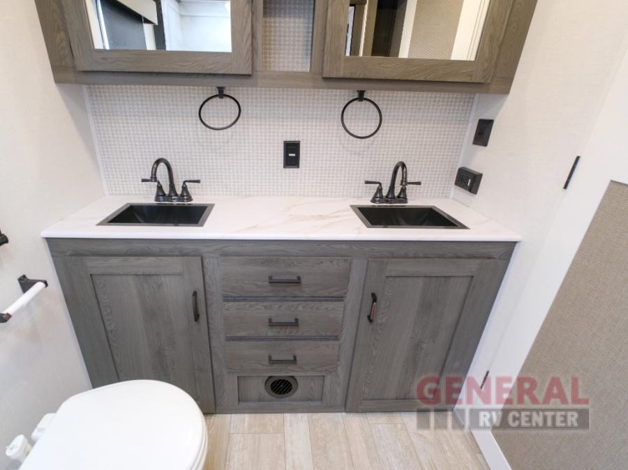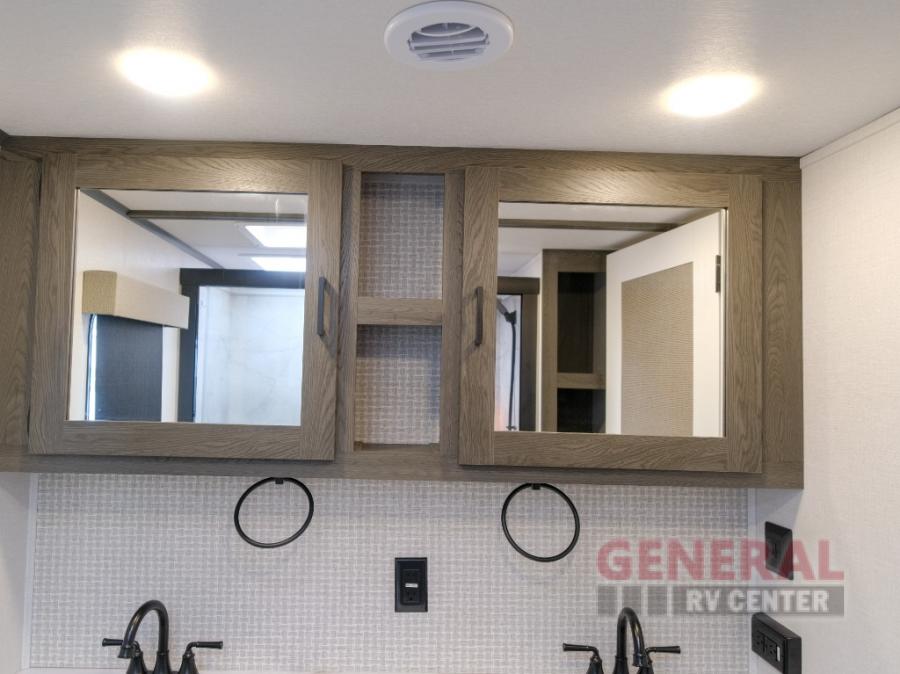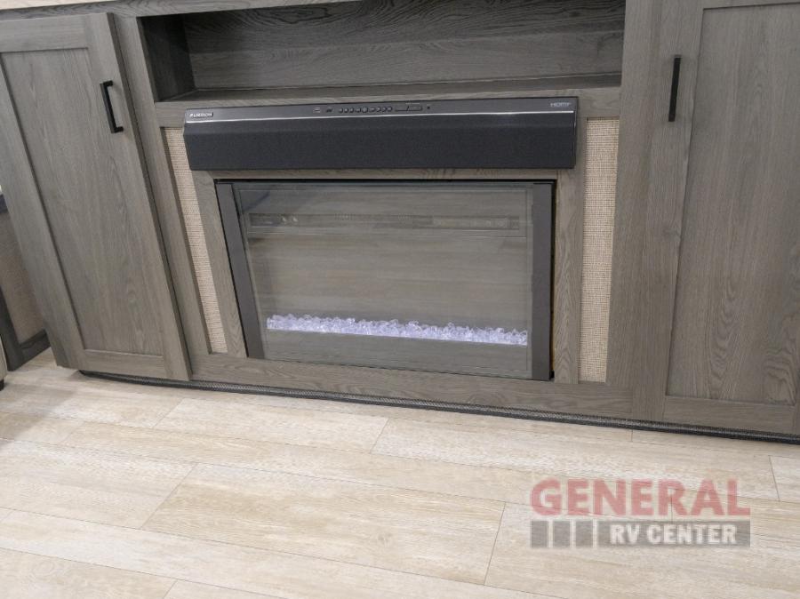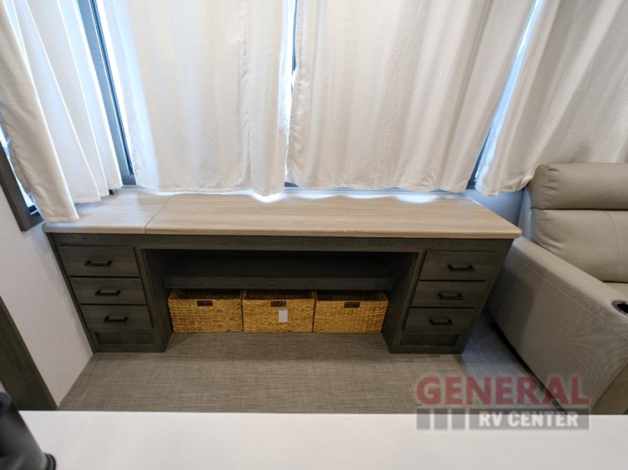 Step inside this luxurious fifth wheel that has been awarded the RV Business 2024 Top RV Debut! The rear tri-fold hide-a-bed sofa and theater seating provide a relaxing evening by the entertainment center with a 55" TV. Next to the entertainment center is a hidden door with cabinets and 16 cu. ft. 12V refrigerator, and above it is a 36" x 74" flip-down bunk and pad below it all housed within a slide. The kitchen has plenty of countertop space to prepare your best home cooked meals and an island with four bar stools to enjoy your meals. You also have a desk with storage to get some work done if needed. As you walk up the floating steps, you will notice the full bathroom to your left with a walk-in shower with a skylight for added natural lighting and a dual sink vanity for two to get ready at once. The front private bedroom has a king bed with Versa Tilt technology slide, a dresser next to a bench and a front wardrobe that is prepped for a washer and dryer!