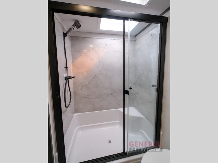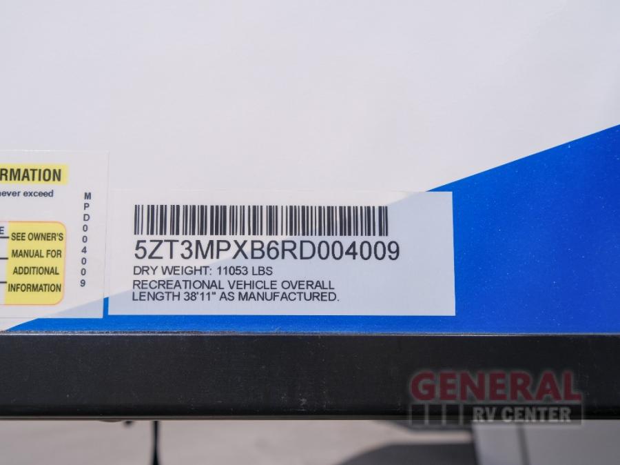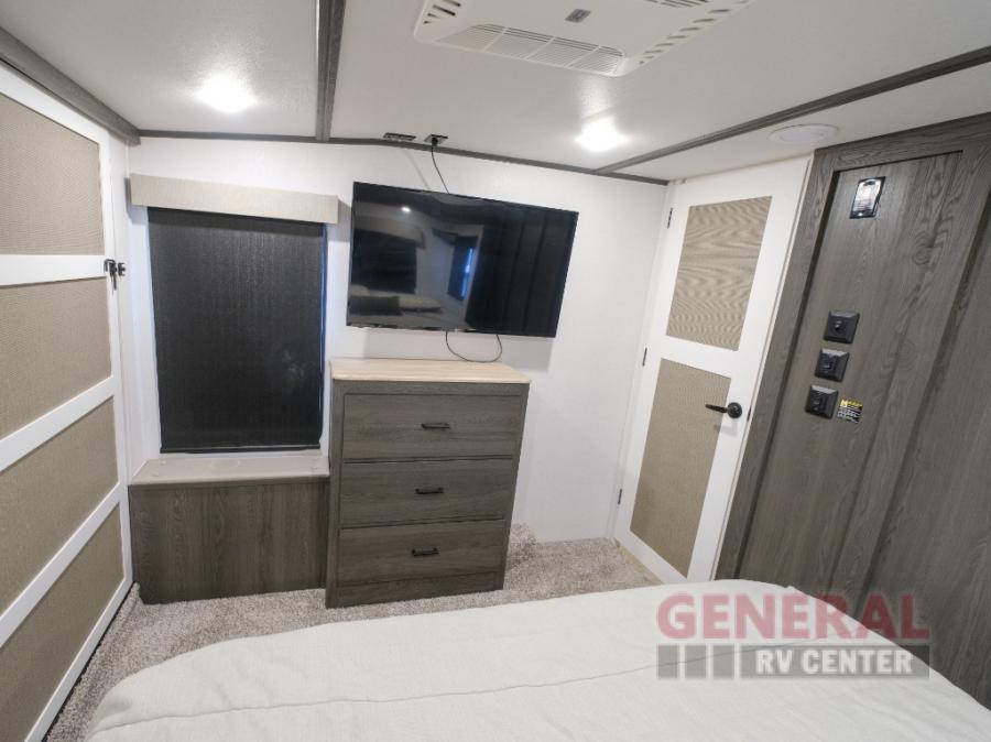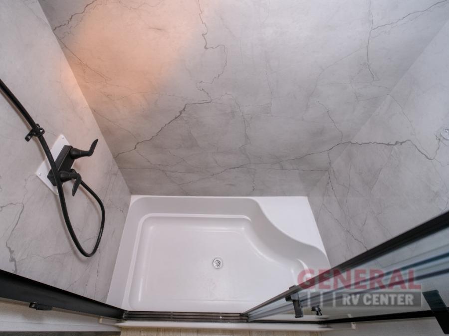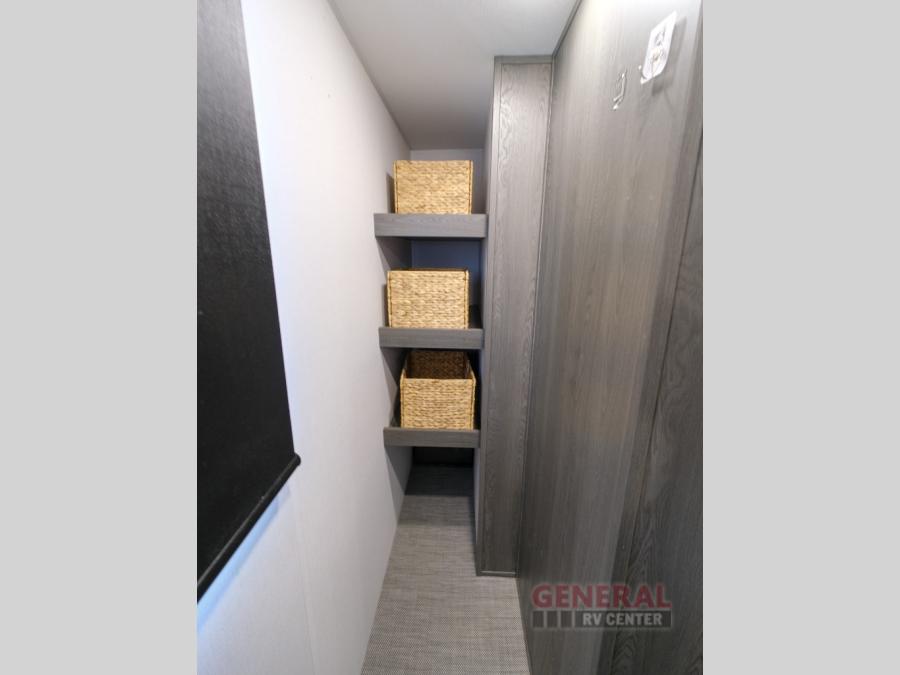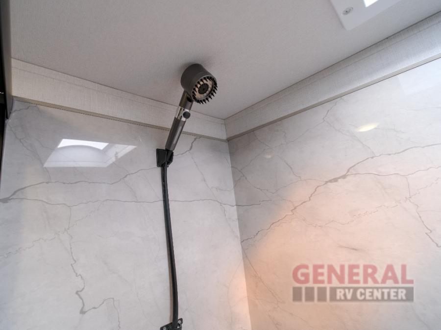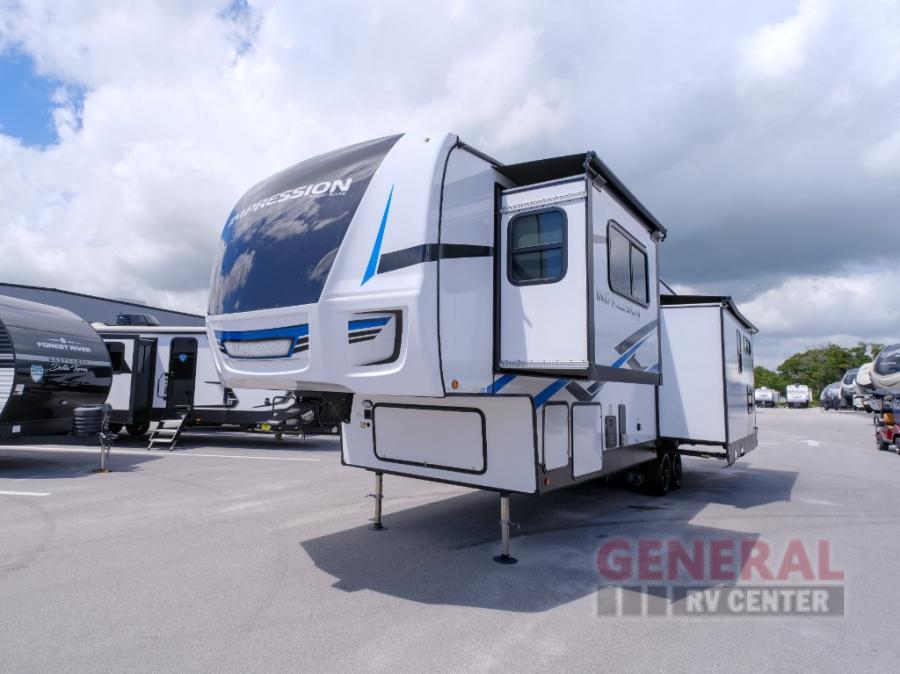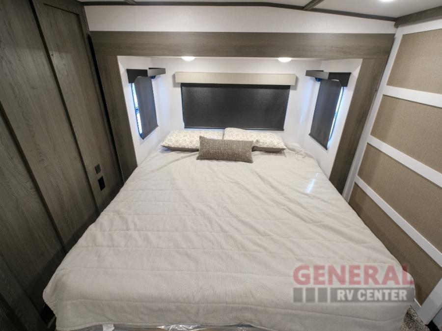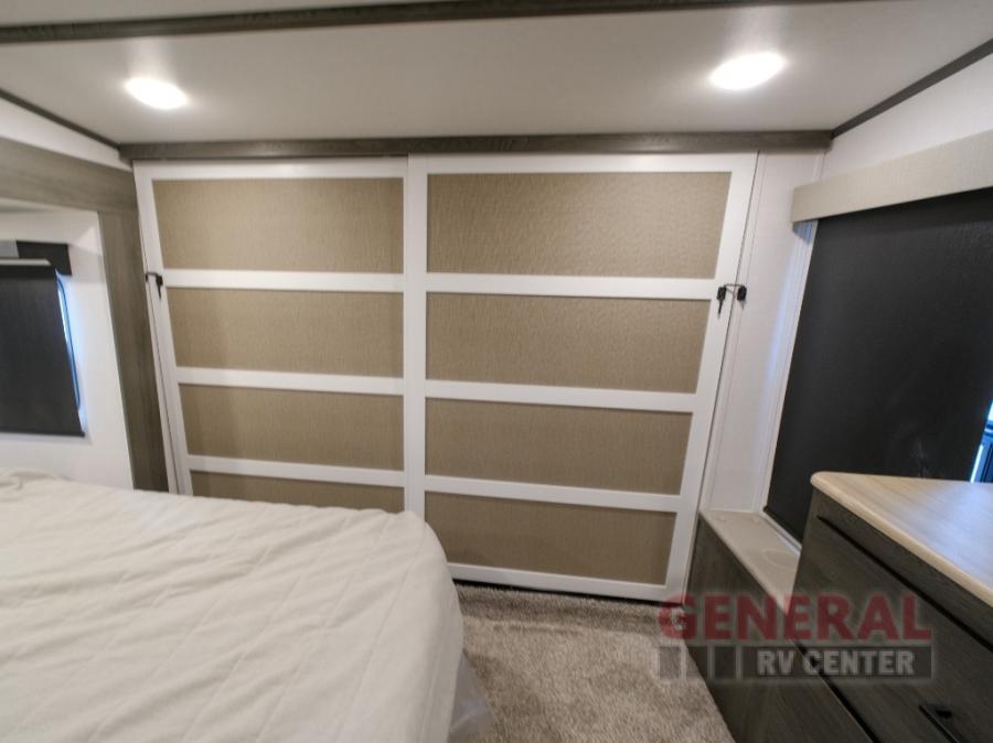 Step inside this luxurious fifth wheel that has been awarded the RV Business 2024 Top RV Debut! The rear tri-fold hide-a-bed sofa and theater seating provide a relaxing evening by the entertainment center with a 55" TV. Next to the entertainment center is a hidden door with cabinets and 16 cu. ft. 12V refrigerator, and above it is a 36" x 74" flip-down bunk and pad below it all housed within a slide. The kitchen has plenty of countertop space to prepare your best home cooked meals and an island with four bar stools to enjoy your meals. You also have a desk with storage to get some work done if needed. As you walk up the floating steps, you will notice the full bathroom to your left with a walk-in shower with a skylight for added natural lighting and a dual sink vanity for two to get ready at once. The front private bedroom has a king bed with Versa Tilt technology slide, a dresser next to a bench and a front wardrobe that is prepped for a washer and dryer!