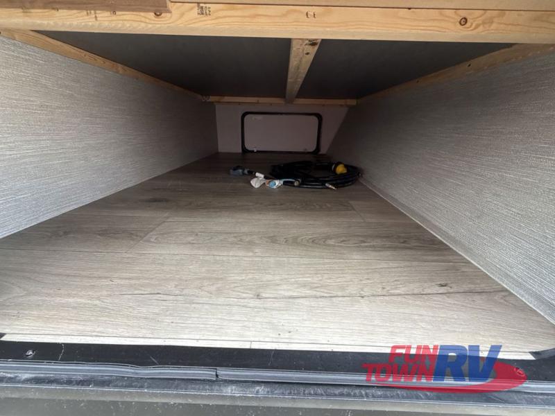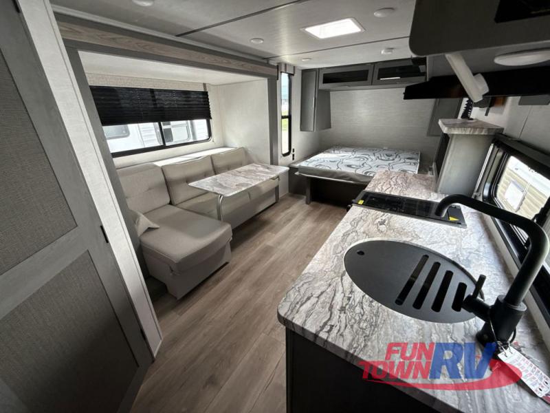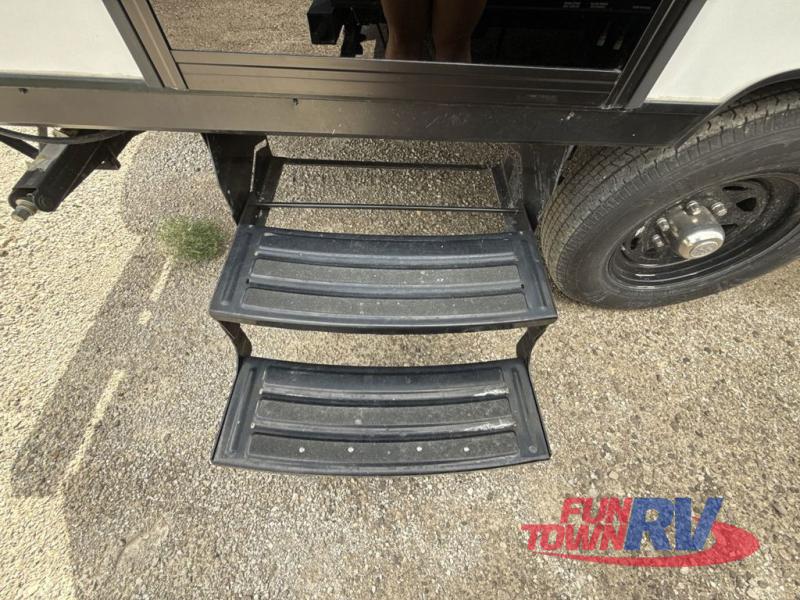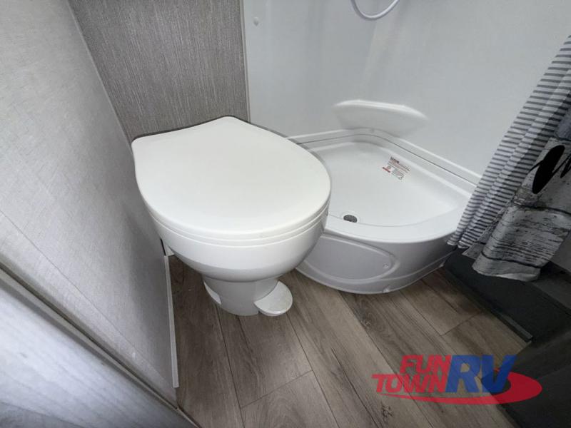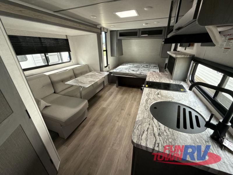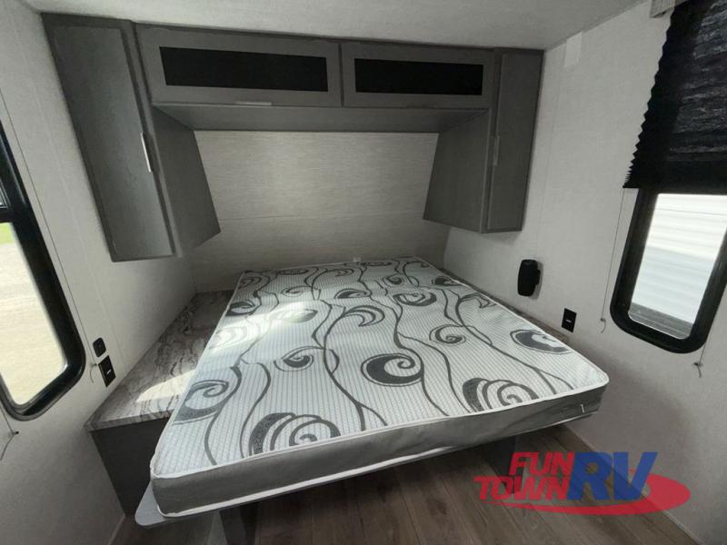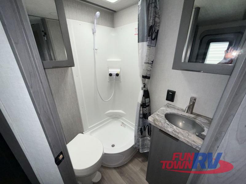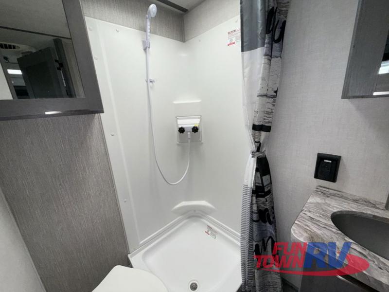 Start camping in this well-equipped travel trailer! The compact kitchen has everything you need to prepare your best home cooked meals and you can enjoy them at the convertible chaise lounge with a folding sofa and a table. Freshen up each morning in the rear corner bathroom with the corner shower and rest each night on the front queen bed with wardrobes on either side and overhead storage. Rinse the mud off your feet with the exterior hot/cold shower to be sure you do not track it all throughout the inside. Don't leave any of your outdoor gear behind; simply store it in the exterior full pass-through storage area!