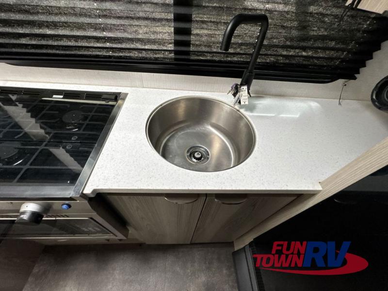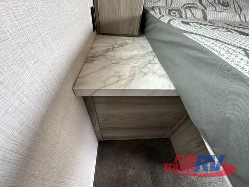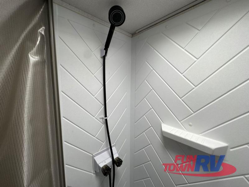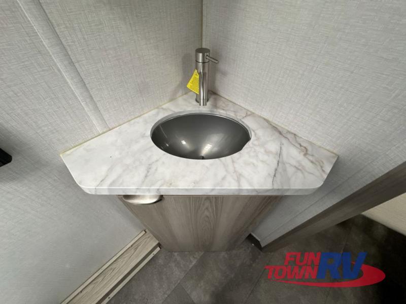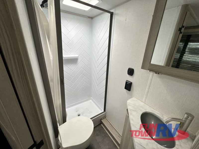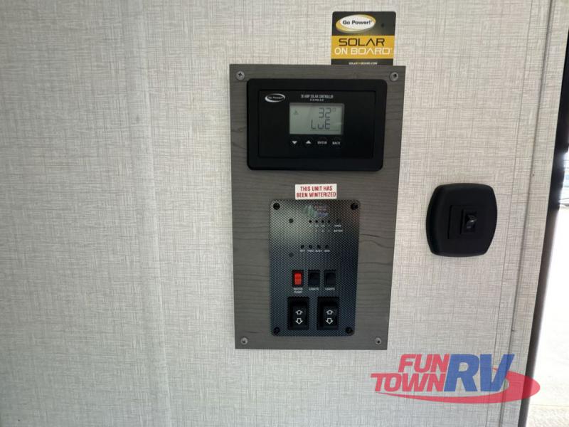 Perfect for your family, this single slide with split bunk and queen bed provides your family comfortable sleeping for four, and the slide adds a bit more interior space in camp. The split bunk is located behind the spice rack door and TV for your entertainment and cooking needs. Speaking of cooking, you can prepare your best home cooked meals with the cooktop, and store any leftovers in the dual swinging 12V refrigerator. Relax each night in the theater seating and freshen up in the rear corner bathroom each morning which features a skylight over the shower for more natural lighting.