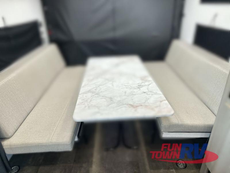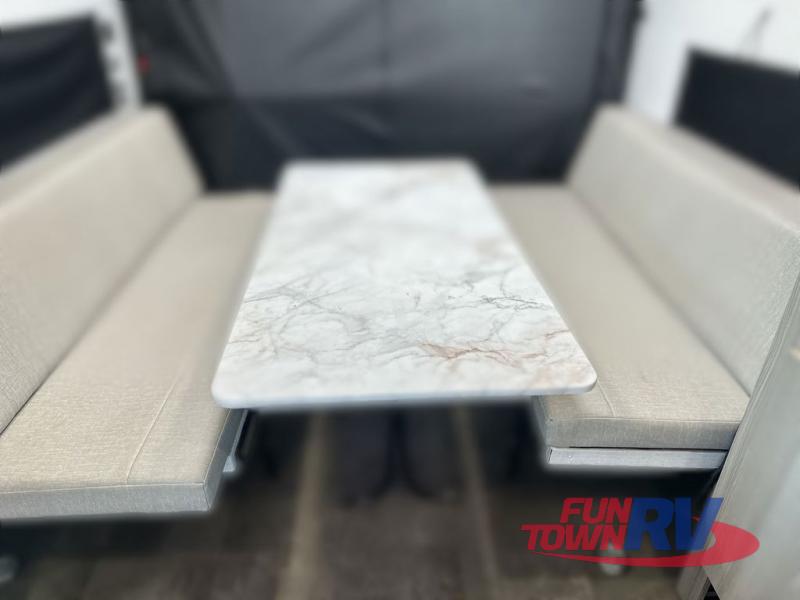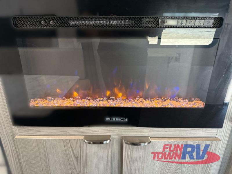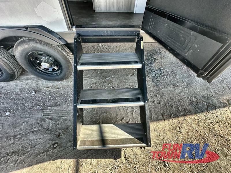 Make the most of your vacations with this Platinum version MAX toy hauler! The 14' garage area includes dual sofa sleepers with a table in between to dine at, plus a 3,000 lb. ramp door for easy unloading. Enjoy the fireplace for a cozy evening indoors while your dinner is cooking on the three burner cooktop or being heated up in the microwave. After a fun day of trail riding, you can clean the mud out of your hair with the 30" x 36" shower with a skylight in the full bathroom. The front private bedroom has a queen bed to lay your head on at night, shoe storage under the bed, a walk-in closet, and wardrobes on either side of the bed for even more clothing storage space.