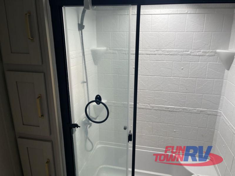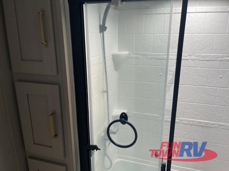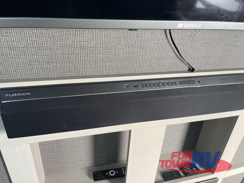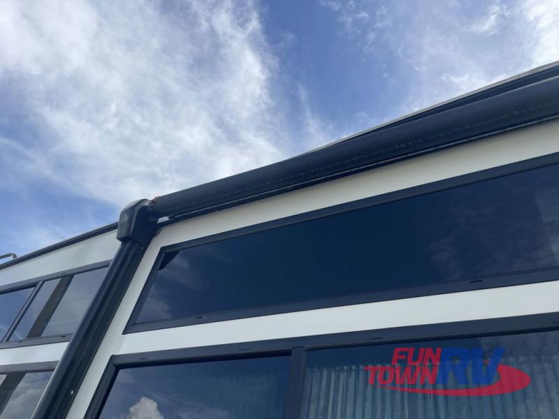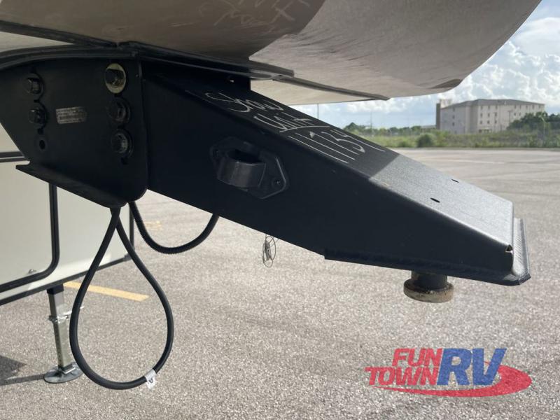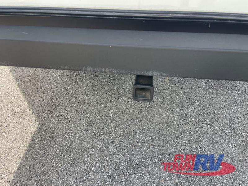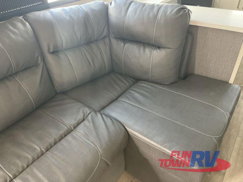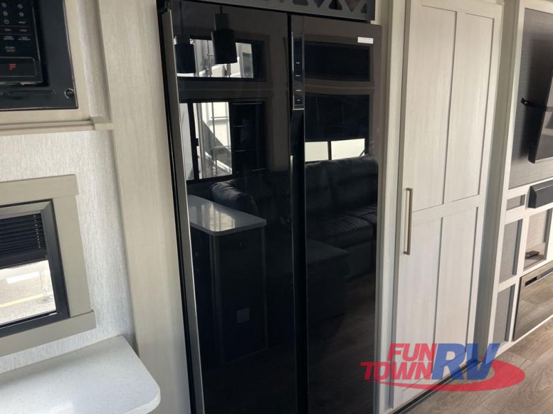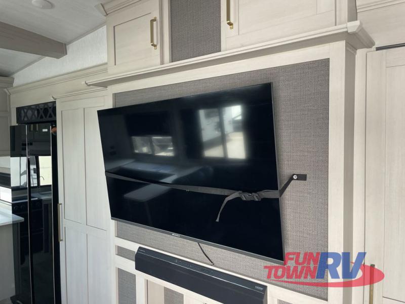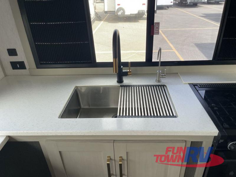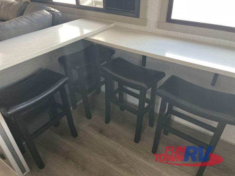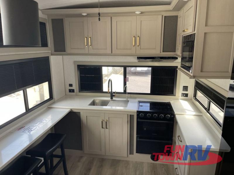 You'll be viewing this fifth wheel with eyes wide open from all of the stand-out features! The chef of your group won't be the only one to love the rear kitchen since it includes wrap-around countertops with four bar stools and panoramic windows for the best outdoor views. The 16' electric awning with LED lights will provide shade during the day, and the XL Texas-size pass-through can hold fishing gear, camp chairs, and more! Once you've entered the unit, you'll find the sectional sofa across from the large slide out with a hidden bunk room behind! There is a pocket door with storage, a dresser, bunk beds, and shelves for even more storage; how convenient! Head to the front private bedroom after a day of fun where you'll sleep soundly on the custom king bed with Versa-Tilt, a dresser with a bench beside it, plus a walk-in closet with shelves and washer/dryer prep!