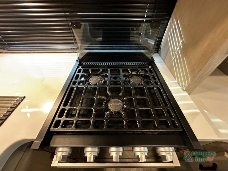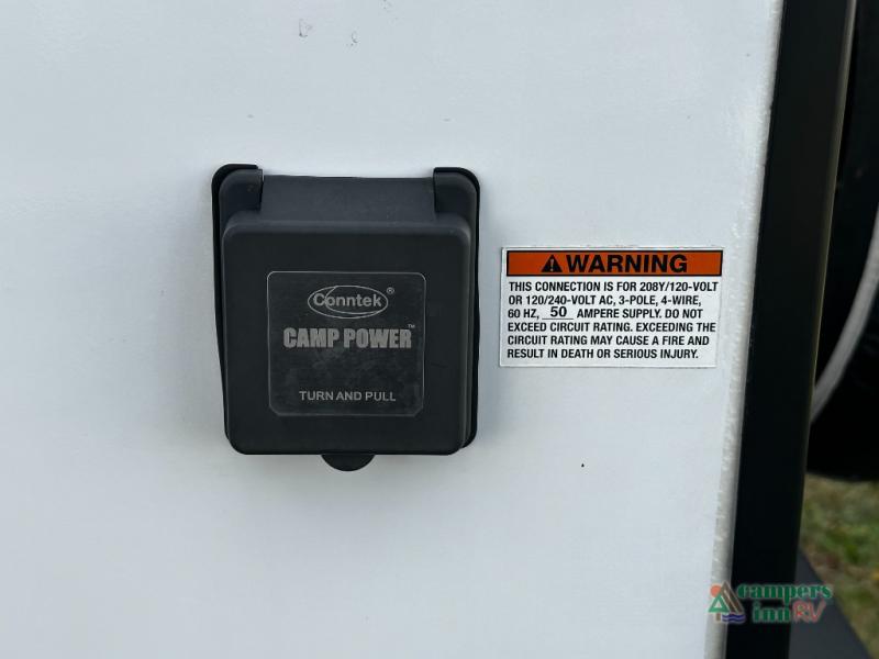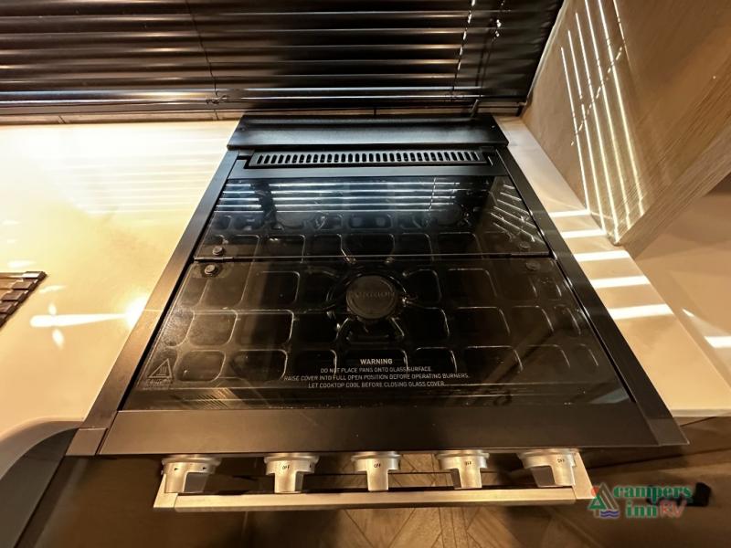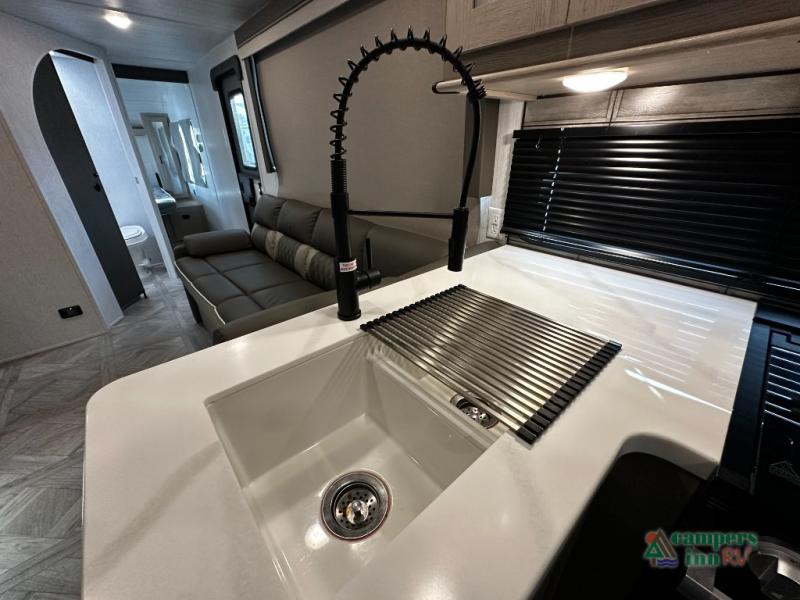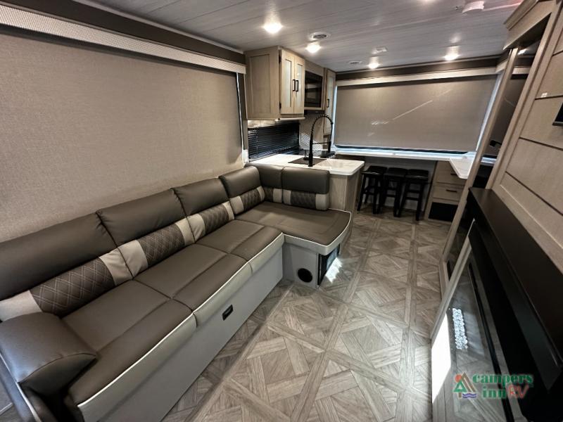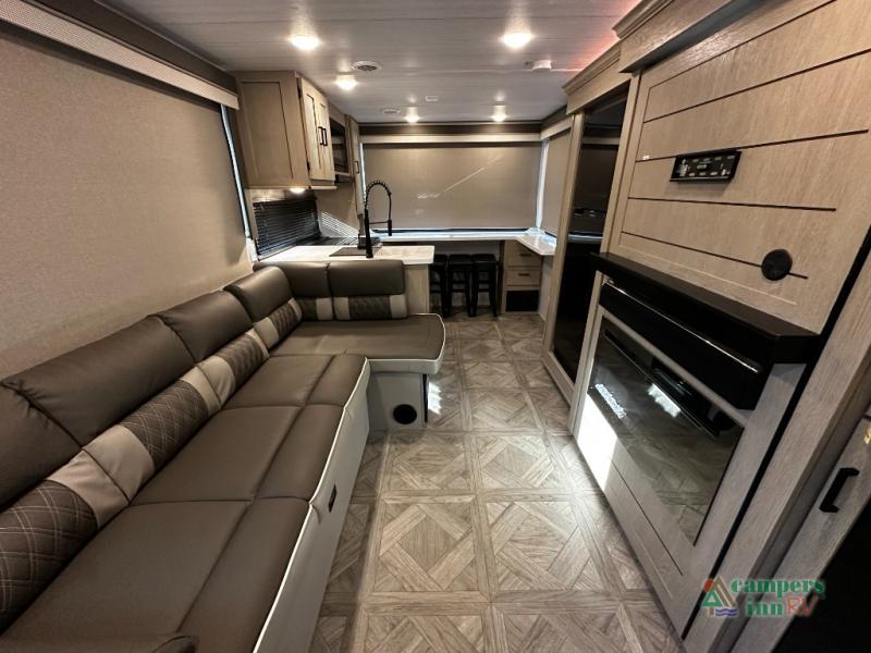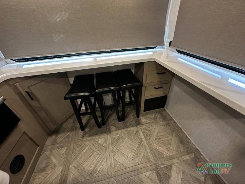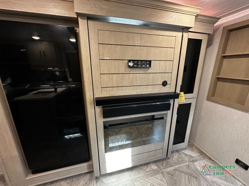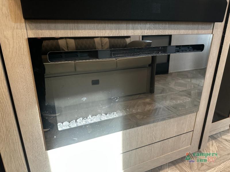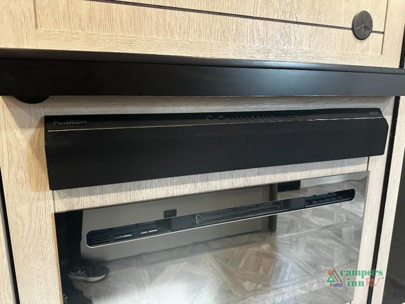 Enjoy your surroundings with 64 square feet of windows! So, no matter where you park, you can easily bring the outdoors right inside. The rear kitchen features 18 linear feet of wrap-around counter space including a double sink and a three burner cook-top with overhead microwave oven. There are bar stools for dining inside along the rear counter, and an L-shaped sofa for additional seating in the open living area. Here, behind the entertainment center, is a multi-purpose space hidden behind the shiplap feature wall insert with fireplace including a hinged top mattress above a lower bunk, a desk beneath the mattress if you need office space during the day, along with storage cubbies for your things, all within the Versa-Slide that also houses an oversized refrigerator for all of your perishables. The front private bedroom features a Versa-Tilt custom king bed with dual nightstands and closets, plus overhead storage. You will also find additional storage in a large pass-through beneath on the exterior, and the exterior camp kitchen is sure to be a big hit with the cook!