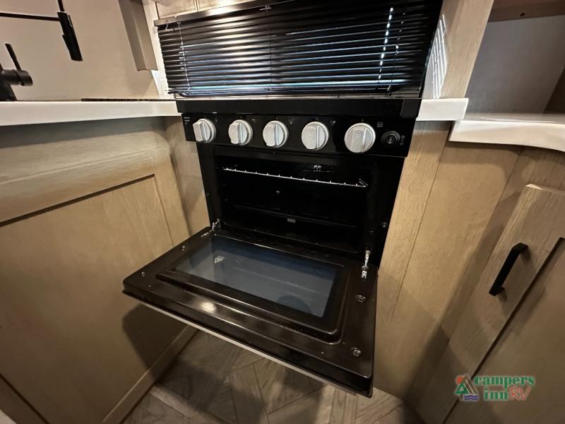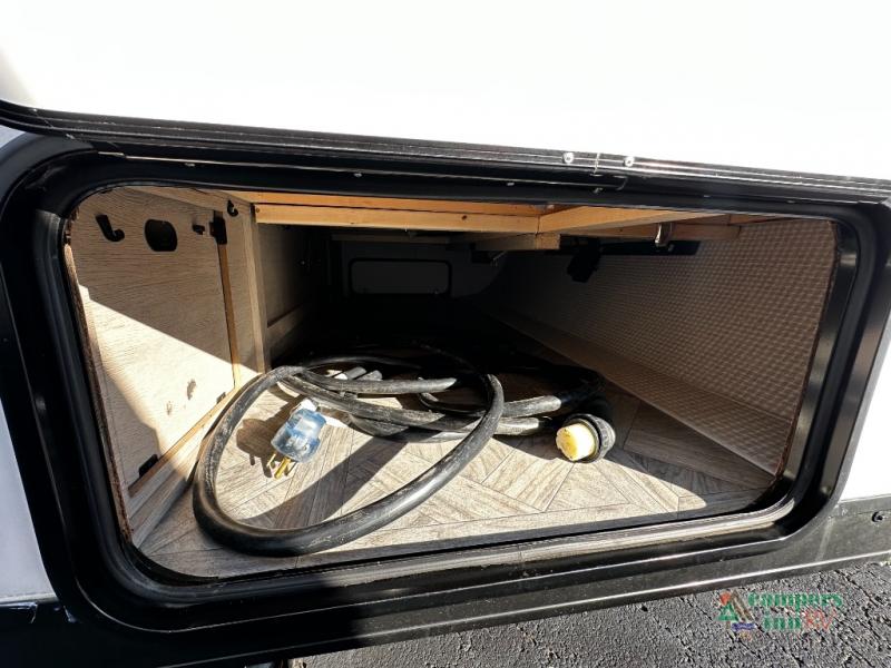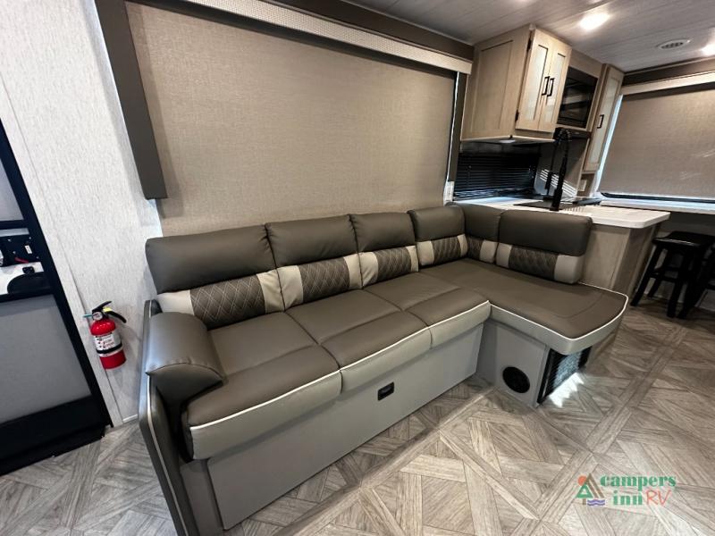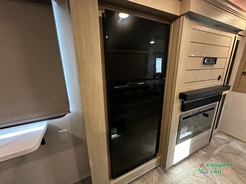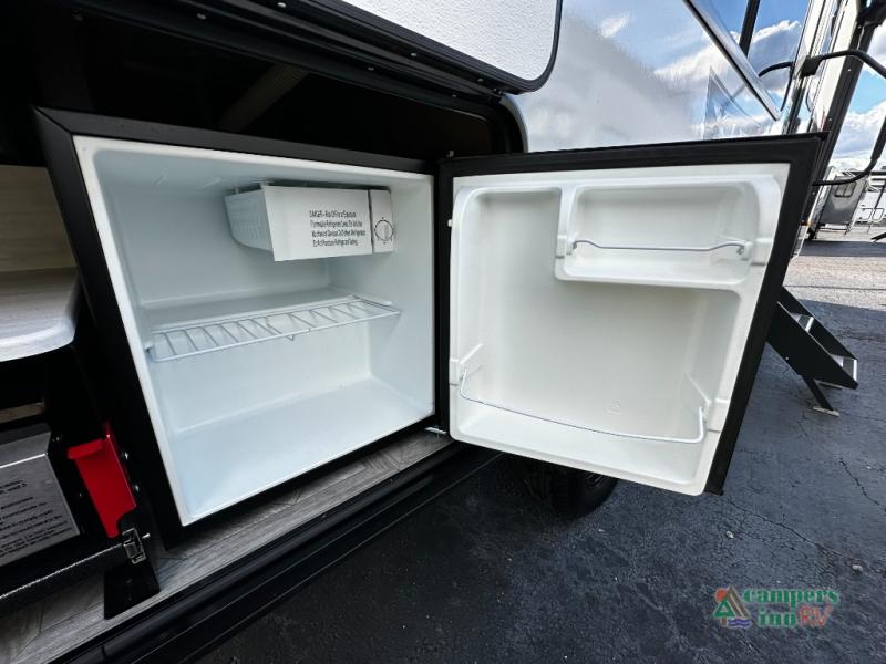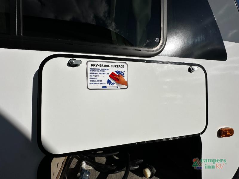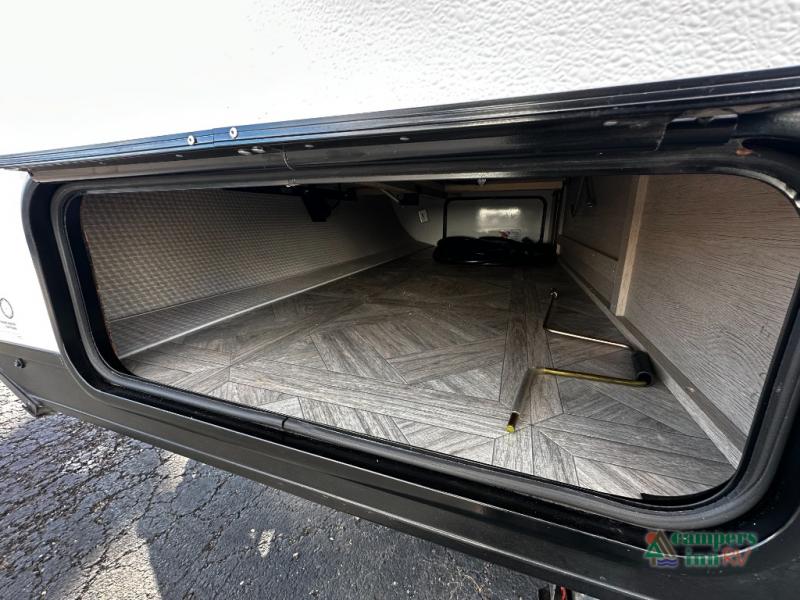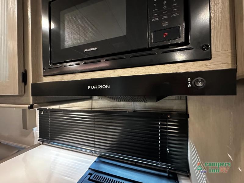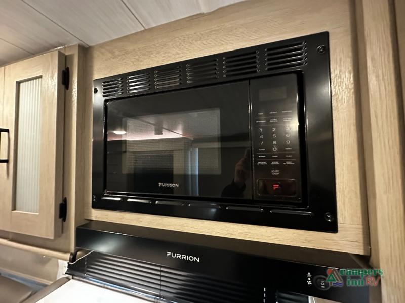 Enjoy your surroundings with 64 square feet of windows! So, no matter where you park, you can easily bring the outdoors right inside. The rear kitchen features 18 linear feet of wrap-around counter space including a double sink and a three burner cook-top with overhead microwave oven. There are bar stools for dining inside along the rear counter, and an L-shaped sofa for additional seating in the open living area. Here, behind the entertainment center, is a multi-purpose space hidden behind the shiplap feature wall insert with fireplace including a hinged top mattress above a lower bunk, a desk beneath the mattress if you need office space during the day, along with storage cubbies for your things, all within the Versa-Slide that also houses an oversized refrigerator for all of your perishables. The front private bedroom features a Versa-Tilt custom king bed with dual nightstands and closets, plus overhead storage. You will also find additional storage in a large pass-through beneath on the exterior, and the exterior camp kitchen is sure to be a big hit with the cook!