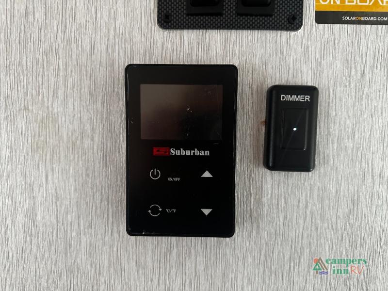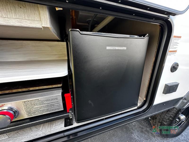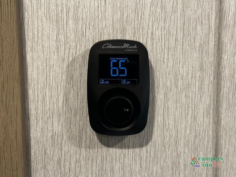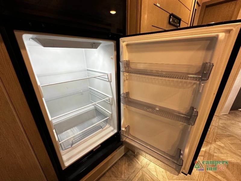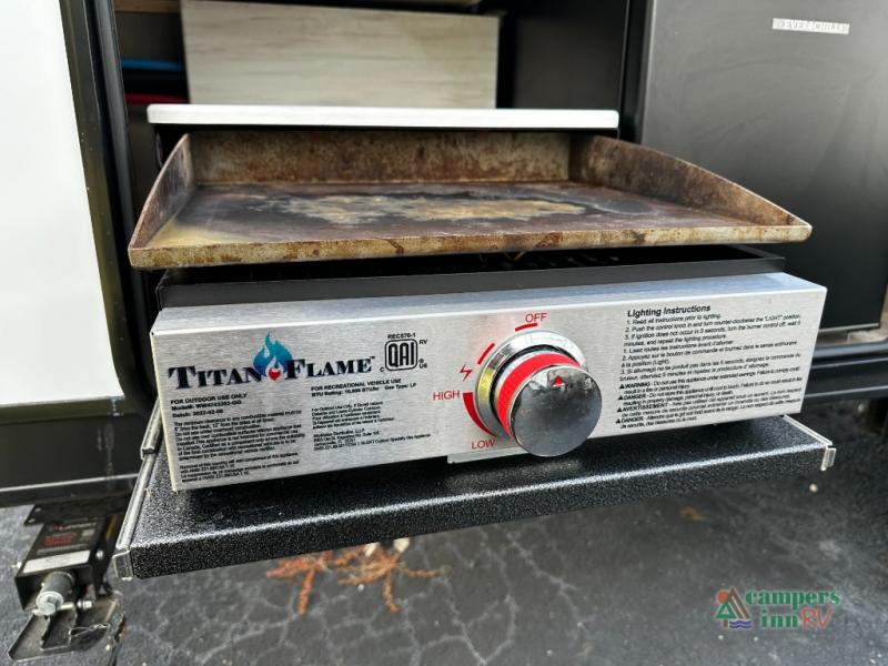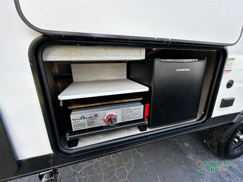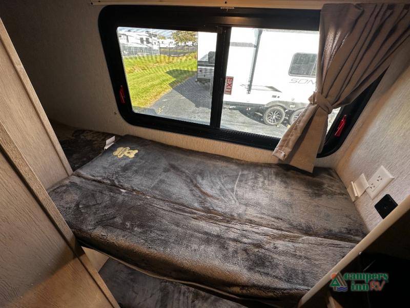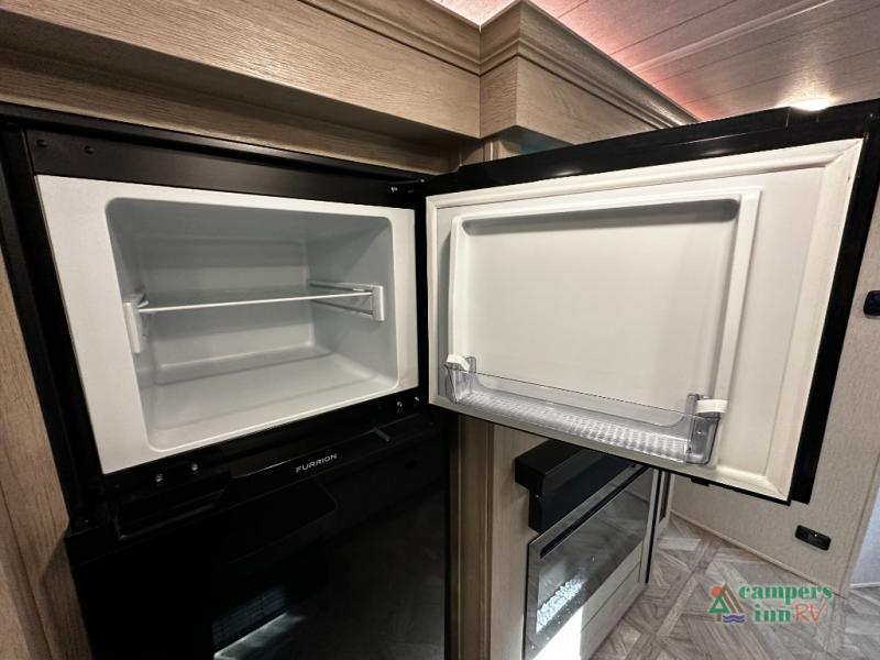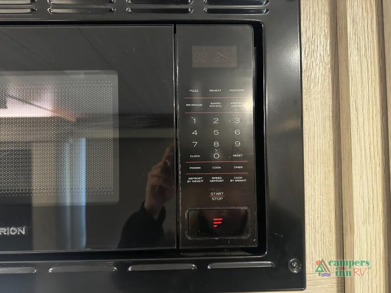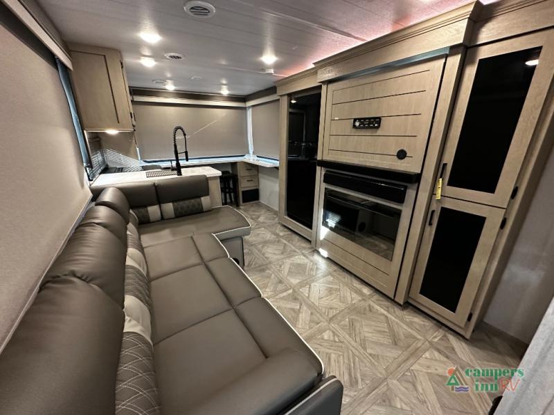 Enjoy your surroundings with 64 square feet of windows! So, no matter where you park, you can easily bring the outdoors right inside. The rear kitchen features 18 linear feet of wrap-around counter space including a double sink and a three burner cook-top with overhead microwave oven. There are bar stools for dining inside along the rear counter, and an L-shaped sofa for additional seating in the open living area. Here, behind the entertainment center, is a multi-purpose space hidden behind the shiplap feature wall insert with fireplace including a hinged top mattress above a lower bunk, a desk beneath the mattress if you need office space during the day, along with storage cubbies for your things, all within the Versa-Slide that also houses an oversized refrigerator for all of your perishables. The front private bedroom features a Versa-Tilt custom king bed with dual nightstands and closets, plus overhead storage. You will also find additional storage in a large pass-through beneath on the exterior, and the exterior camp kitchen is sure to be a big hit with the cook!
