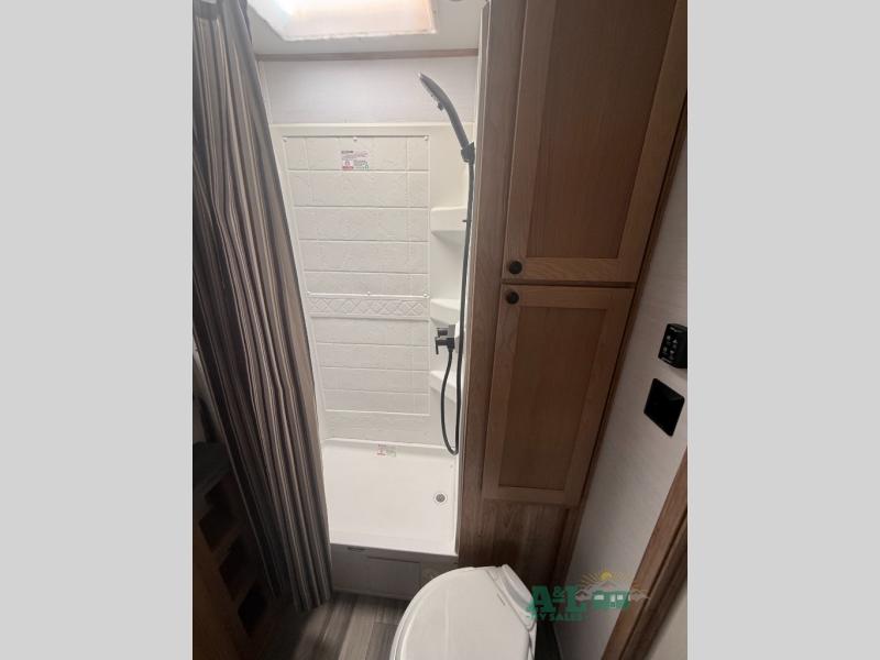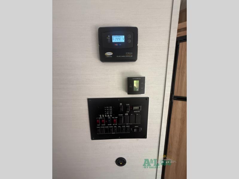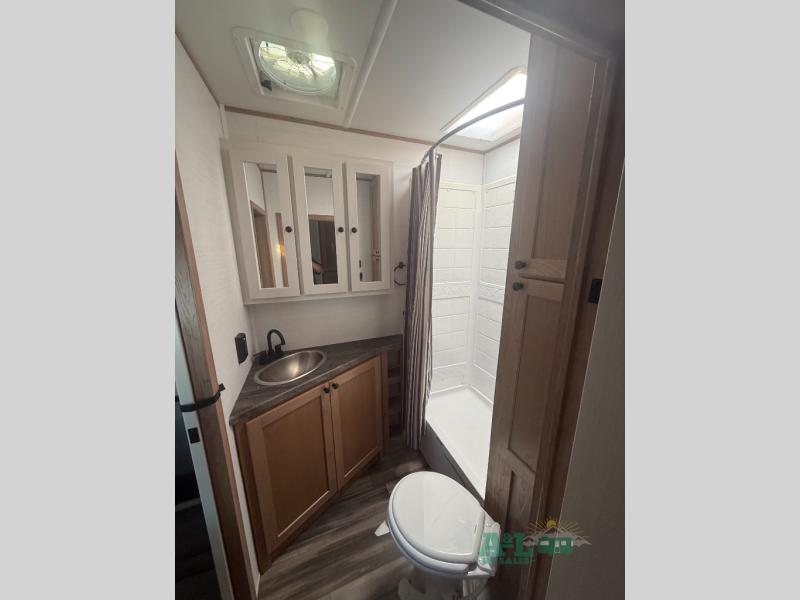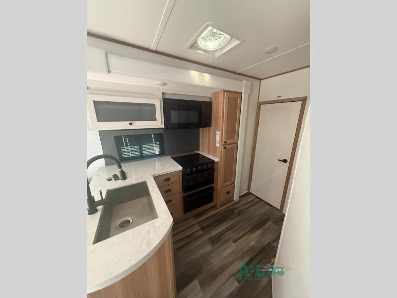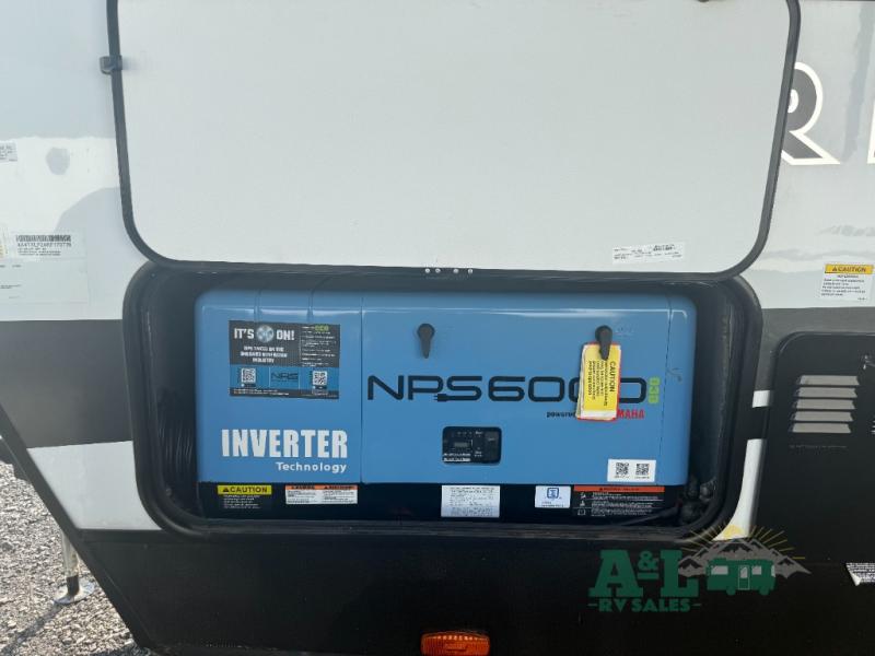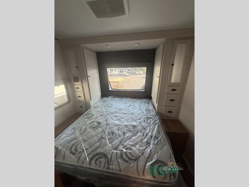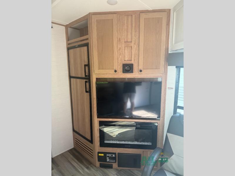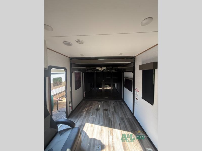 You're sure to have a great time in this spacious toy hauler for seven! There are 5,000 lb. tie-downs to keep your gear secure and a 93" garage interior width so it will be easy to fit in bikes, a four-wheeler, or kayaks! Your crew can get comfortable on the two roll-over benches with removable tables in between, and there is a Sleep N Store bed above the sofas for more sleeping space. You'll find even more seating space in the living area on the sofa and dual lounge chairs, and everyone will love the swing-open entertainment center with a hidden pantry behind. The large slide out not only houses the sofa, but also the kitchen appliances and plenty of counter space to prep meals each day. Head to the front private bedroom for a great night's rest on the queen bed. There are also dual wardrobes and nightstands and one of the dual entry doors for convenience!