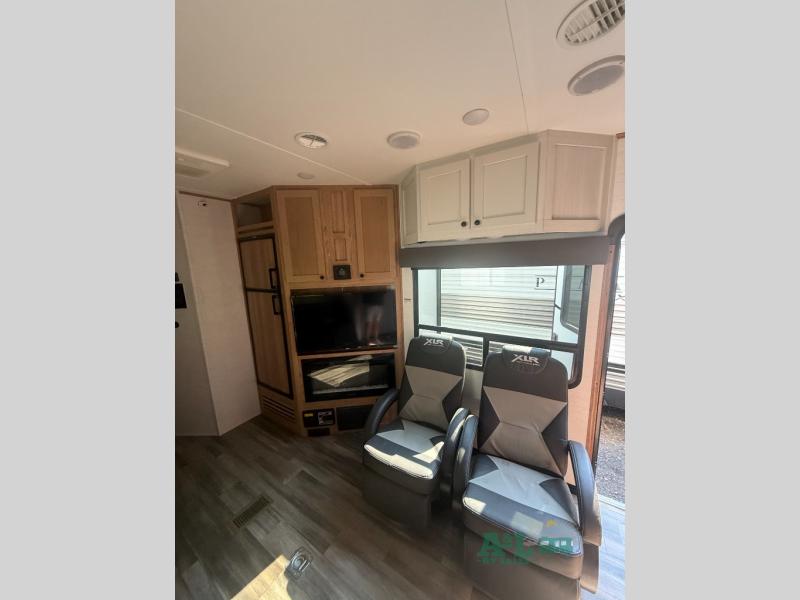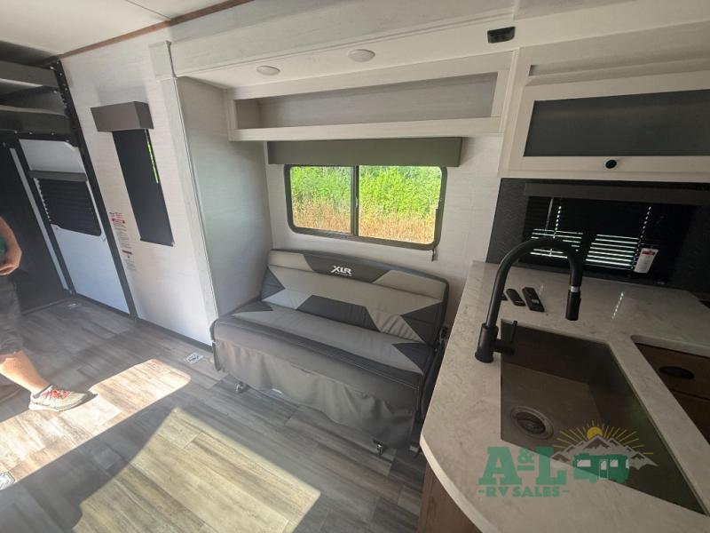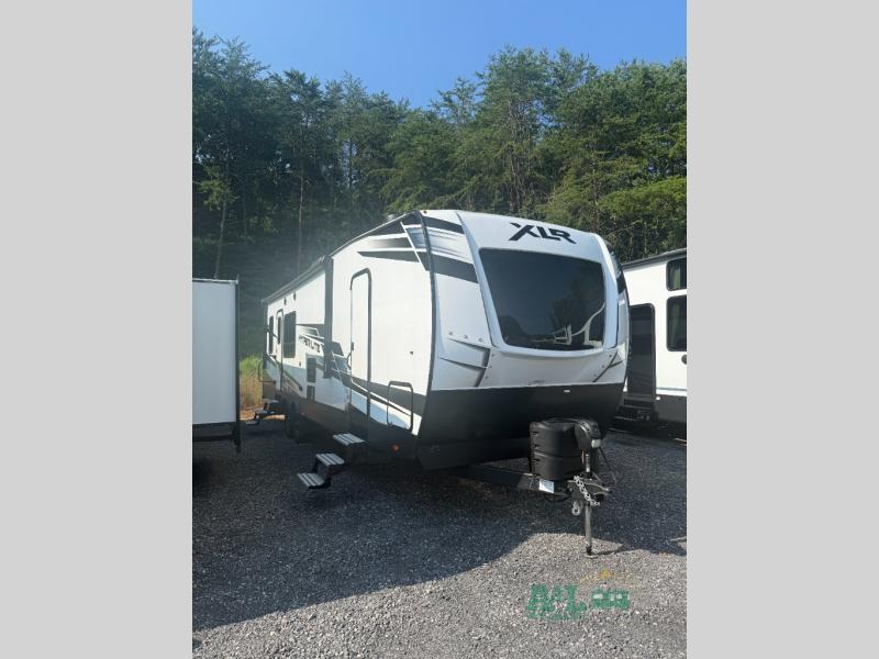 With the XLR Hyper Lite toy hauler travel trailer by Forest River, you can bring along your favorite ride-on toys and camp in style! The garages are spacious and include 5,000 lb. cargo tie downs that are anchored to steel plates, an insulated floor, a black rear privacy screen, a ramp patio cable kit for outdoor fun above ground, and Alumi-tread rear entry steps to mention a few highlights. More standout features include MORryde CRE3000 premium suspension that smooths out even the toughest of roads, heavy-duty Dexter axles offering the best in class carrying capacities, and the XLR fully enclosed "Body Armor" underbelly that is insulated and uses a panel system for ease of access. So when you want to play hard, choose an XLR Hyper Lite that offers upgraded features, quality construction, and allows you the control of venturing on or off road!