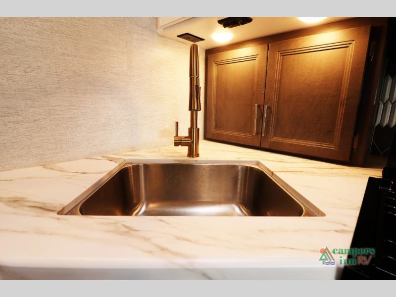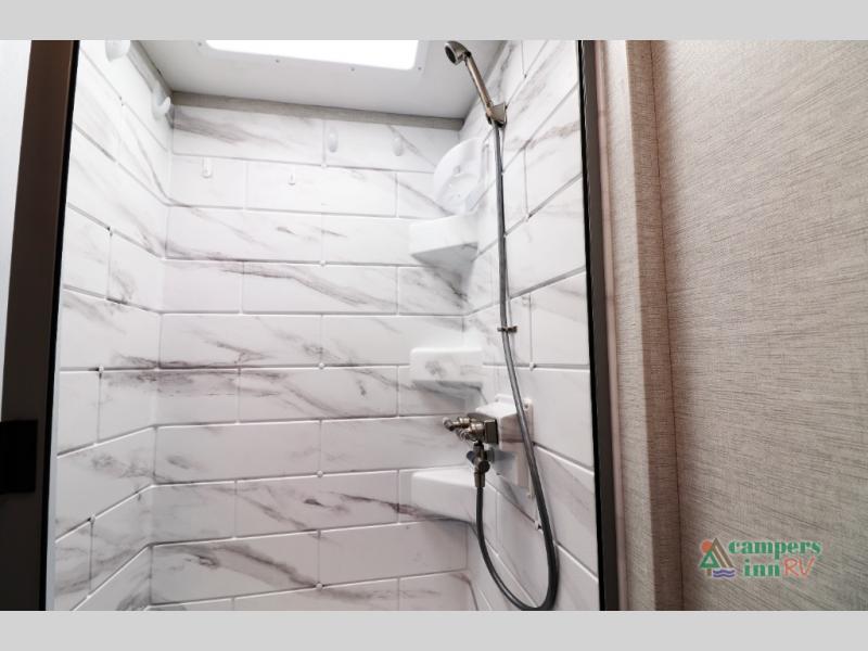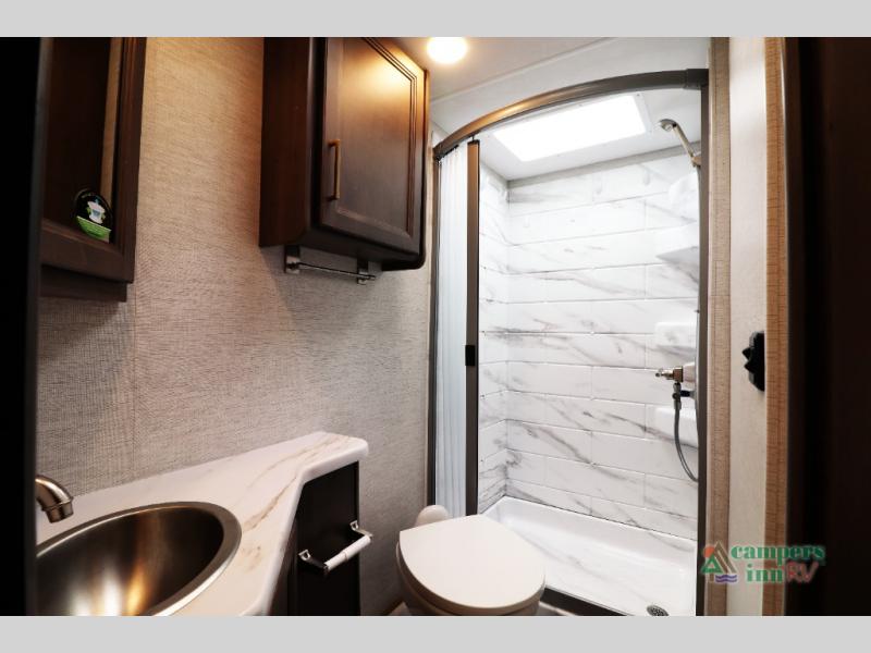 Full bathroom with roomy 30×36 shower so guests needn’t use campground restrooms.