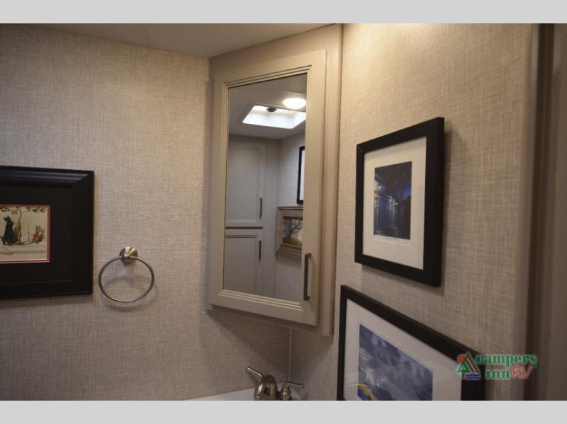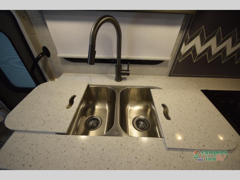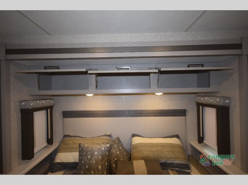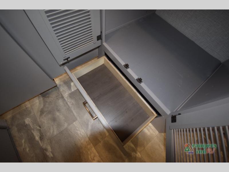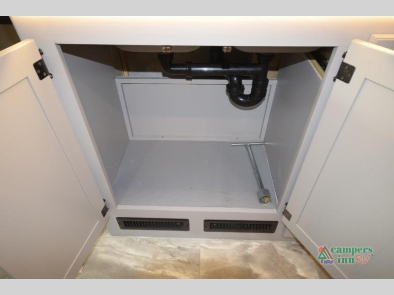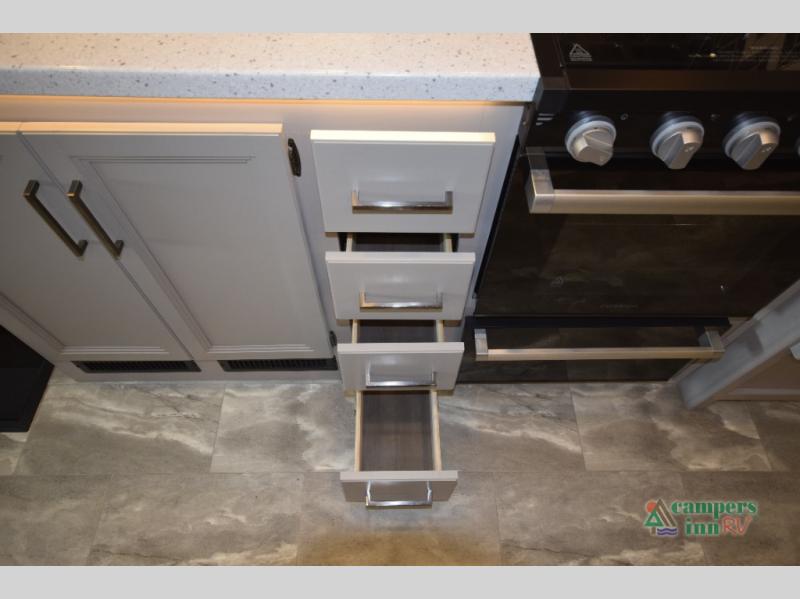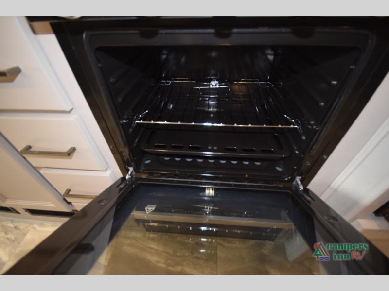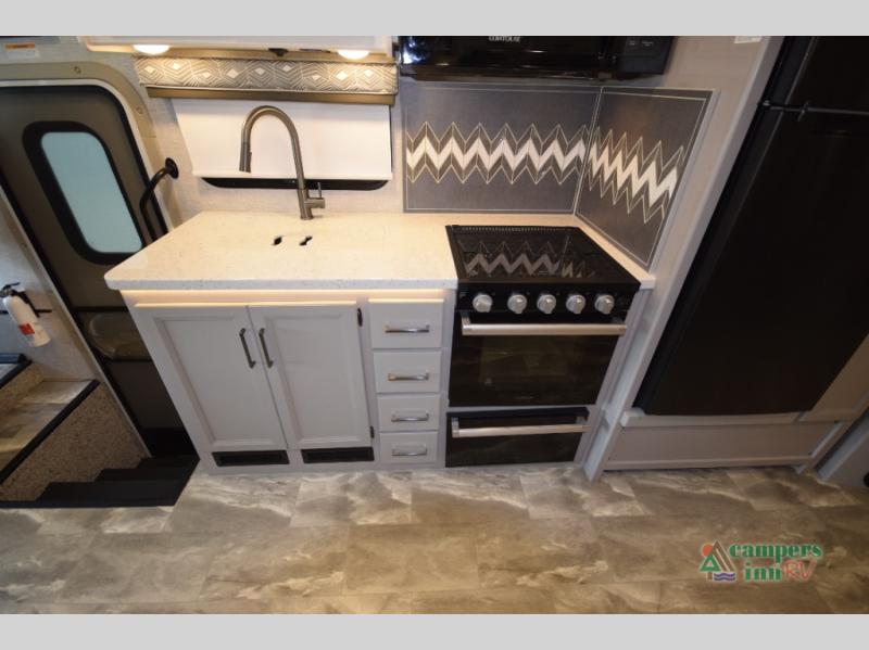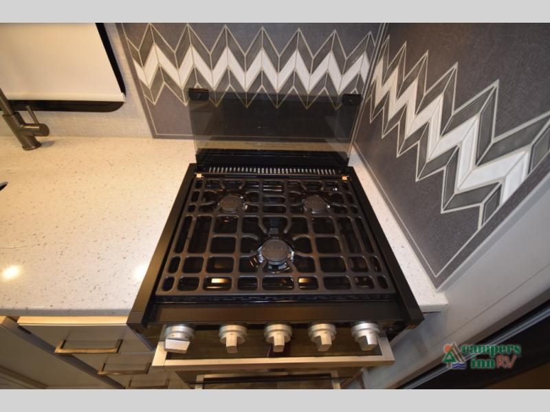 From the moment you step inside, you’re surrounded by features that elevate the travel experience. Decorative glass tile backsplash, designer bedding, and residential vinyl flooring make it feel more like a high-end apartment than a motorhome.
