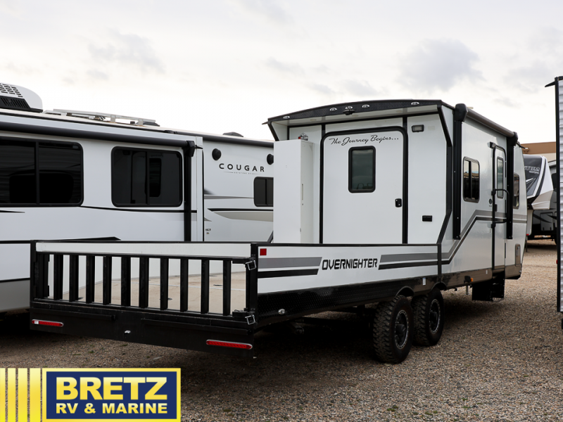 Each Overnighter travel trailer toy hauler features an 8" I-beam chassis with steel reinforcements with a wide-track suspension. The aluminum framed, laminated fiberglass sidewalls and molded front fiberglass cap with LED accents allow for easy maintenance, and the exterior metal diamond plating front and side skirt will keep the road debris from causing damage. Dual loading ramps become the rear tailgate for easy stowing, and there are several tie-downs to help keep your cargo secure as you travel. There is also a lockable tool storage box, a powered awning with LED strip, and four stabilizer jacks. You can also choose an optional fuel station to help keep the fun going all weekend long!