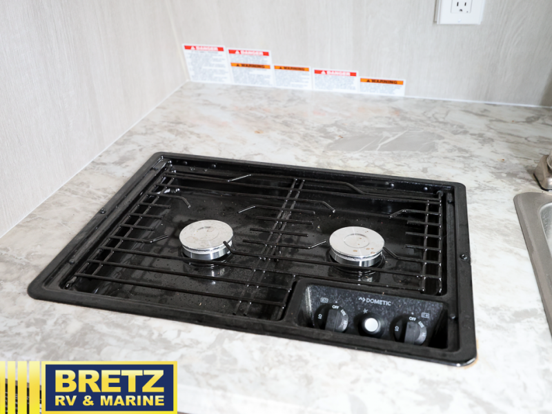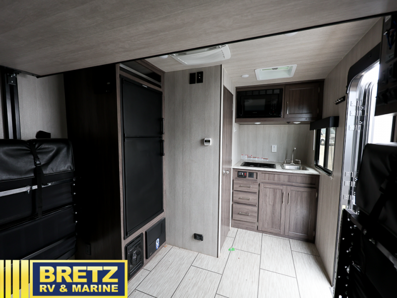 You're going to love traveling with this toy hauler! It features 14' 6" of cargo space to haul your favorite outdoor ride-on toys, a galley kitchen, and a 40" tub/shower and toilet so you don't have to use public restrooms. After you have whipped up a delicious meal using the 2 burner stove or microwave, you can head to either of the opposing flip up sofas with table between to enjoy. The sofas can be folded down to create sleeping space for two, and there is also a pull-down HappiJac queen bed for sleeping space for two more.