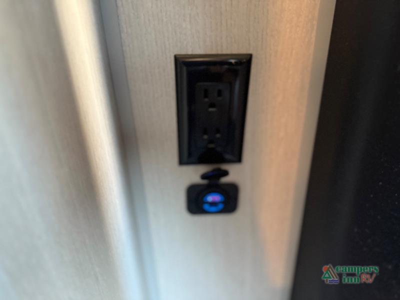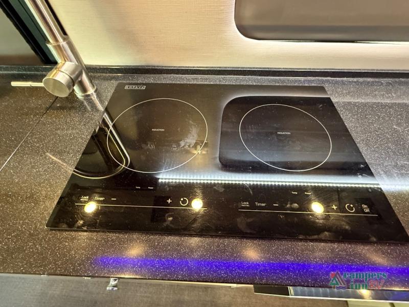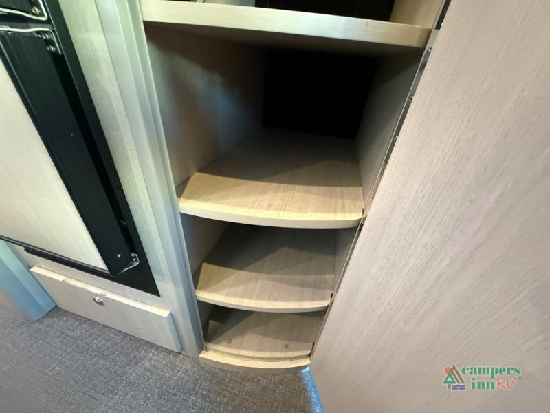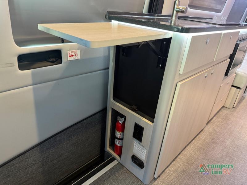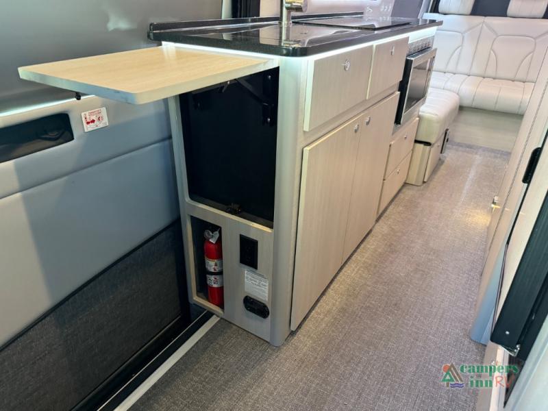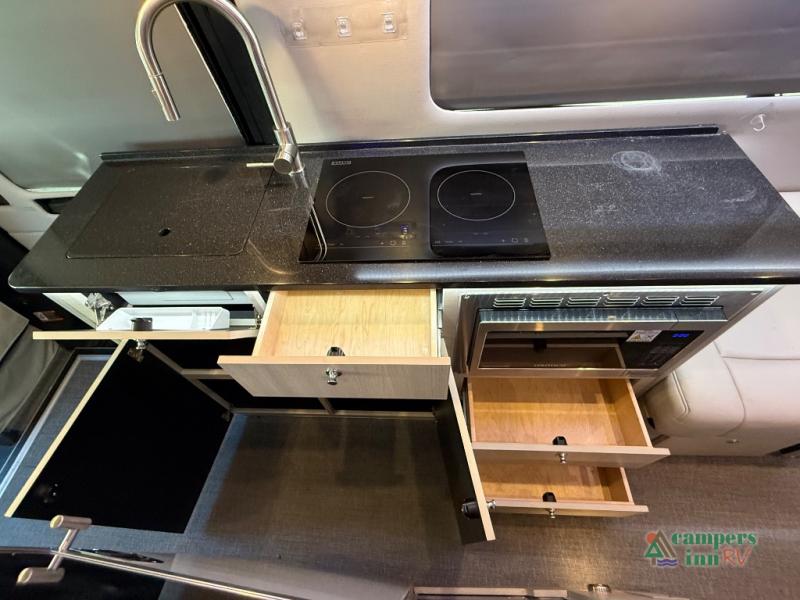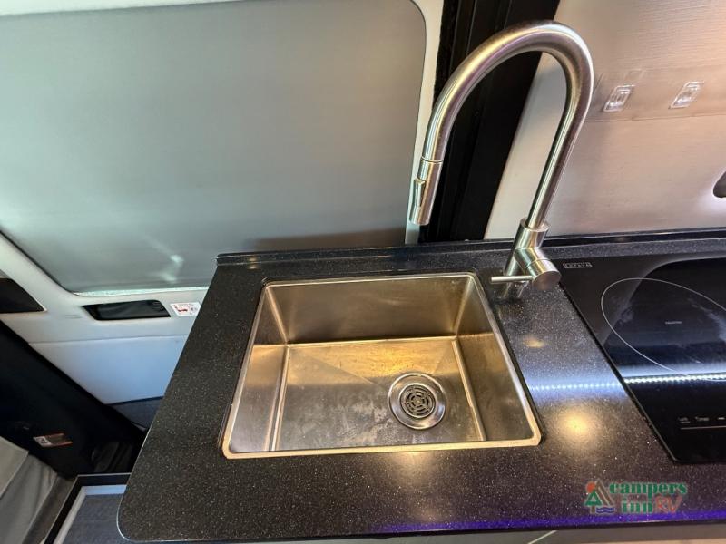 Luxury, functionality and sleeping for two is found in this versatile coach. There are seatbelts for seven for day trips with friends and a power sofa bed for couple's weekends. You will love the two captain's chairs that turn towards the rear for more seating once at your destination, and storage for your clothing is next to the wet bath. The private enclosed wet bath also includes a window and privacy shade. The cook can make meals using the galley kitchen with a farmhouse style sink, combo microwave/convection/air fryer and a two burner propane cooktop.