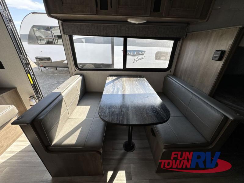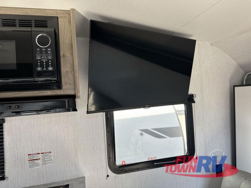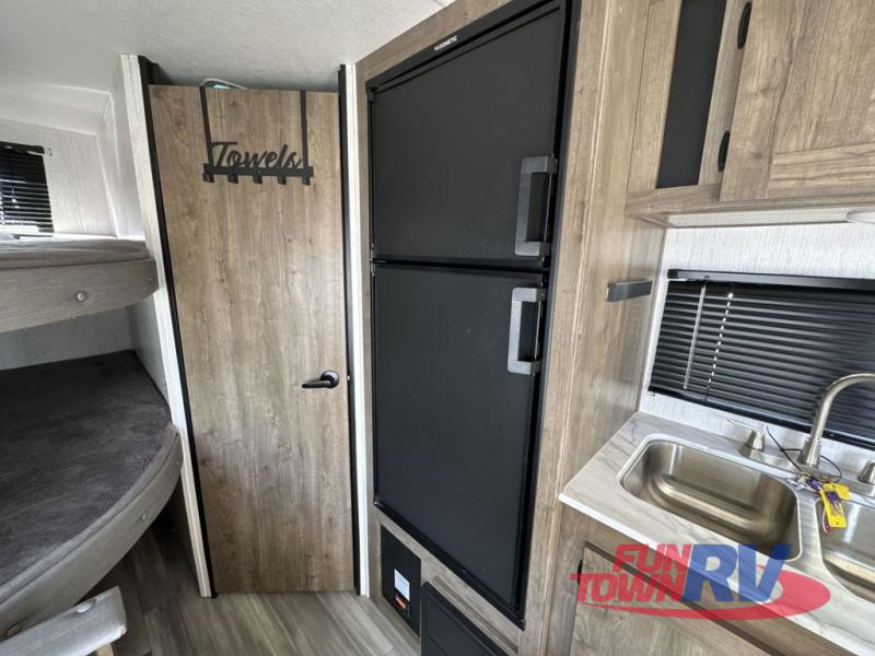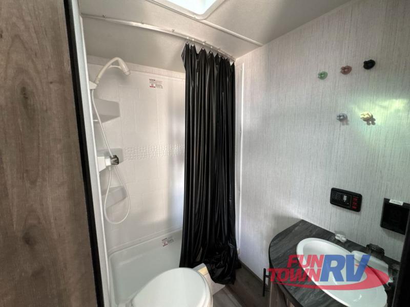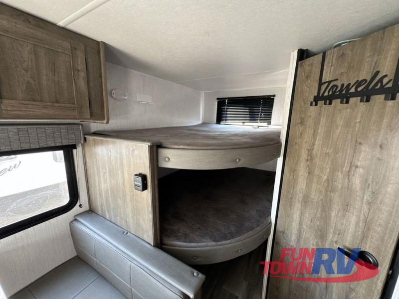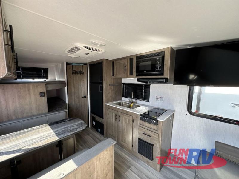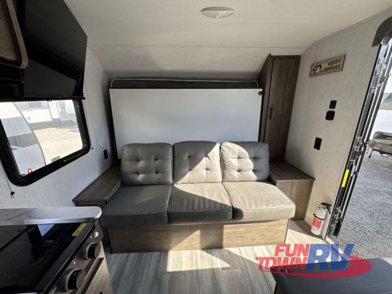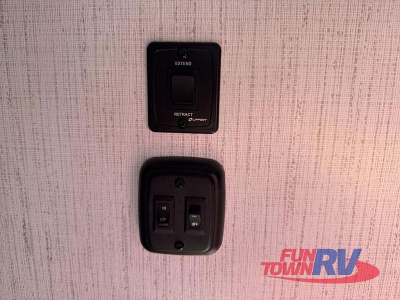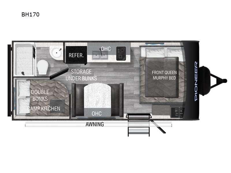 Easy to store and easy to tow, this Pioneer will allow you and your group enough sleeping space for seven with the front Murphy queen bed, the double-size bunks in the rear next to the full bathroom, and the booth dinette once setup for nighttime. You will find storage in the front shirt closet, under the bunks, and in overhead cabinets. There is a two-burner cooktop, a microwave and a refrigerator to make meals, plus you can use the outside camp kitchen. And don't forget about the 14' power awning that creates an outdoor living area protected from the elements.