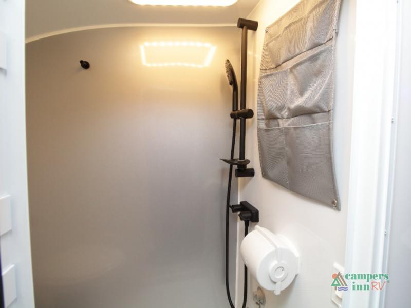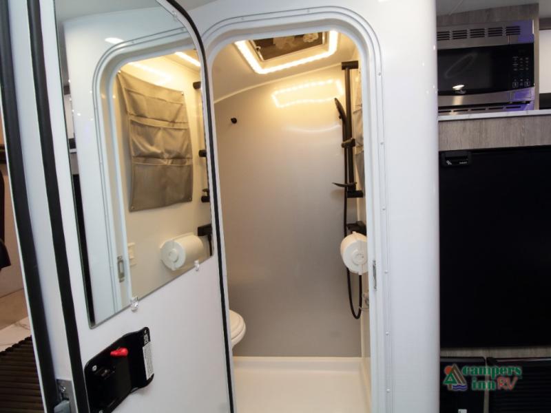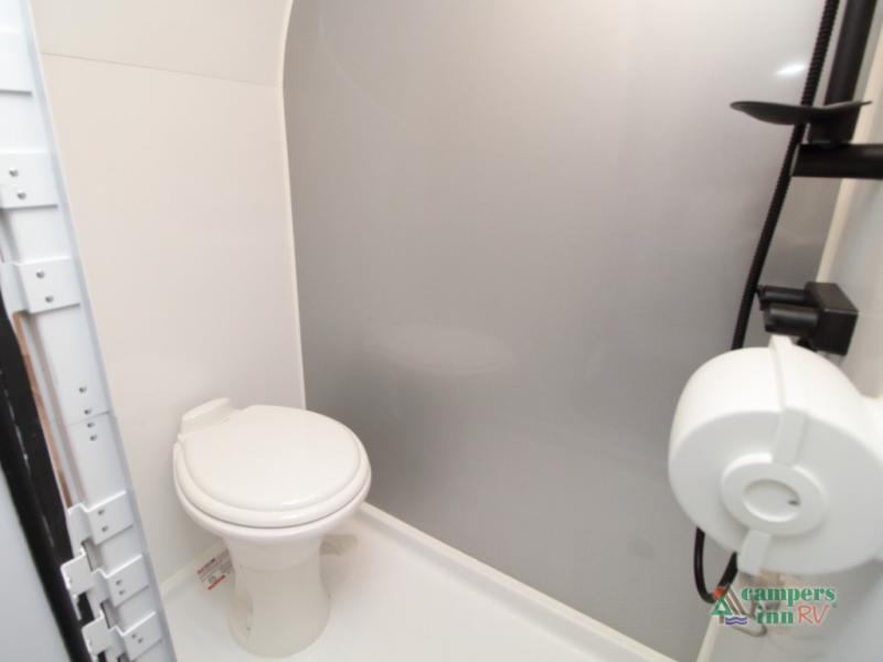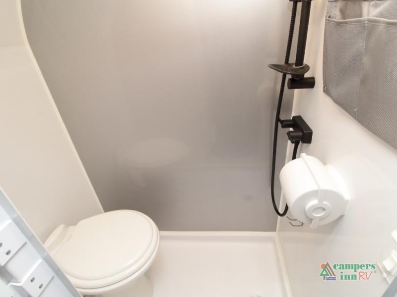 The fully equipped wet bath includes a porcelain toilet, mesh shower storage net, two towel hooks, and a roof vent for ventilation—everything you need to stay clean and refreshed on the road.