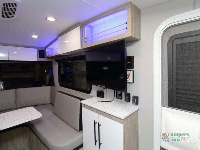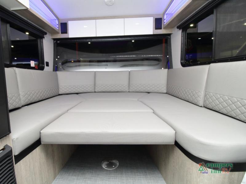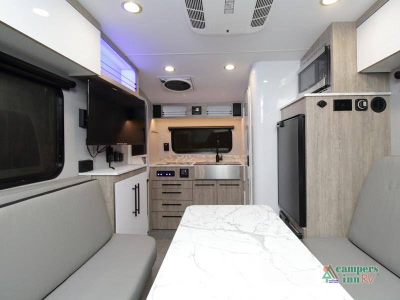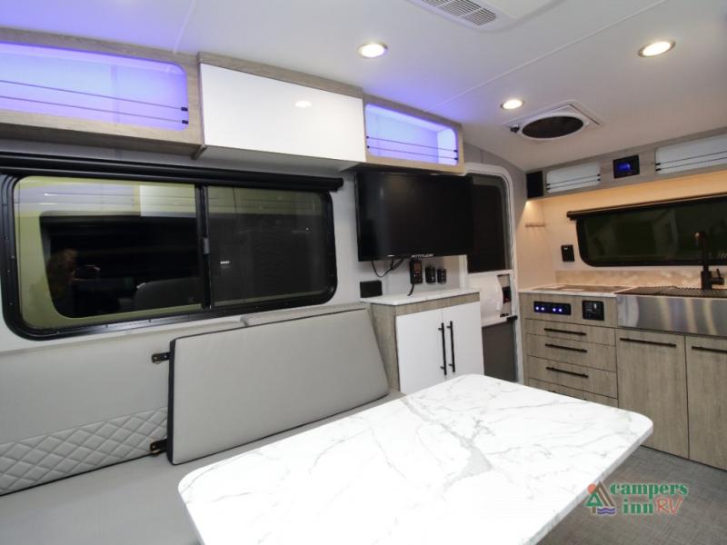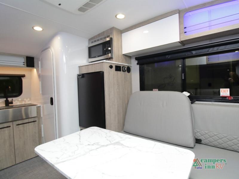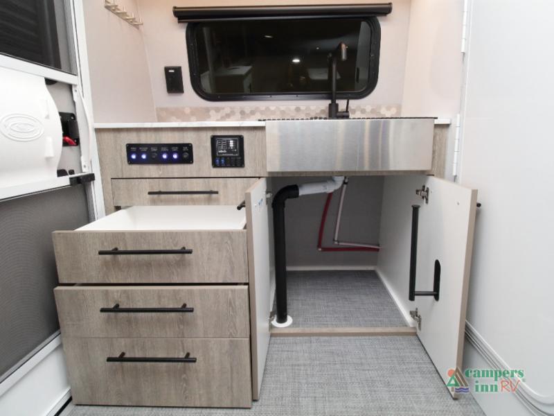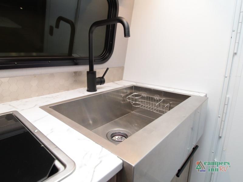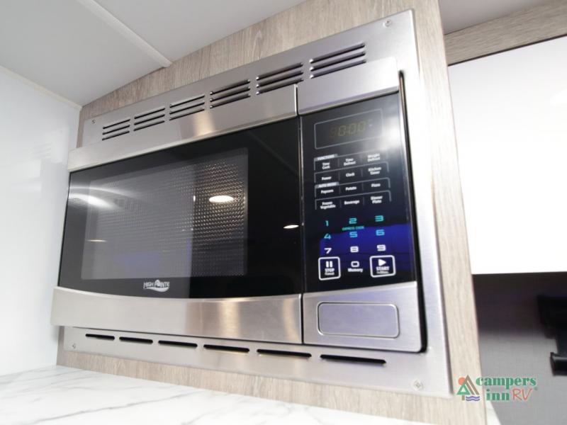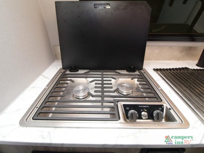 The convertible dinette serves as both dining space and sleeping area, giving you maximum function in a small footprint. Prepare meals on the two-burner stainless steel cooktop, rinse produce in the farmhouse style sink, and enjoy your favorite shows on the 28" TV while relaxing inside.