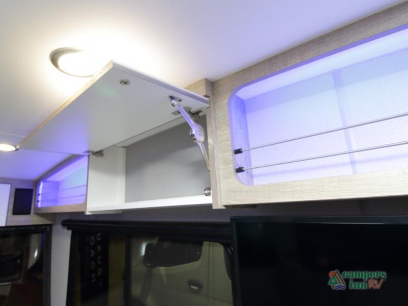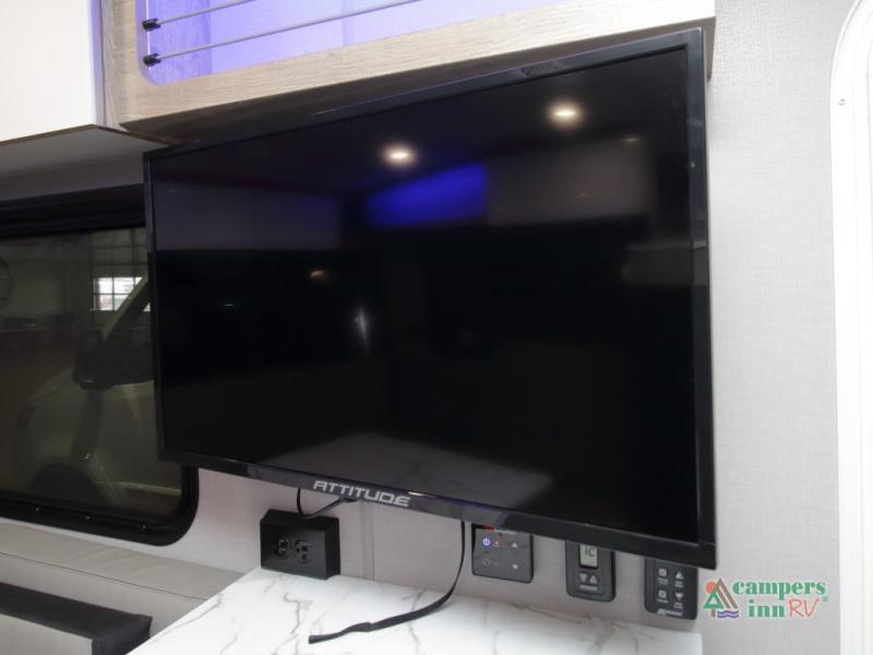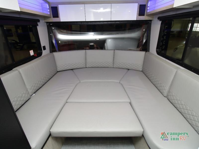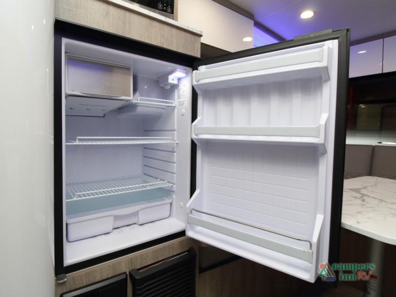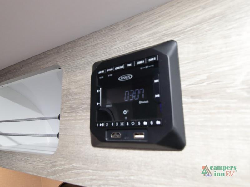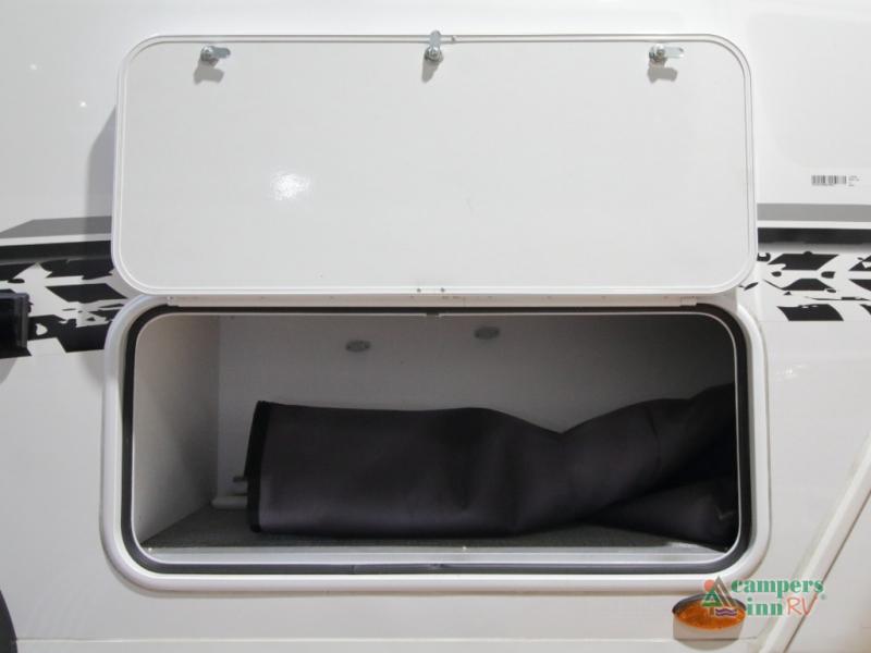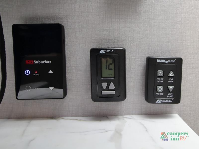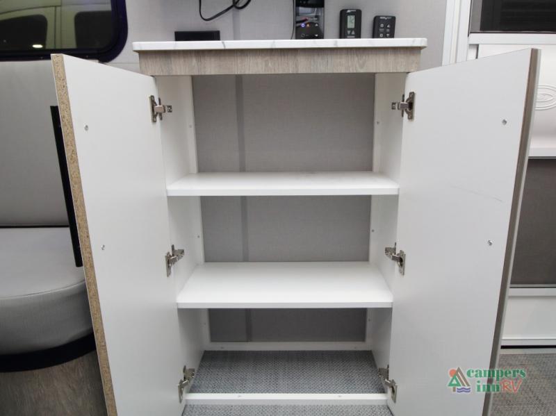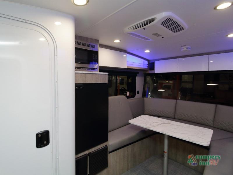 The convertible dinette serves as both dining space and sleeping area, giving you maximum function in a small footprint. Prepare meals on the two-burner stainless steel cooktop, rinse produce in the farmhouse style sink, and enjoy your favorite shows on the 28" TV while relaxing inside.