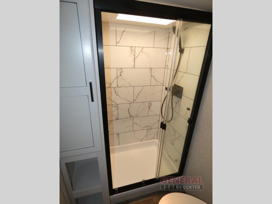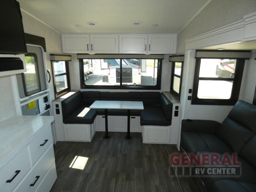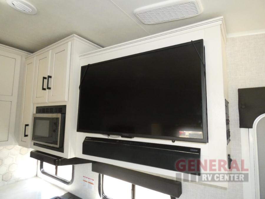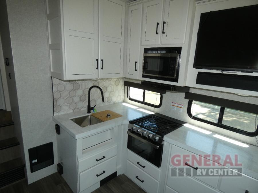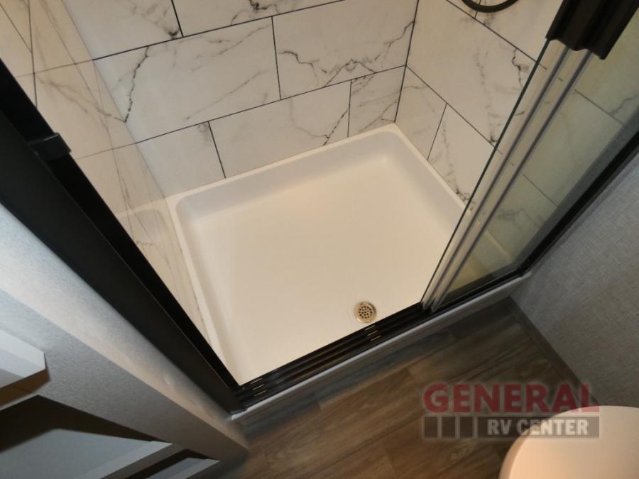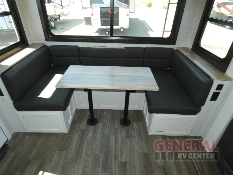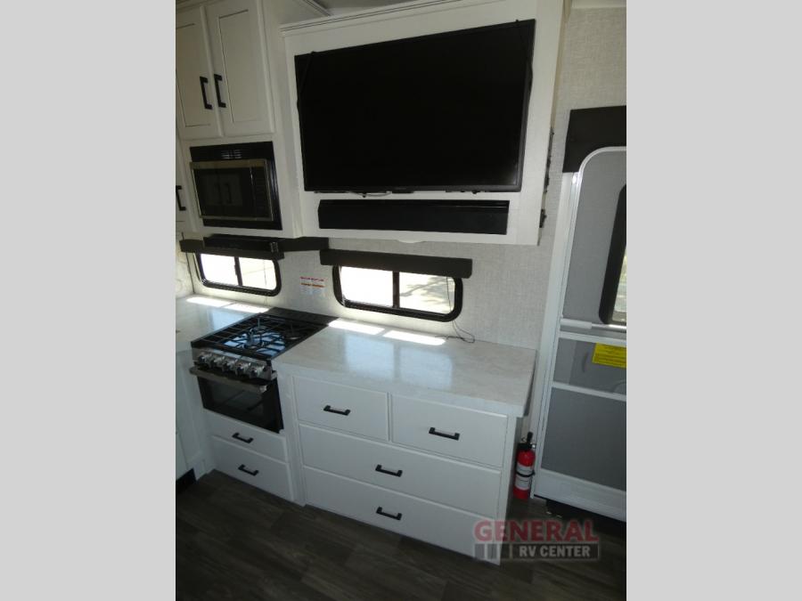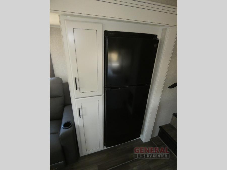 You'll have everything you need in this fifth wheel for enjoyable trips to the lake. Once you arrive at your destination, set up the 16' power awning with LED lights, grab the fishing poles from the pass-through storage, and relax with a cold drink. You and your group can head inside to play a game around the U-shaped dinette or relax on the theater seat across from the TV. The full kitchen includes a black 17" range, a GE microwave, plus a 12V refrigerator for perishables, and the full bath will let you clean up each day. When you're ready to call it a night, head to the front private bedroom for a great night's rest on the queen bed with dual wardrobes, while your guests sleep on the dinette!