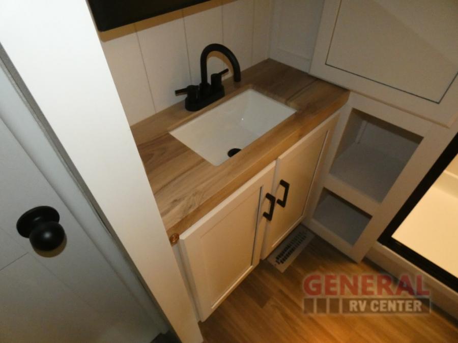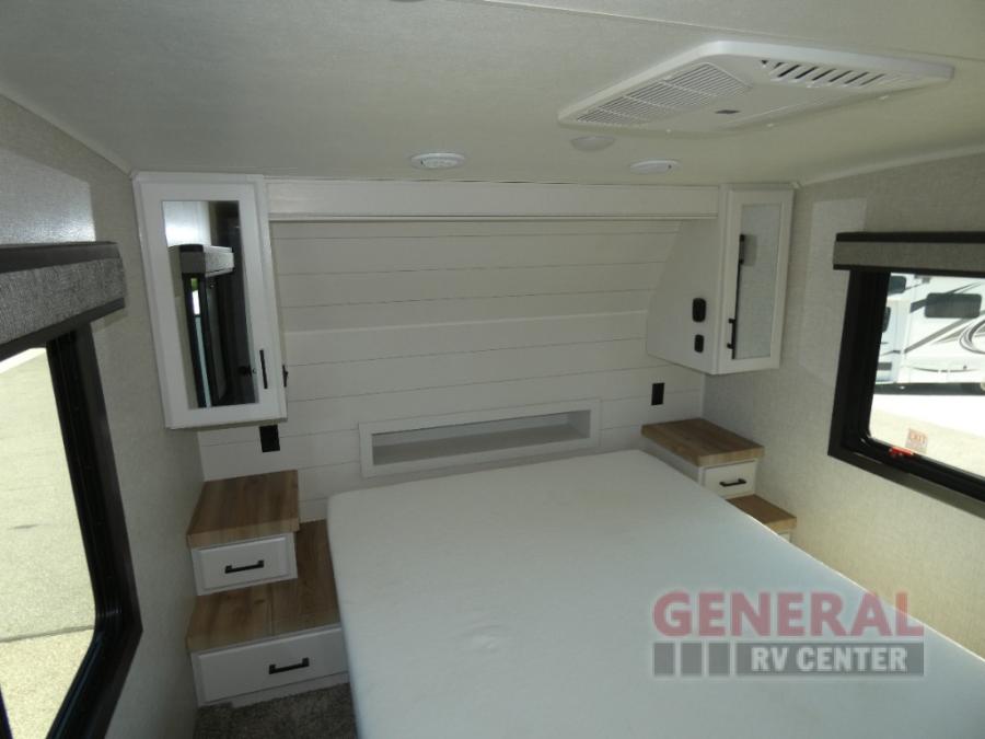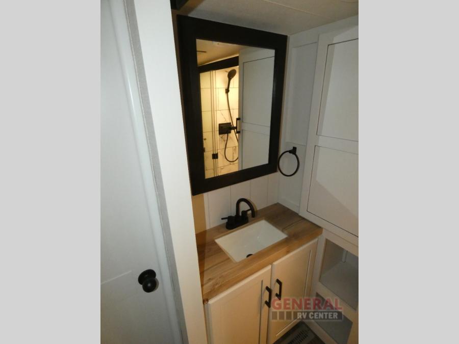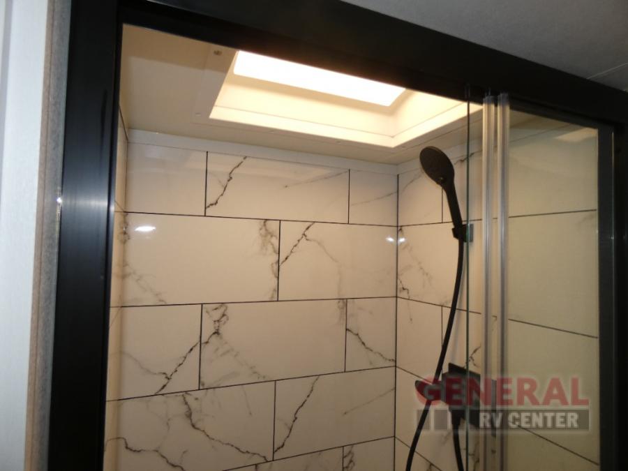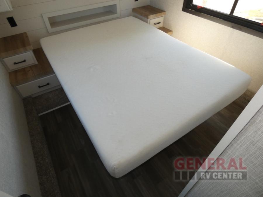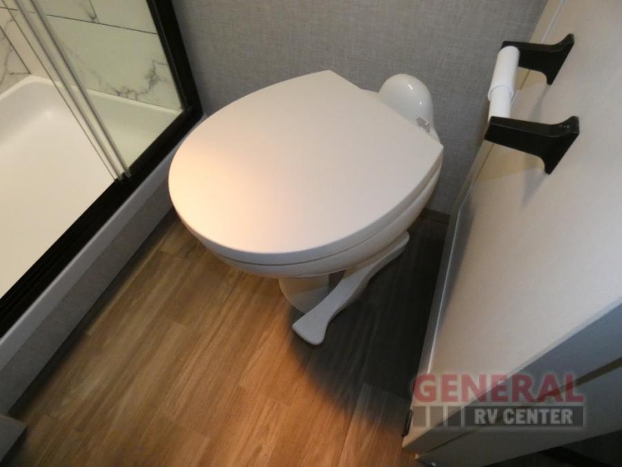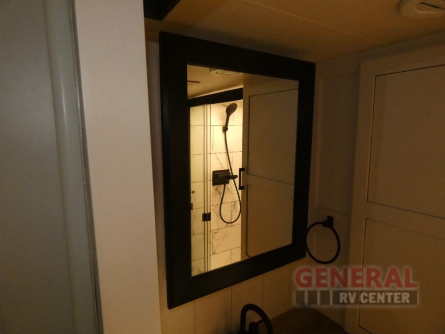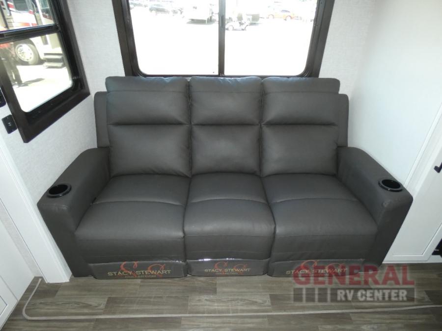 You'll have everything you need in this fifth wheel for enjoyable trips to the lake. Once you arrive at your destination, set up the 16' power awning with LED lights, grab the fishing poles from the pass-through storage, and relax with a cold drink. You and your group can head inside to play a game around the U-shaped dinette or relax on the theater seat across from the TV. The full kitchen includes a black 17" range, a GE microwave, plus a 12V refrigerator for perishables, and the full bath will let you clean up each day. When you're ready to call it a night, head to the front private bedroom for a great night's rest on the queen bed with dual wardrobes, while your guests sleep on the dinette!