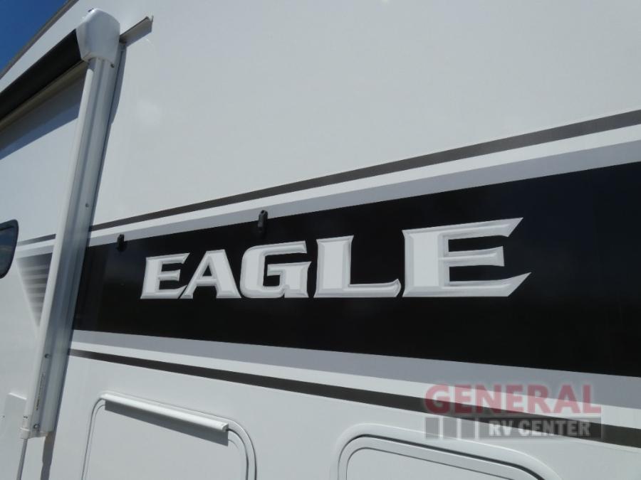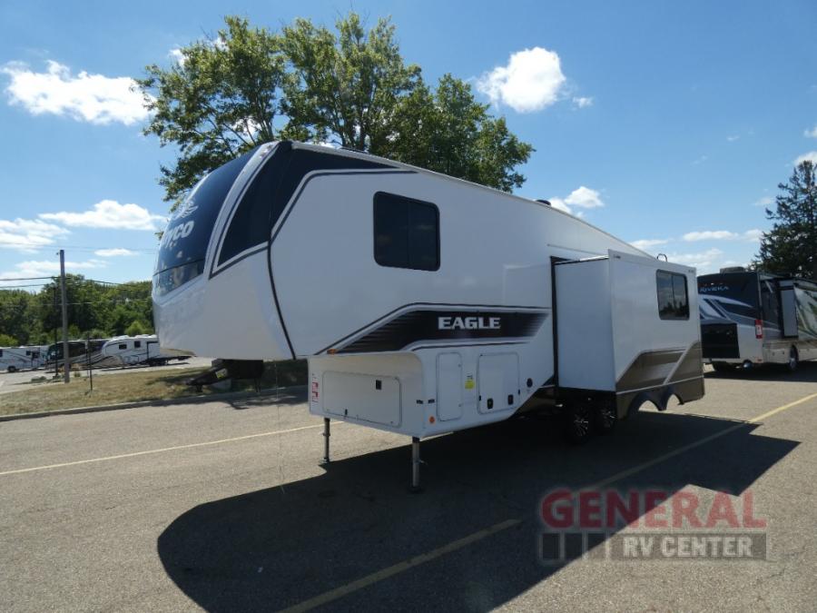 With any Eagle HT fifth wheel by Jayco you will enjoy a smooth drive thanks to the 4 Star Handling Package, Goodyear Endurance tires, and MORryde CRE-3000 rubberized suspension. The Customer Value Package includes amenities that are sure to make camping easier than ever, like the 60K on-demand water heater, Keyed-Alike lock system, electric awning with integrated LED lights, and more. Handcrafted and glazed door/drawer fronts will make your space feel more like home, along with residential vinyl flooring throughout, motion activated LED lights, and blackout roller shades with reflective side throughout to keep the sun out when you want to sleep in. The HELIX Cooling System features Jayco's exclusive insulated dual duct design, directional and closeable A/C vents, and larger return air vents with user friendly filters to keep your crew comfortable all summer long. Choose an entry-level Eagle HT fifth wheel today!