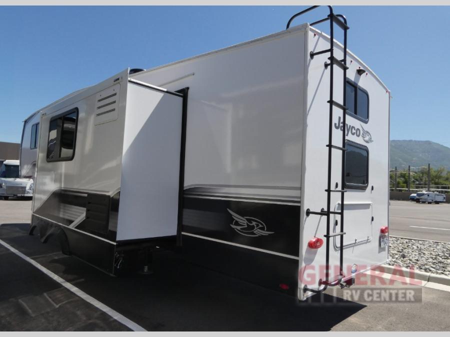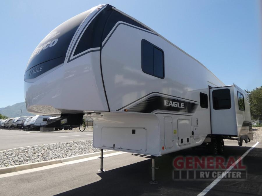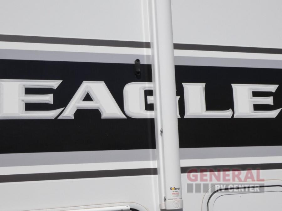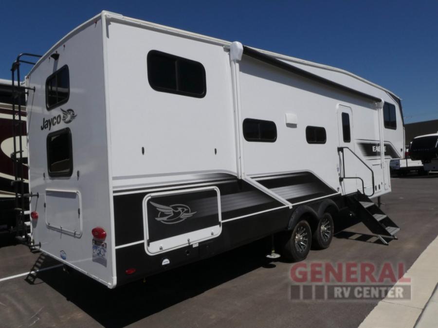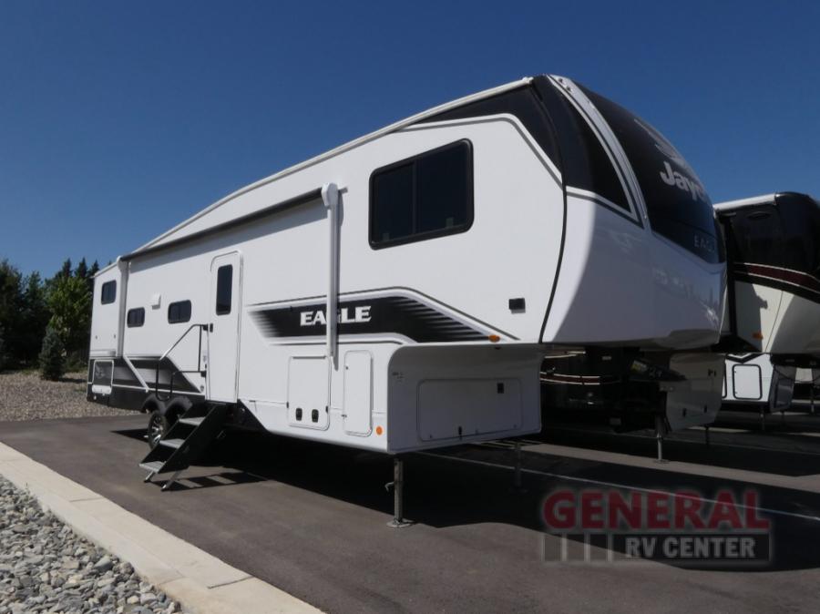 With any Eagle HT fifth wheel by Jayco you will enjoy a smooth drive thanks to the 4 Star Handling Package, Goodyear Endurance tires, and MORryde CRE-3000 rubberized suspension. The Customer Value Package includes amenities that are sure to make camping easier than ever, like the 60K on-demand water heater, Keyed-Alike lock system, electric awning with integrated LED lights, and more. Handcrafted and glazed door/drawer fronts will make your space feel more like home, along with residential vinyl flooring throughout, motion activated LED lights, and blackout roller shades with reflective side throughout to keep the sun out when you want to sleep in. The HELIX Cooling System features Jayco's exclusive insulated dual duct design, directional and closeable A/C vents, and larger return air vents with user friendly filters to keep your crew comfortable all summer long. Choose an entry-level Eagle HT fifth wheel today!
