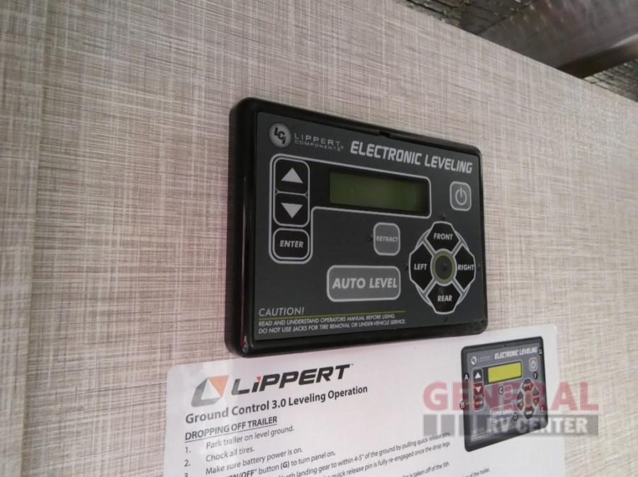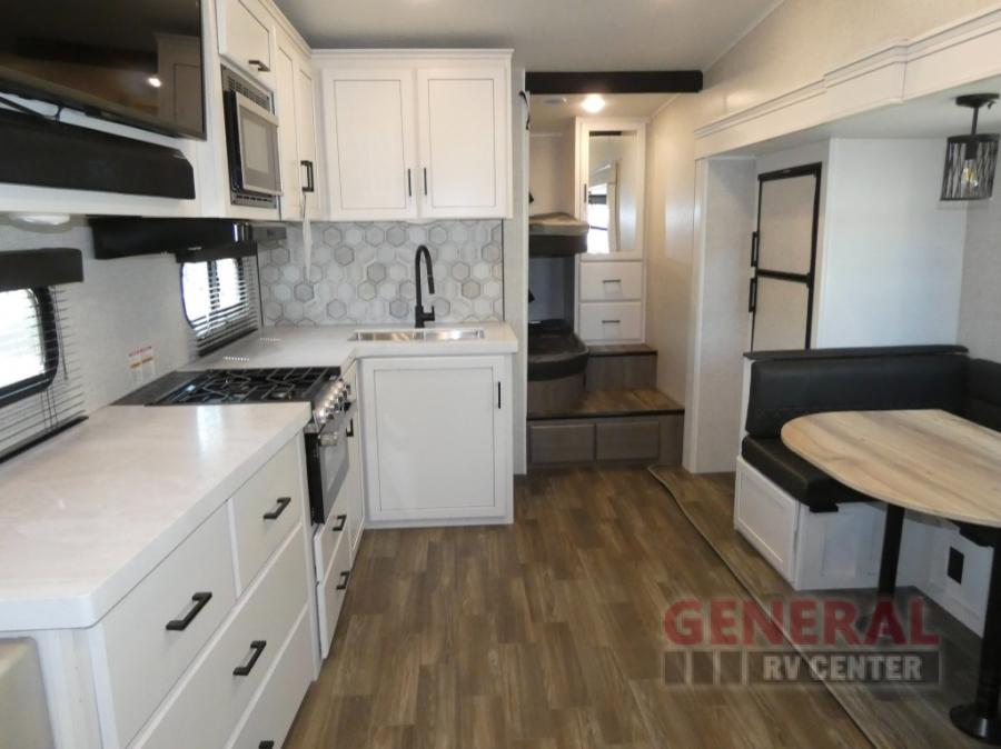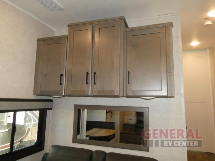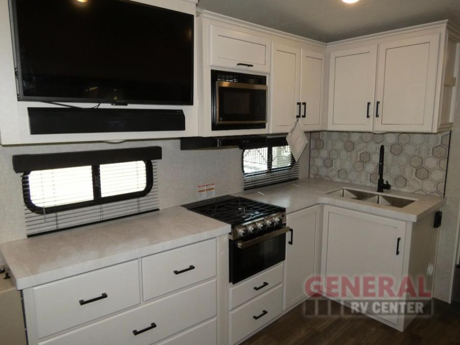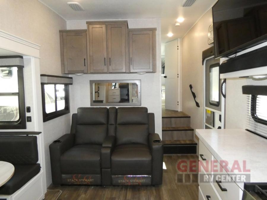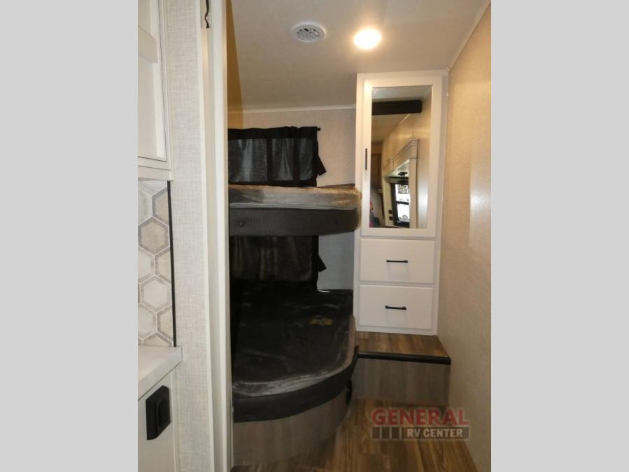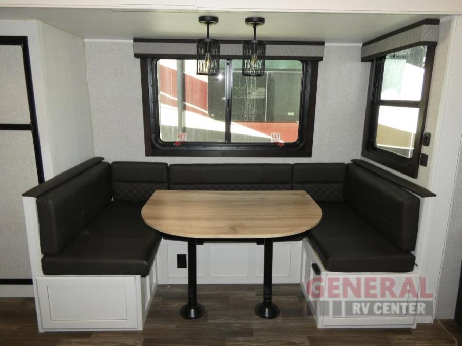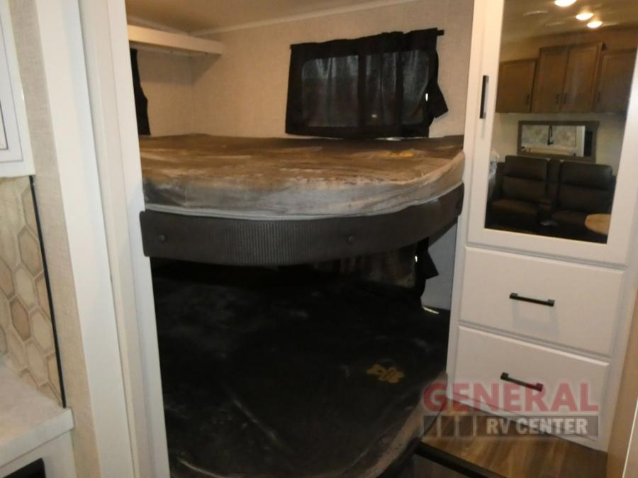 If you're needing a fifth wheel with more sleeping space, this unit will be perfect for you! There are double-size bunks in the back with a wardrobe for your guests' things and TV prep if you want to add a TV here. The front private bedroom up front will have you feeling right at home with its queen bed and dual wardrobes, and any additional guests you have can sleep on the U-shaped dinette within the slide out. There is also a theater seat here where you can relax with a good book in the evenings. The Jayport with LP Quick Connect outside will let you add the optional griddle, and the 19' power awning will provide shade during the day!