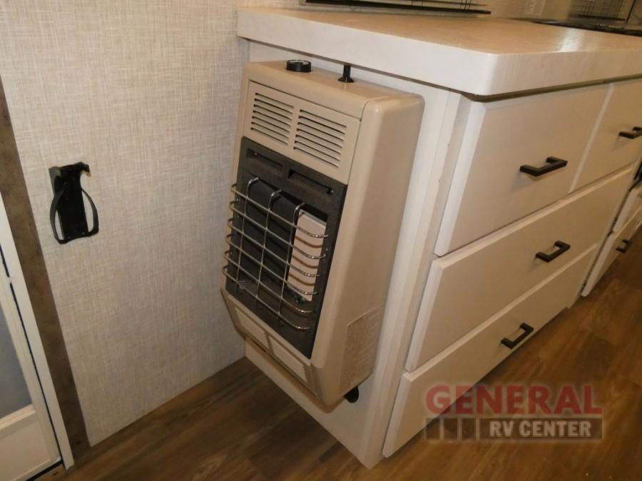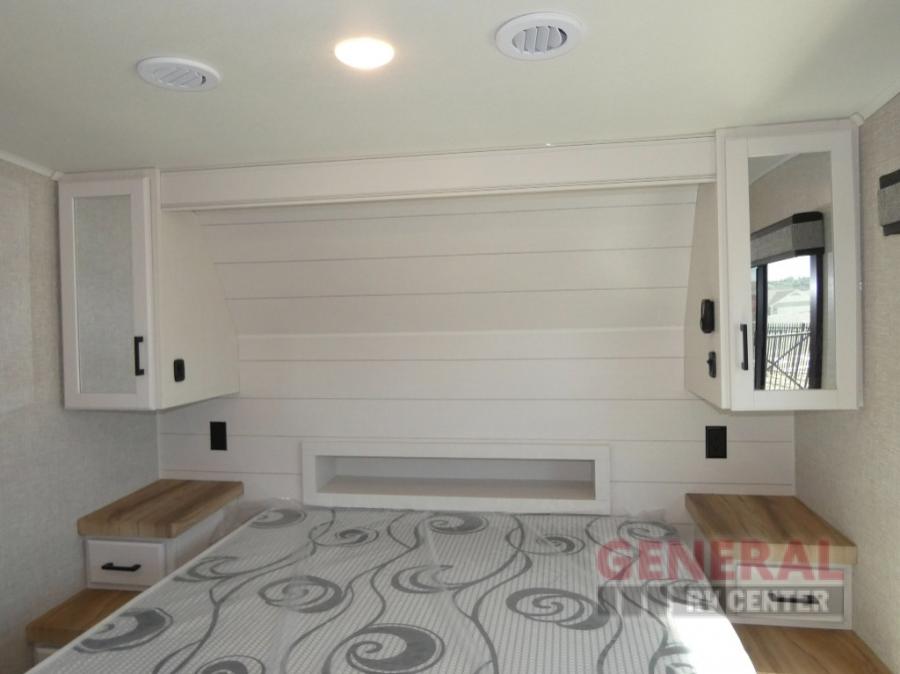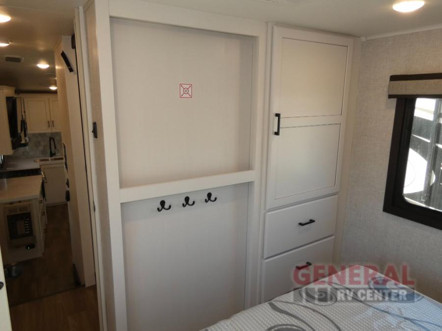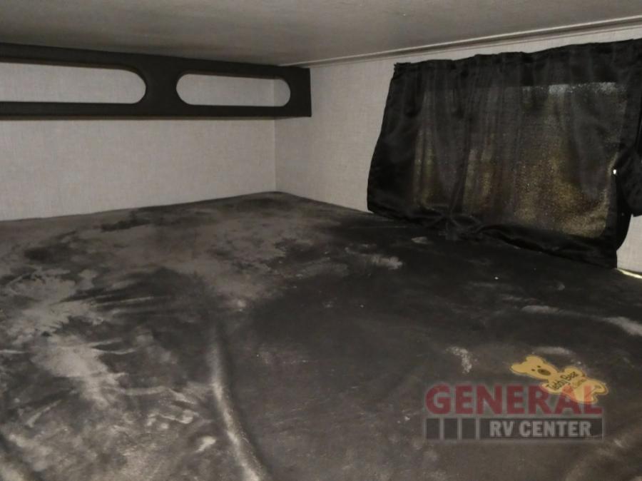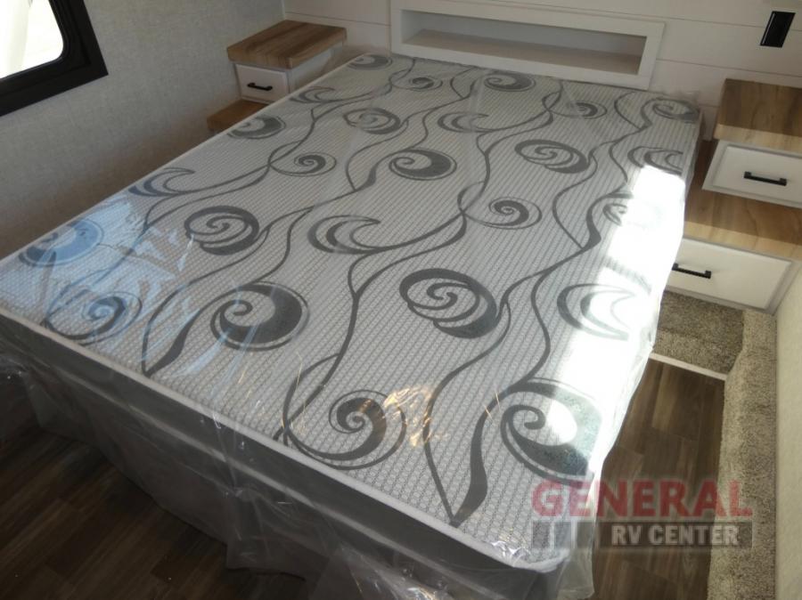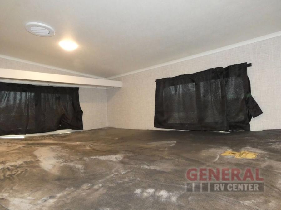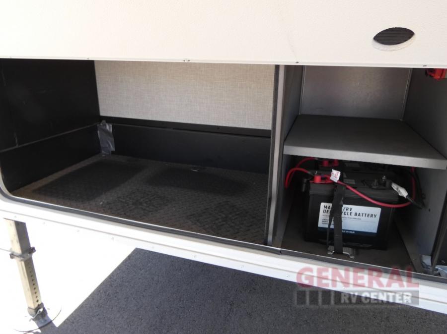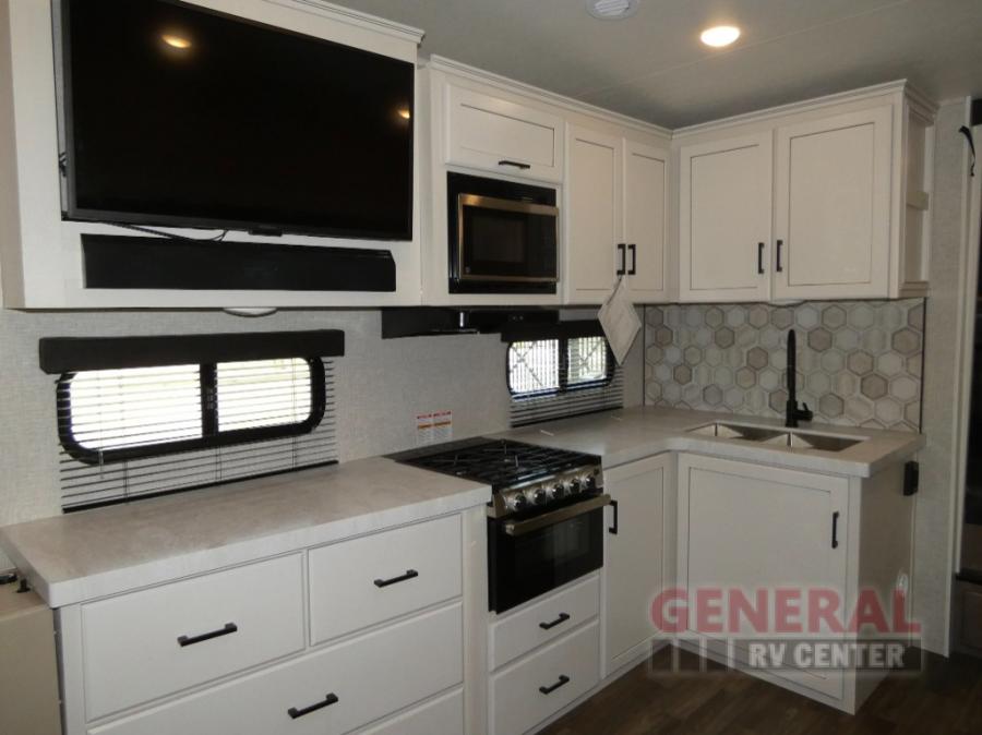 If you're needing a fifth wheel with more sleeping space, this unit will be perfect for you! There are double-size bunks in the back with a wardrobe for your guests' things and TV prep if you want to add a TV here. The front private bedroom up front will have you feeling right at home with its queen bed and dual wardrobes, and any additional guests you have can sleep on the U-shaped dinette within the slide out. There is also a theater seat here where you can relax with a good book in the evenings. The Jayport with LP Quick Connect outside will let you add the optional griddle, and the 19' power awning will provide shade during the day!