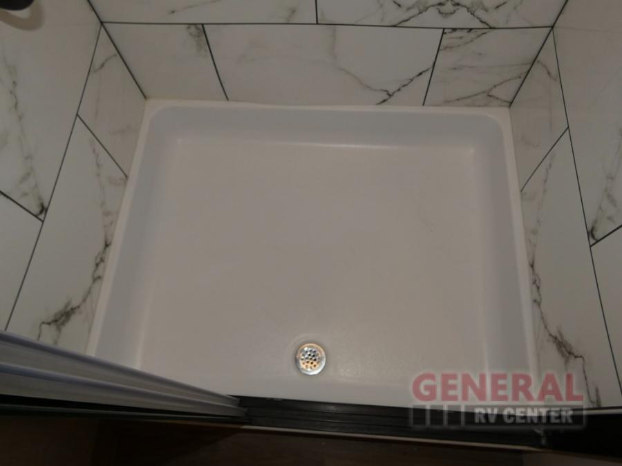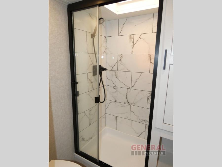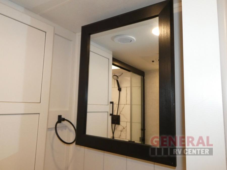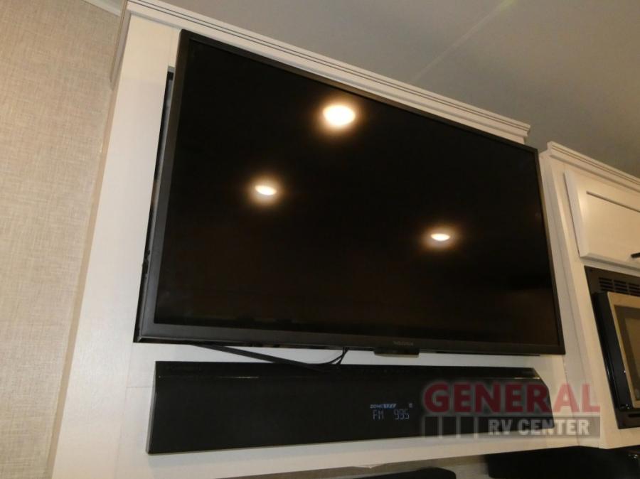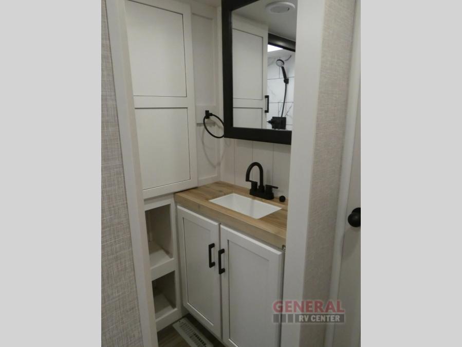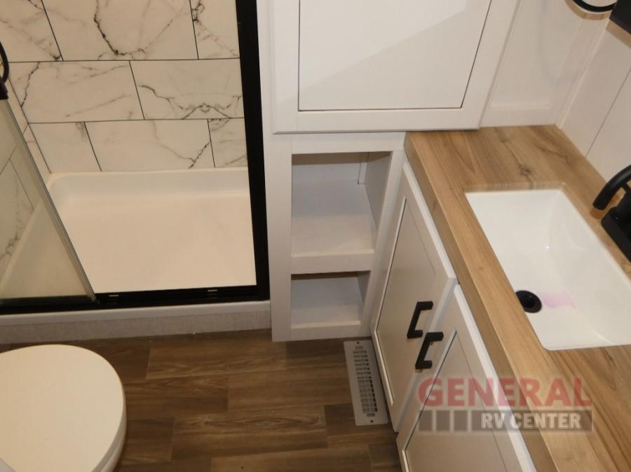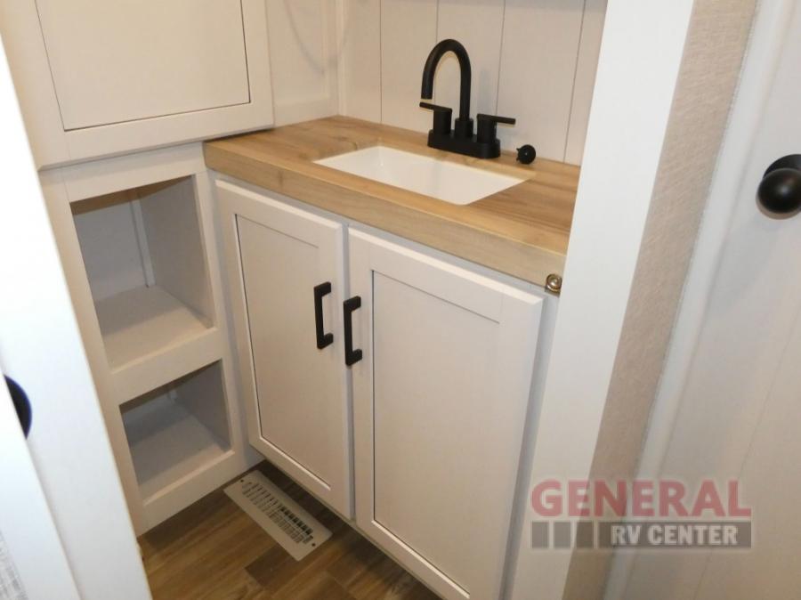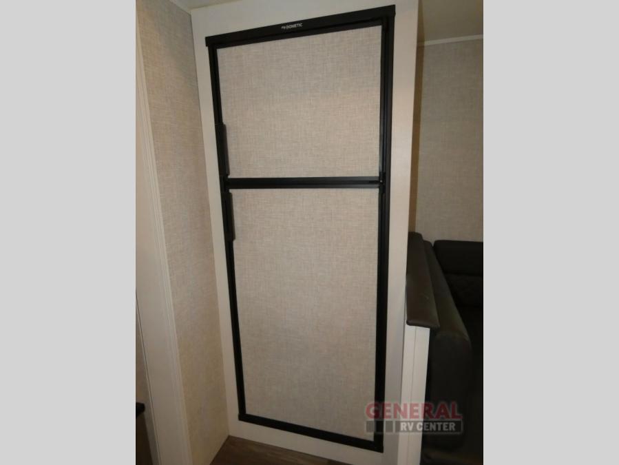If you're needing a fifth wheel with more sleeping space, this unit will be perfect for you! There are double-size bunks in the back with a wardrobe for your guests' things and TV prep if you want to add a TV here. The front private bedroom up front will have you feeling right at home with its queen bed and dual wardrobes, and any additional guests you have can sleep on the U-shaped dinette within the slide out. There is also a theater seat here where you can relax with a good book in the evenings. The Jayport with LP Quick Connect outside will let you add the optional griddle, and the 19' power awning will provide shade during the day!