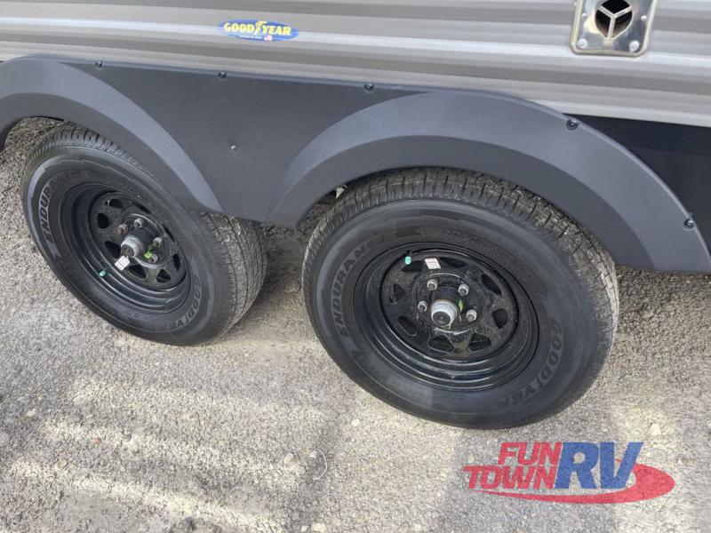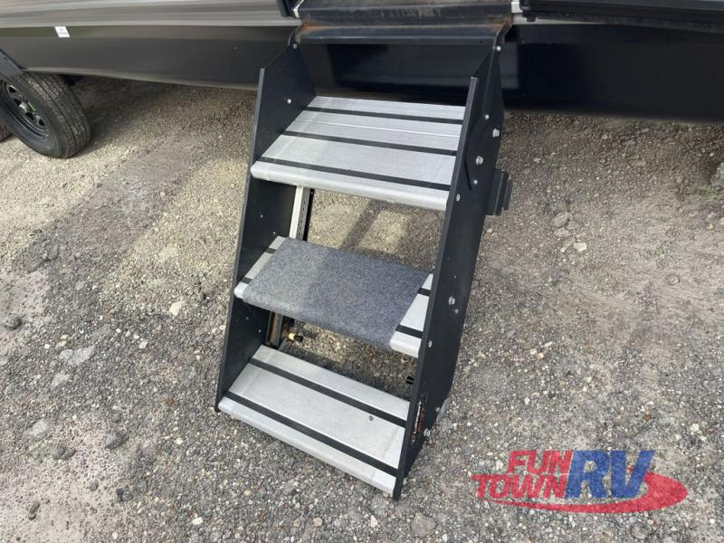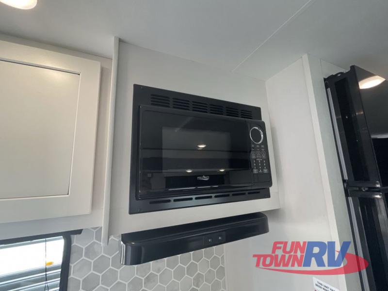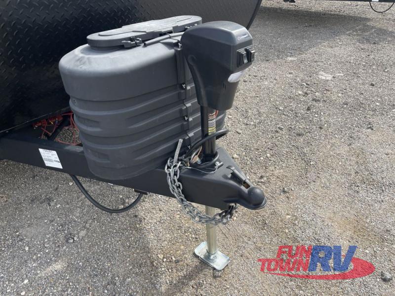 Loads of fun like hiking, fishing, and playing outdoor camping games are waiting for you to make that reservation, hitch up and head out! This trailer allows the owners to sleep in privacy behind the space saving sliding door on a 60" x 75" queen bed. And the kids or grandkids can sleep on the double size bunks in the rear next to the full bathroom including a tub/shower. They even have a wardrobe nearby for their things. The slide out jackknife sofa and U-shaped dinette offers more floor space, a place to relax and dine, plus you can play games at the dinette. The kitchen includes full amenities at your fingertips, plus you all can enjoy the entertainment center with TV when inside. When you want to be outdoors, relax under the 16' power awning after grabbing your camping chairs, and you can grab a beverage from the outside fridge!