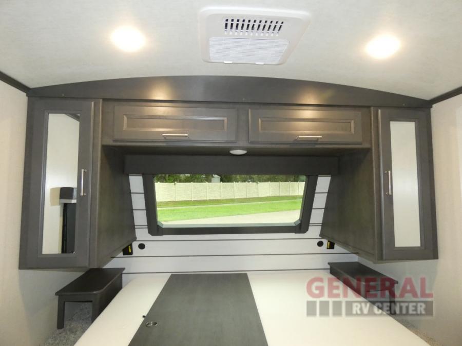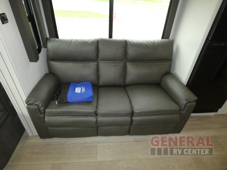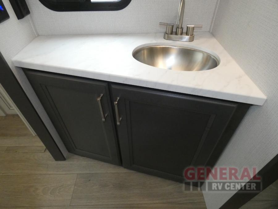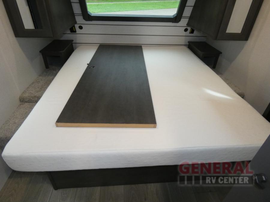 This Cougar Half-Ton travel trailer has an excellent dining area with its huge rear U-shaped dinette! Right next to the dinette is a large slide out that holds the 68" tri-fold sleeper sofa, 10.4 cu. ft. refrigerator, and a pantry. The kitchen has been excellently appointed with a Furrion range, seamless, pressed countertops, a stainless steel undermount sink, and a microwave, and you will be grateful that you can access both sides of the walk-through bathroom. The private bedroom is ultra convenient with its exterior entrance, king-size bed, and dual bedside drawers and dual nightstands.